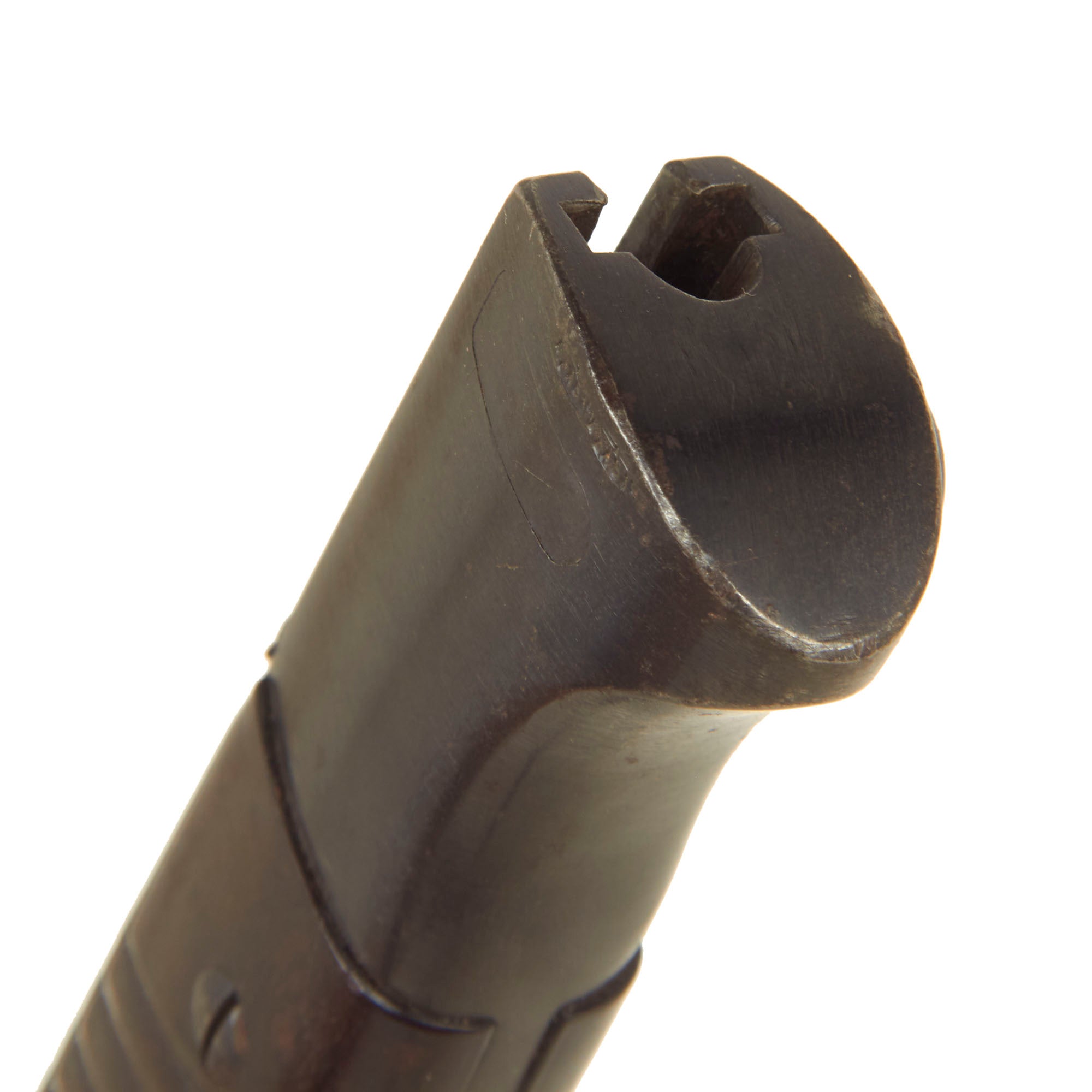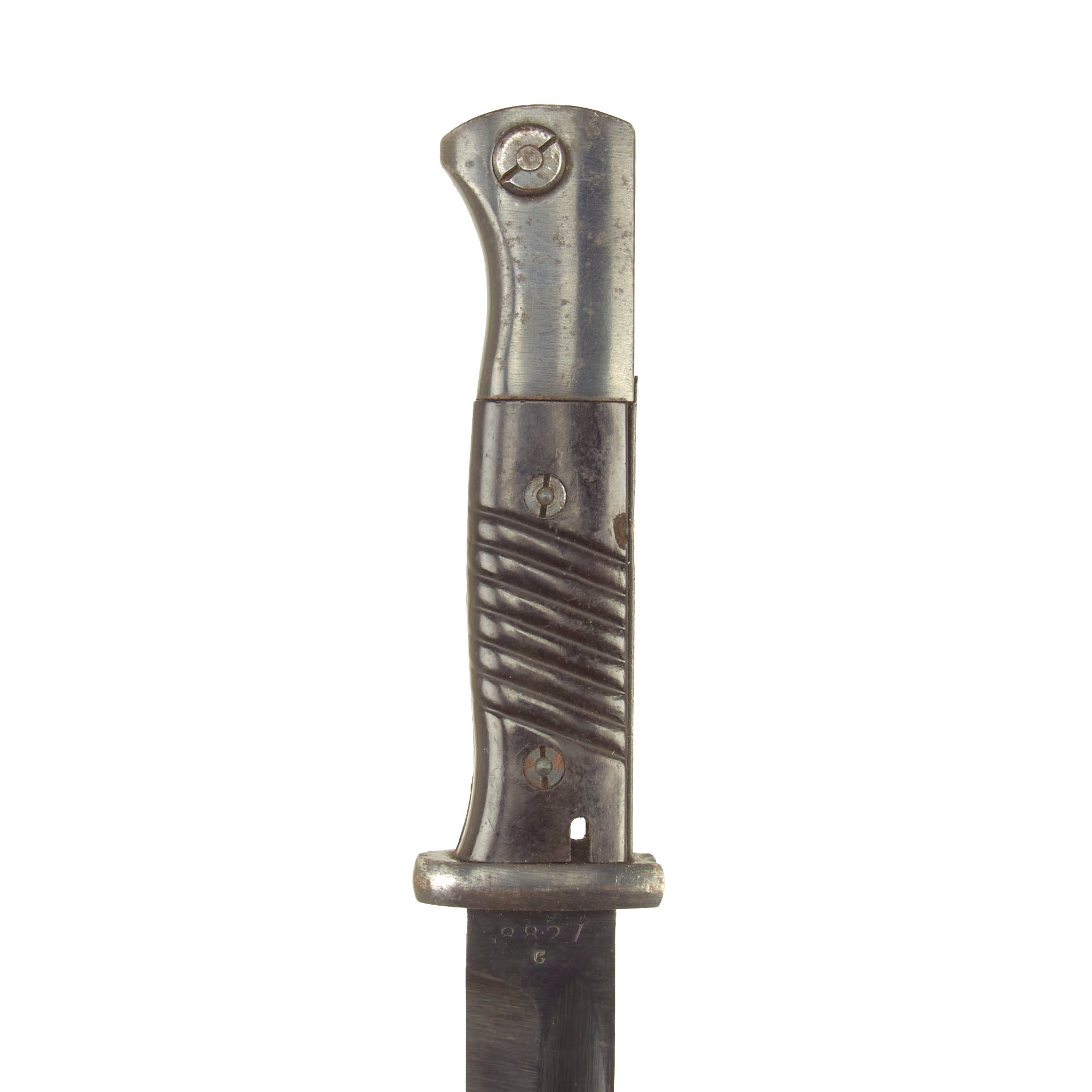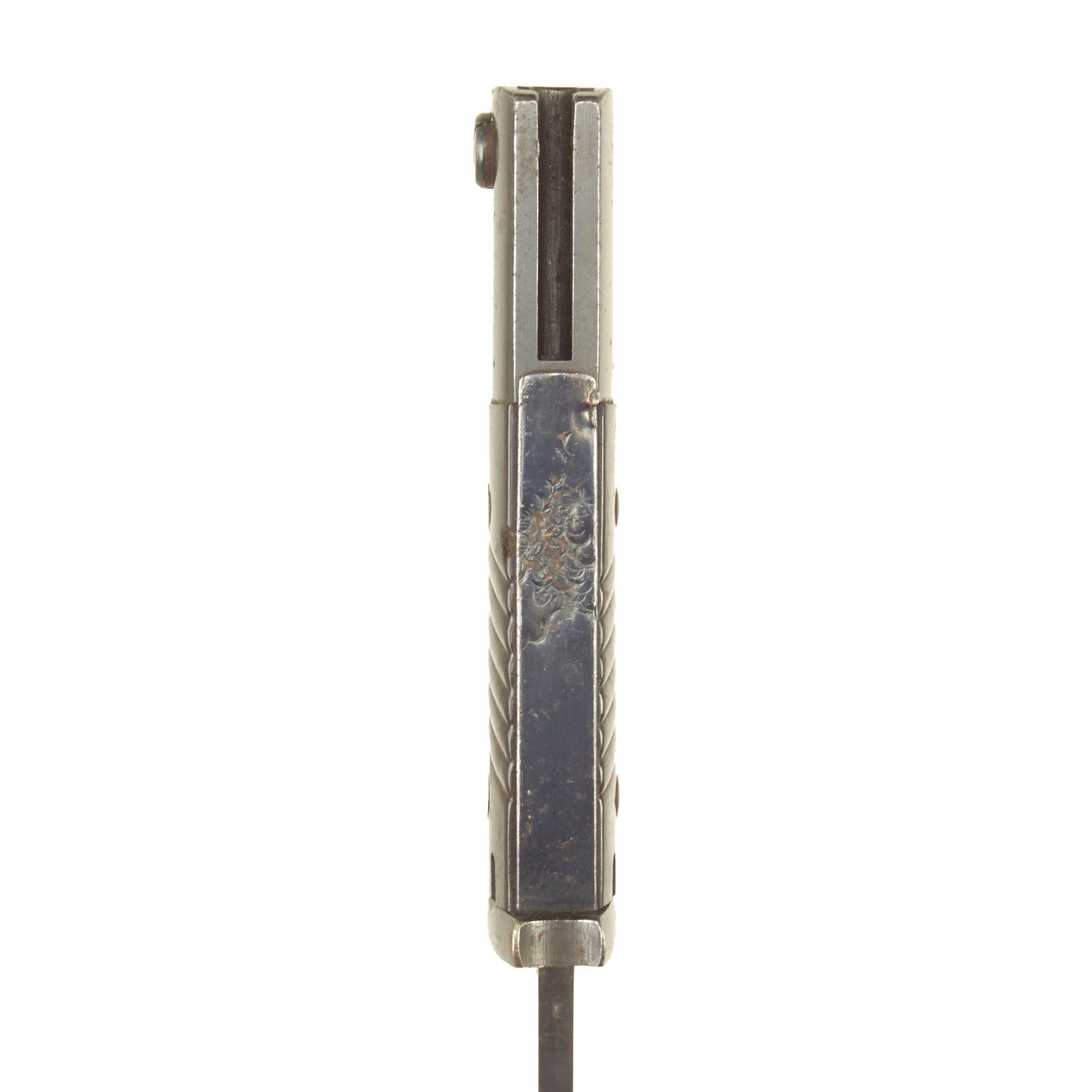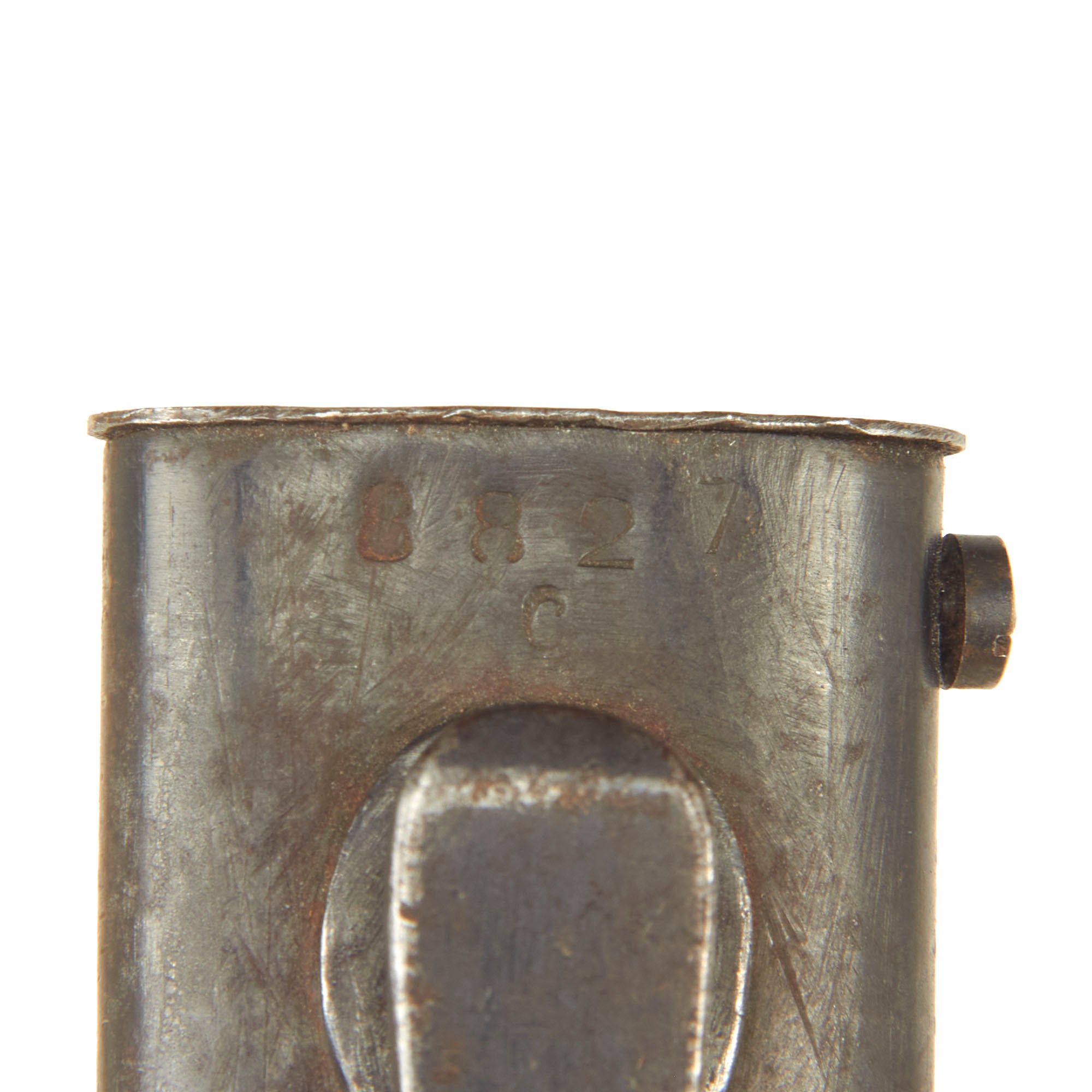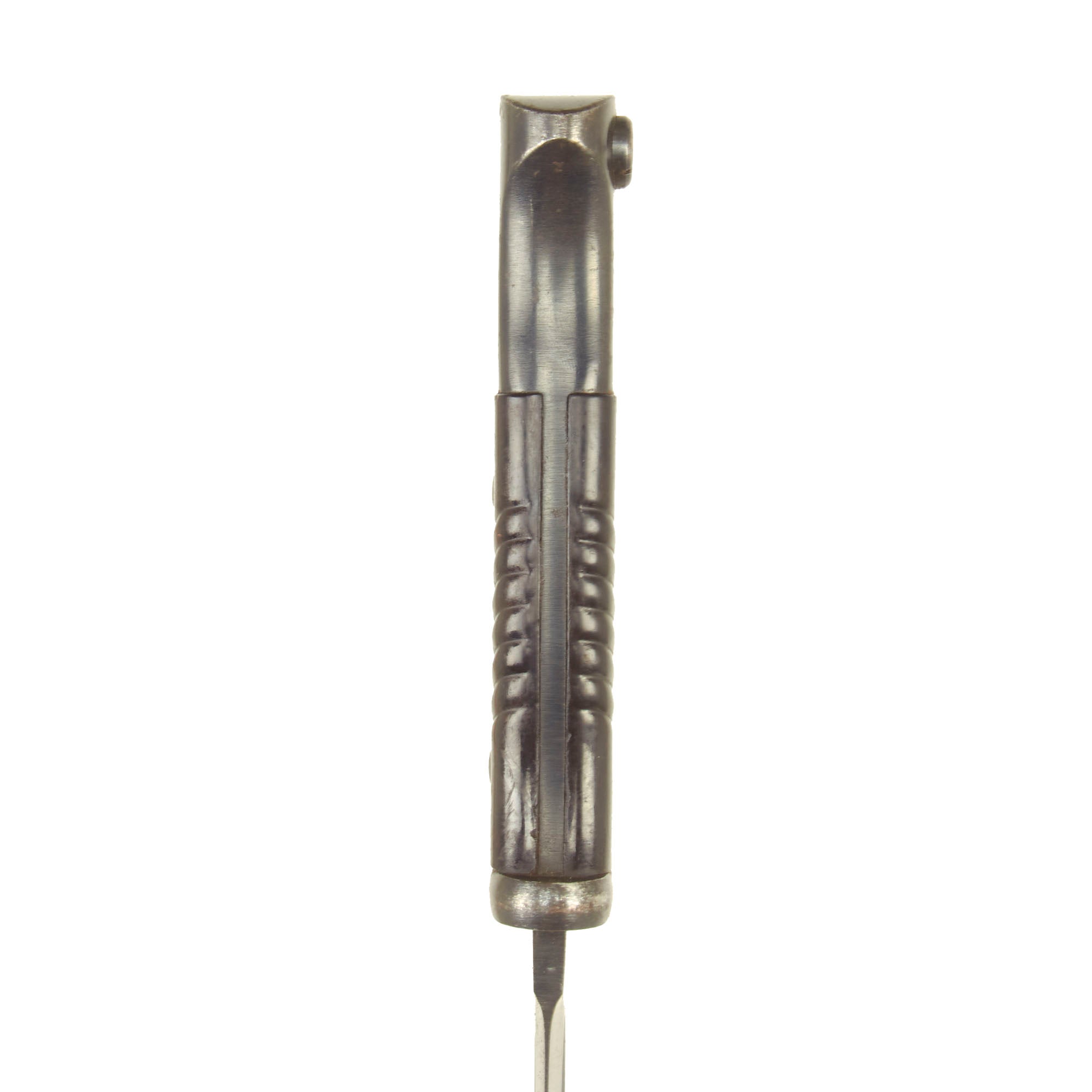 Condition of the bayonet is very good, with much of the original bluing on blade, bakelite grips intact and a working locking button. The blade on this example has definitely seen use in service, and shows sharpening and cleaning on the edge, which has removed the finish from much of the blade flat, while the fuller and ricasso still have the original bluing well retained. The bakelite grip scales are in good shape, with no chips, and just some light service wear. The bluing on the handle is worn on the edges from cleaning, with a bit of rust specking, and the scabbard is similar, showing much of the original finish, with some light rust in areas. The scabbard also has a wide flat dent on the reverse, but this does not interfere with sheathing the blade.