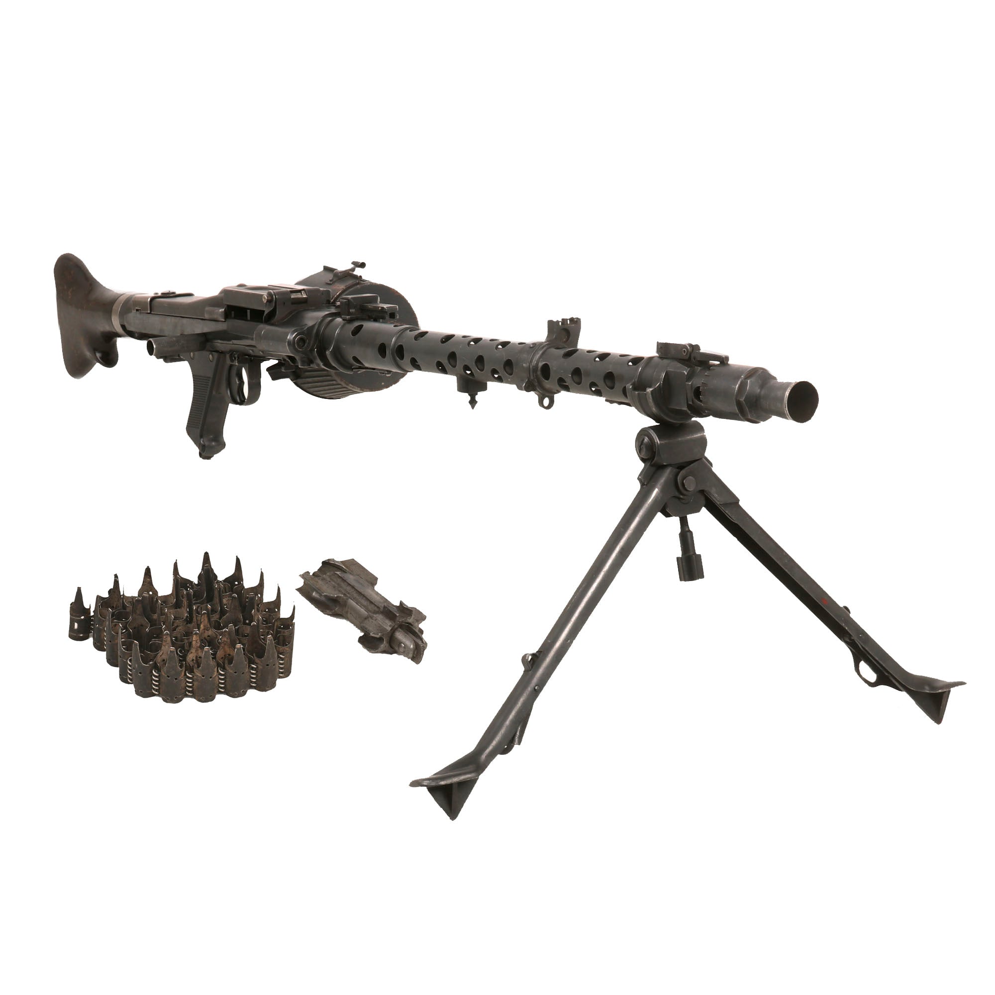 Original Item: Only One available. Constructed from a legally demilitarized (de-milled) parts set, this is a wonderful and rare German WWII MG 34 Display Machine Gun. It is built from all original parts on an original BATF compliant non-firing display receiver, making this a 100% legal display machine gun. This receiver was created by using portions of the original torch cut receiver, including the barrel bushing, combined with some new made steel portions. It has properly had a 25% section of the total length completely replaced entirely with solid steel bar stock. Meaning a 1/4 length section of the display receiver is solid steel, making this legal to own without a license of any kind. It has also had a portion of the original bolt included to complete the look, and the portion not used is included.