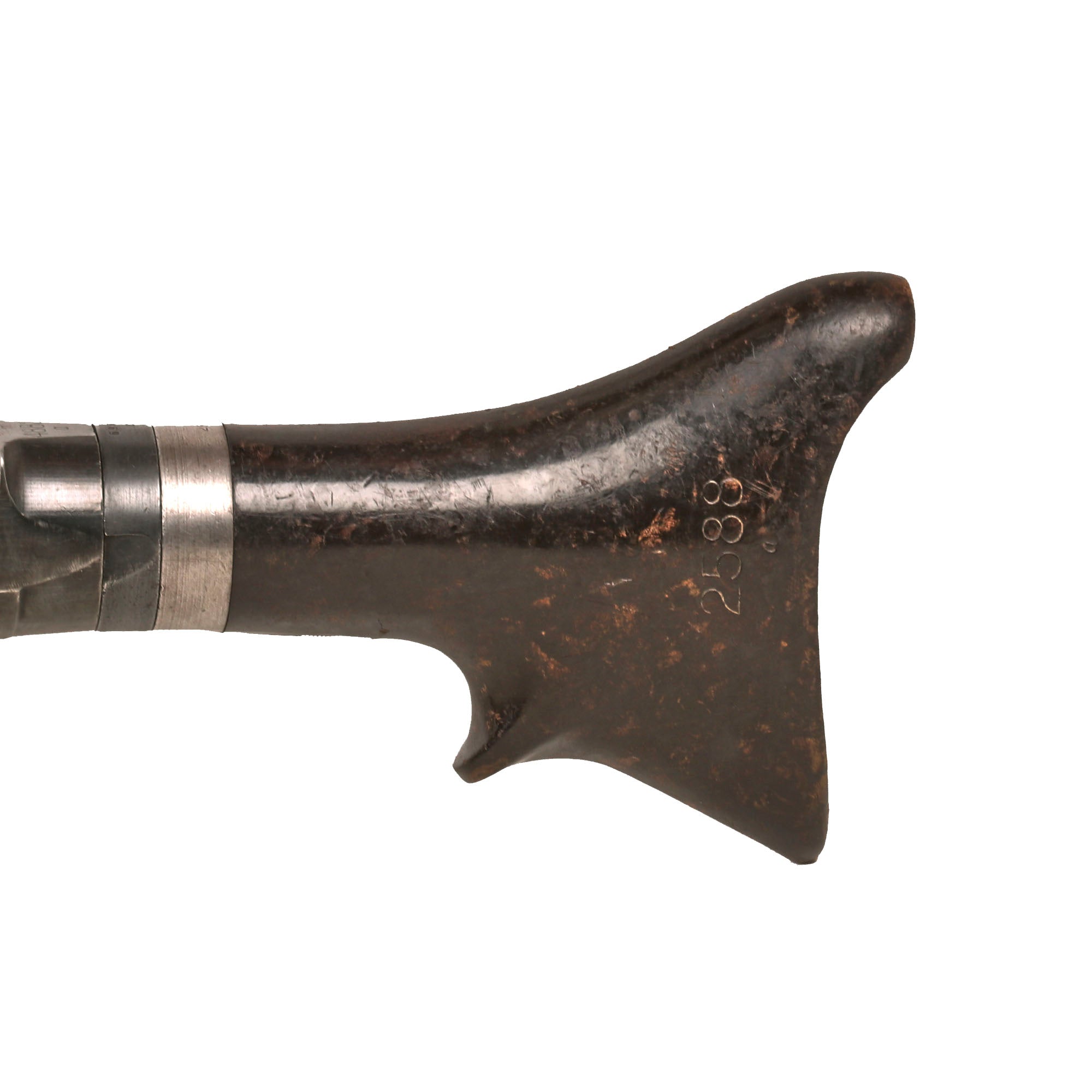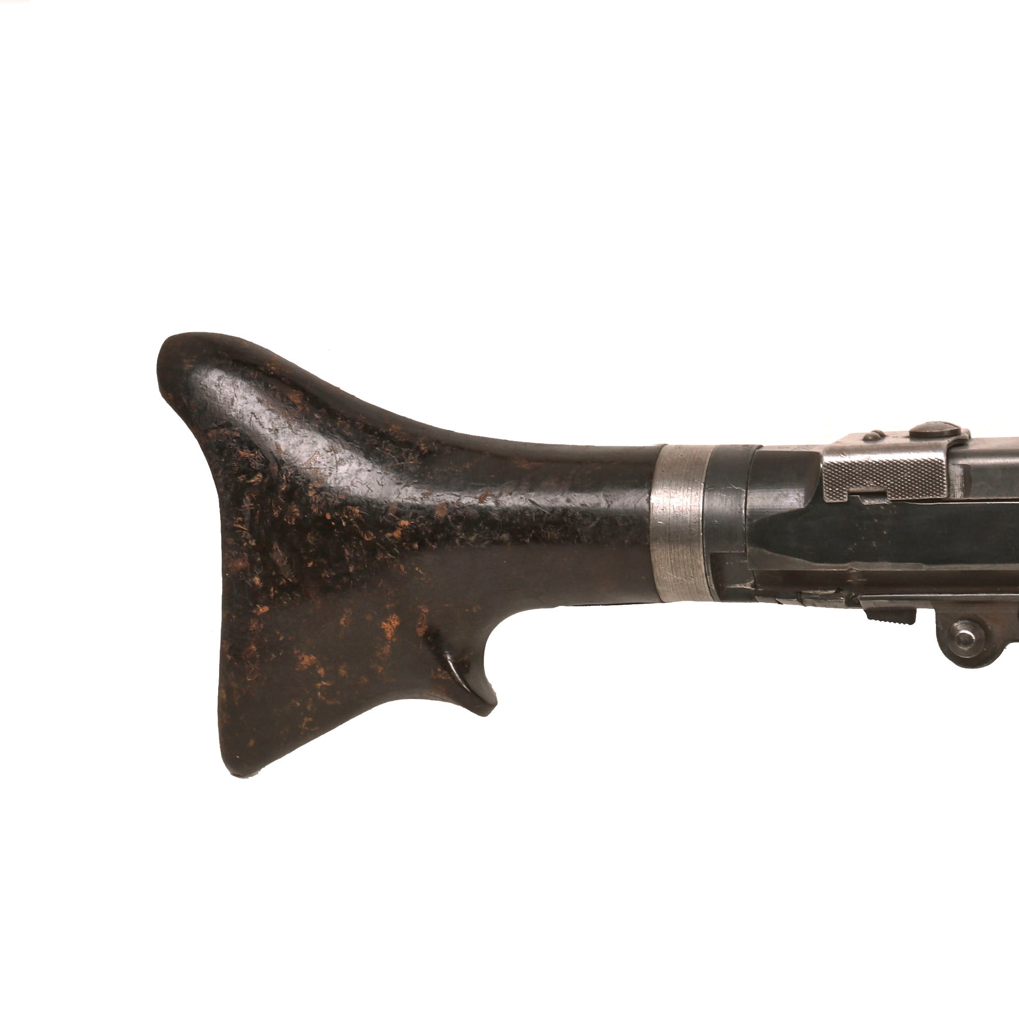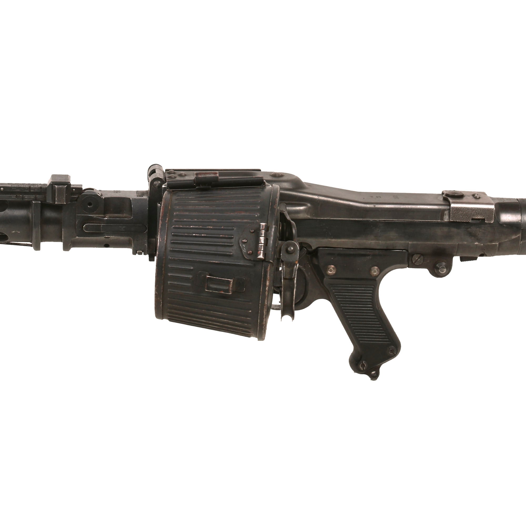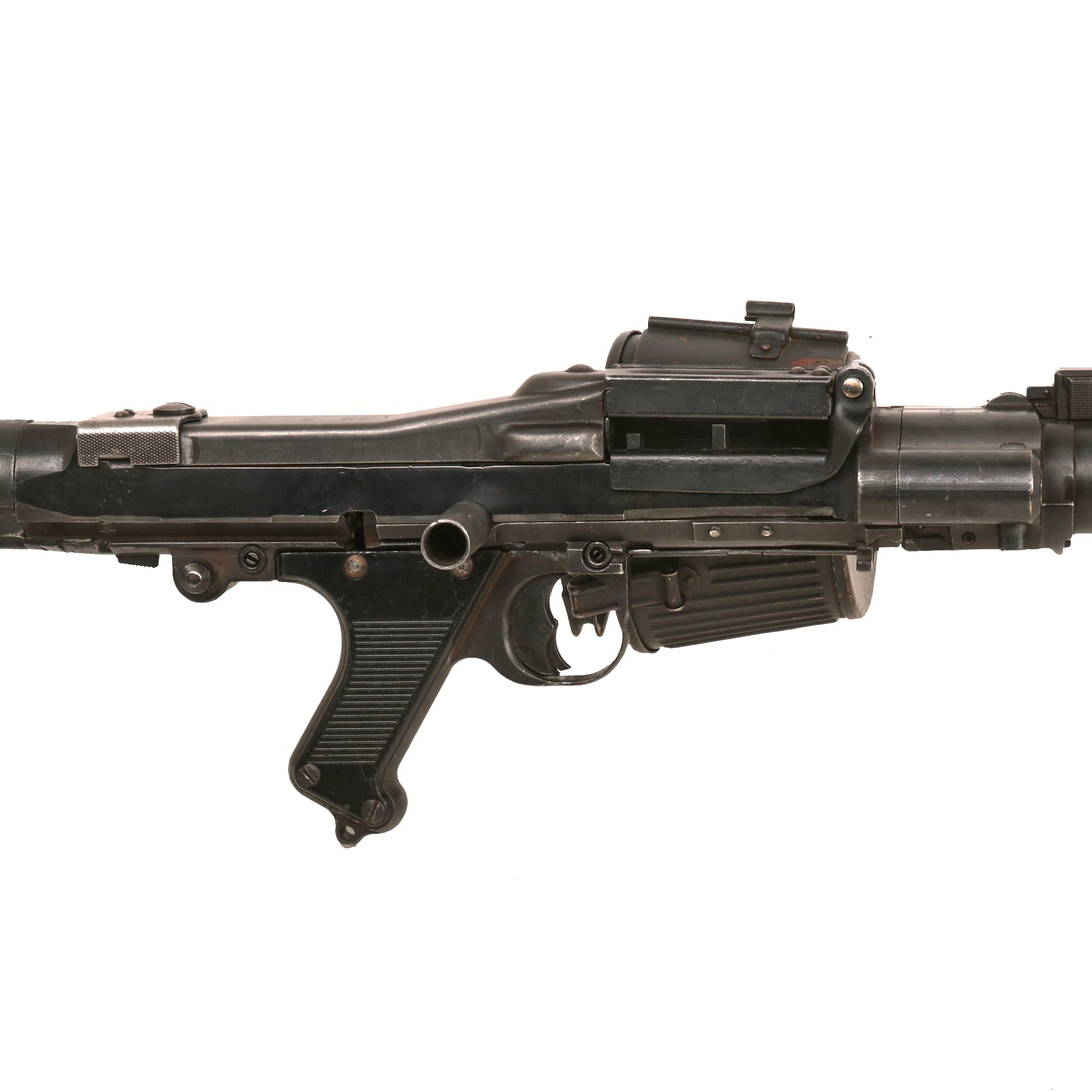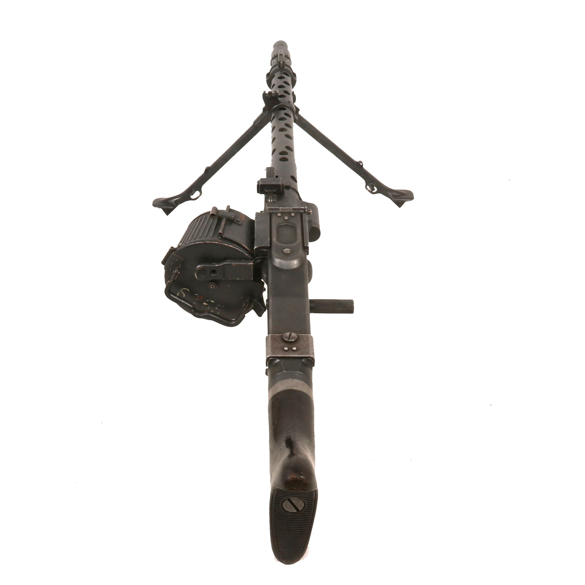The display gun really looks great, with a heavy blued finish overall, showing some wear from service. The front and rear sight still flip up and function correctly, and the bipod folds away and locks in correctly. The trigger is present, and still works great with intact internal springs and safety selector. The belt drum fits well, and locks into place securely.. The rear dark brown bakelite butt stock is in great shape, showing only very minor wear, and still detaches easily from the dummy receiver. It shows some scratches and wear, but no major cracks, chips, or other damage, and is marked with serial number 2588 / a.