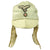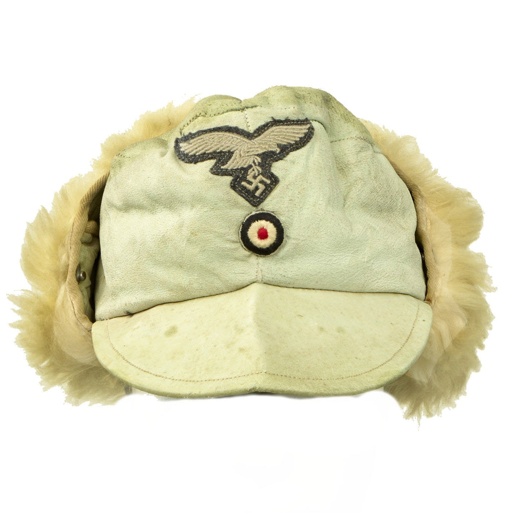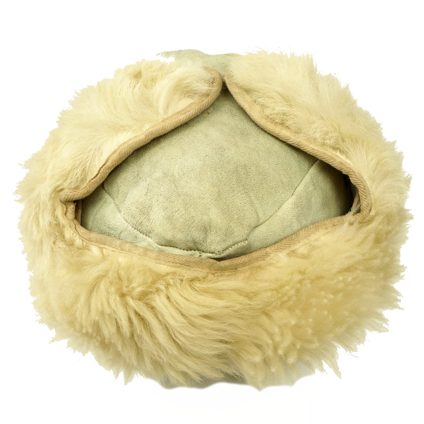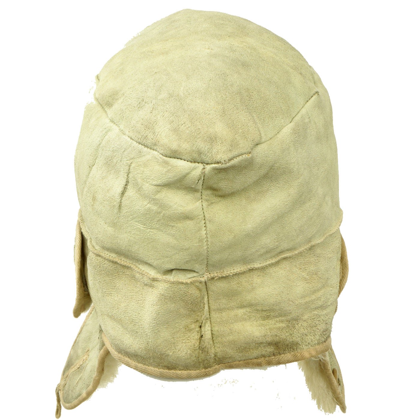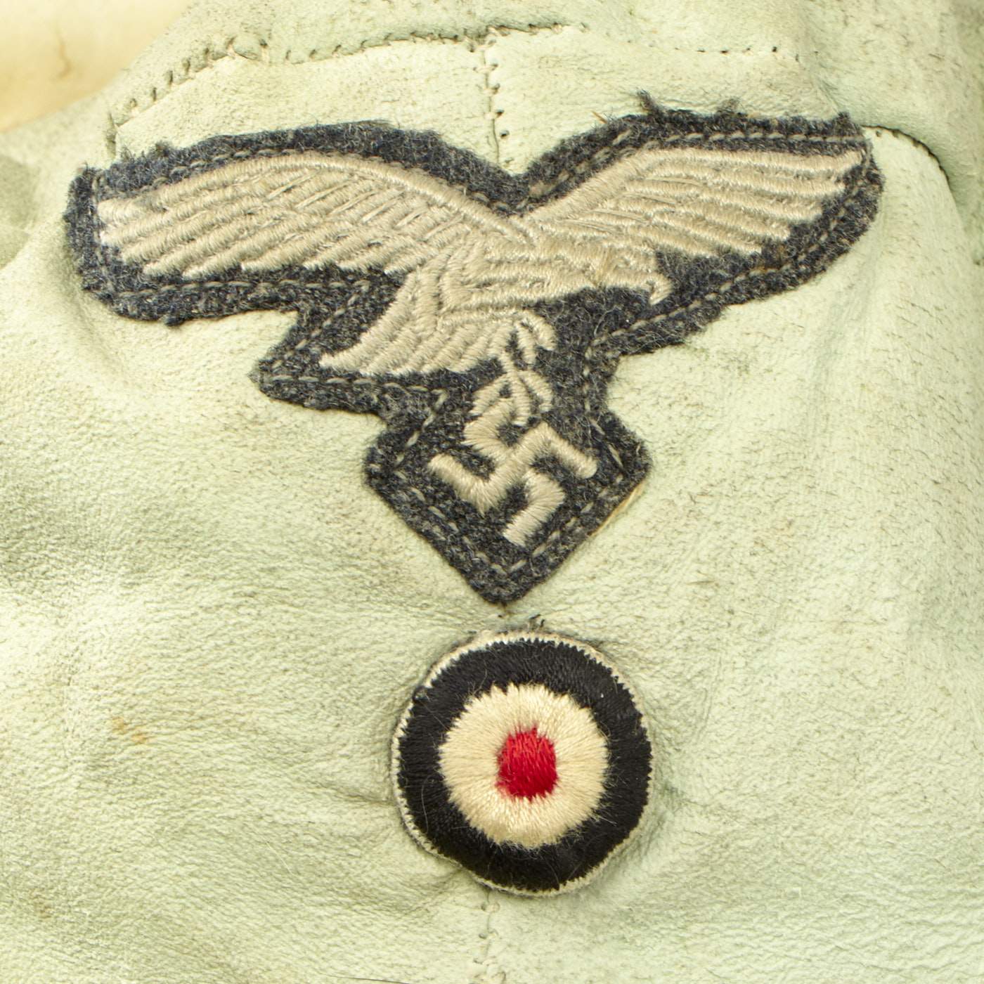 This example is excellent quality, multi-panel, patch work, whitened sheep skin construction winter cap with the natural hide to the exterior and white sheep's wool to the interior. The front center of the cap has a second pattern, machine embroidered, Luftwaffe eagle in light grey threads on a cut-out Luftwaffe blue/grey wool base with a separate machine embroidered, padded national tri-color cockade situated just below eagle.