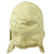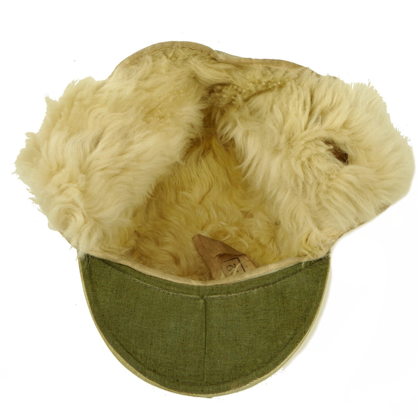 The cap features fold down side and back panels with the panels held in position at the top of the cap by a thread loop and a corresponding button. When the side and back panels are in the upright position the sheep's wool is visible to the exterior. The back and side panels were designed to be folded down to protect the wearer's ears and neck and the panels could be secured with the fabric loop and button closed under the wearer's chin as required. The fold down side panels are connected by a button when worn and by a button with stitched twine when worn above the head. This early style is rarely encountered.