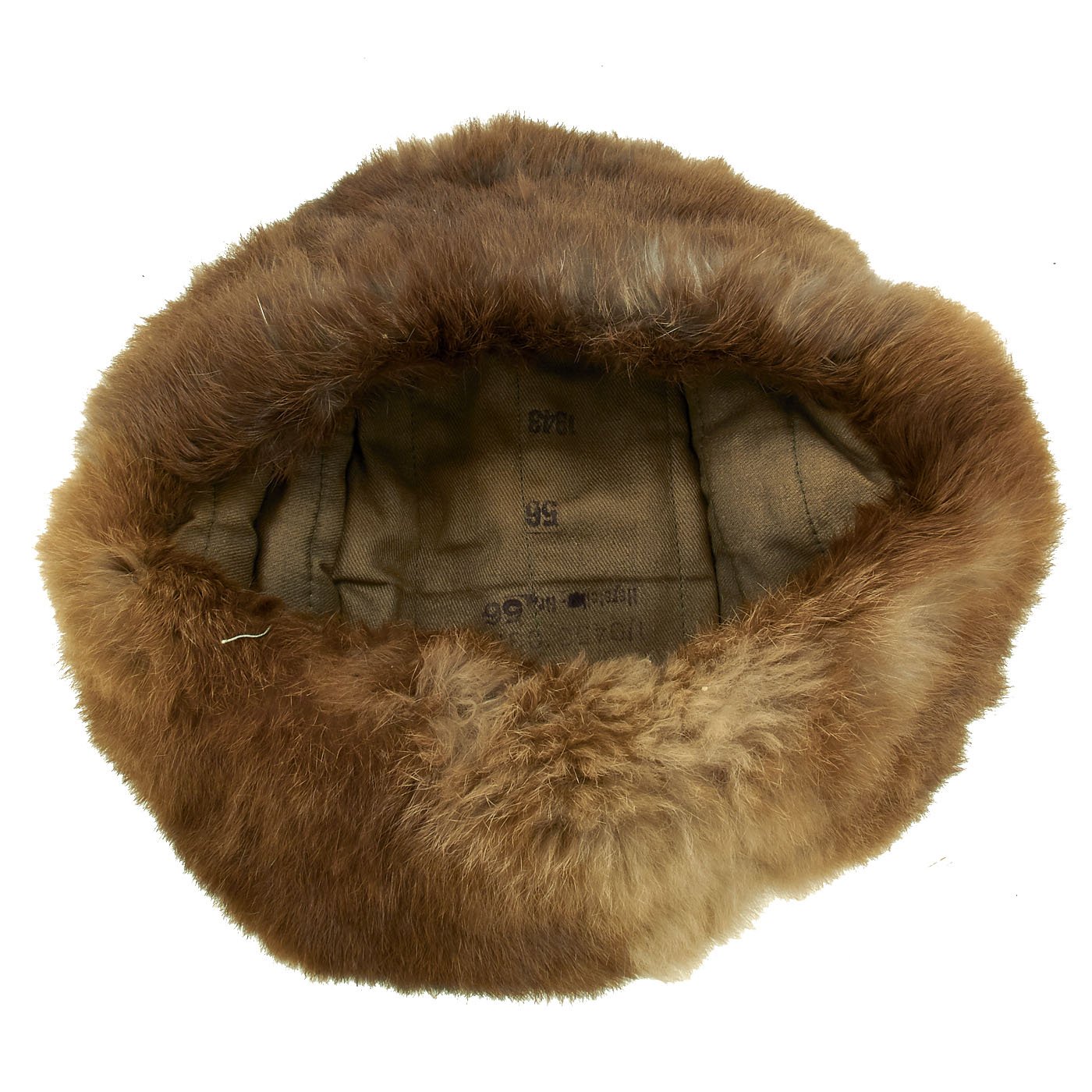 This fine example is offered in very good condition with 99% of the fur intact, interior lining is clean and undamaged. Unfortunately the stitching that secures the liner to the outer shell has pulled out about 40% of the way around the hat, but this looks to be more from a stitching run than damage. It could easily be repaired by some skilled sewing. The top button that holds the flaps in their "up" position is intact, as are the ties that allow them to be secured in the "down" position.