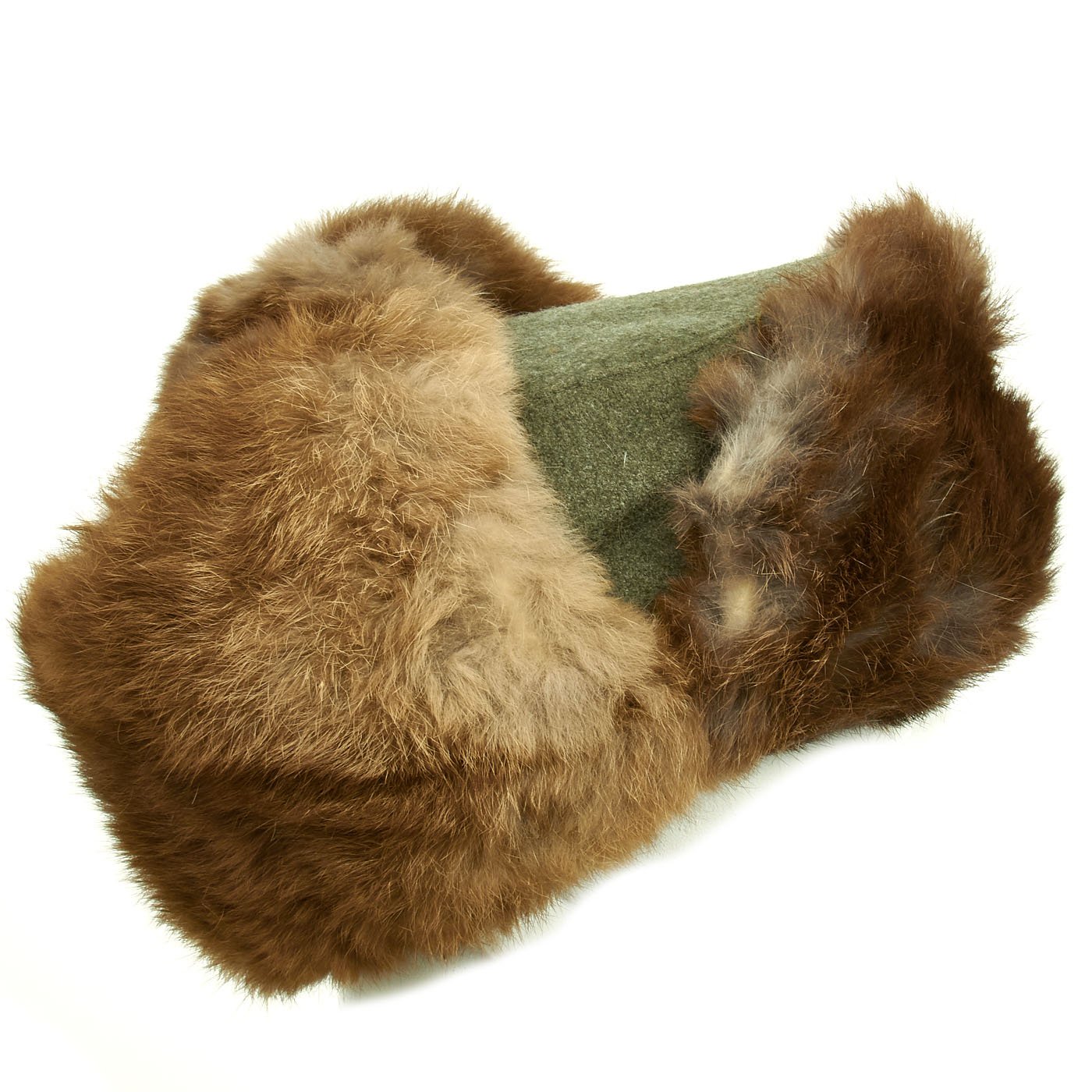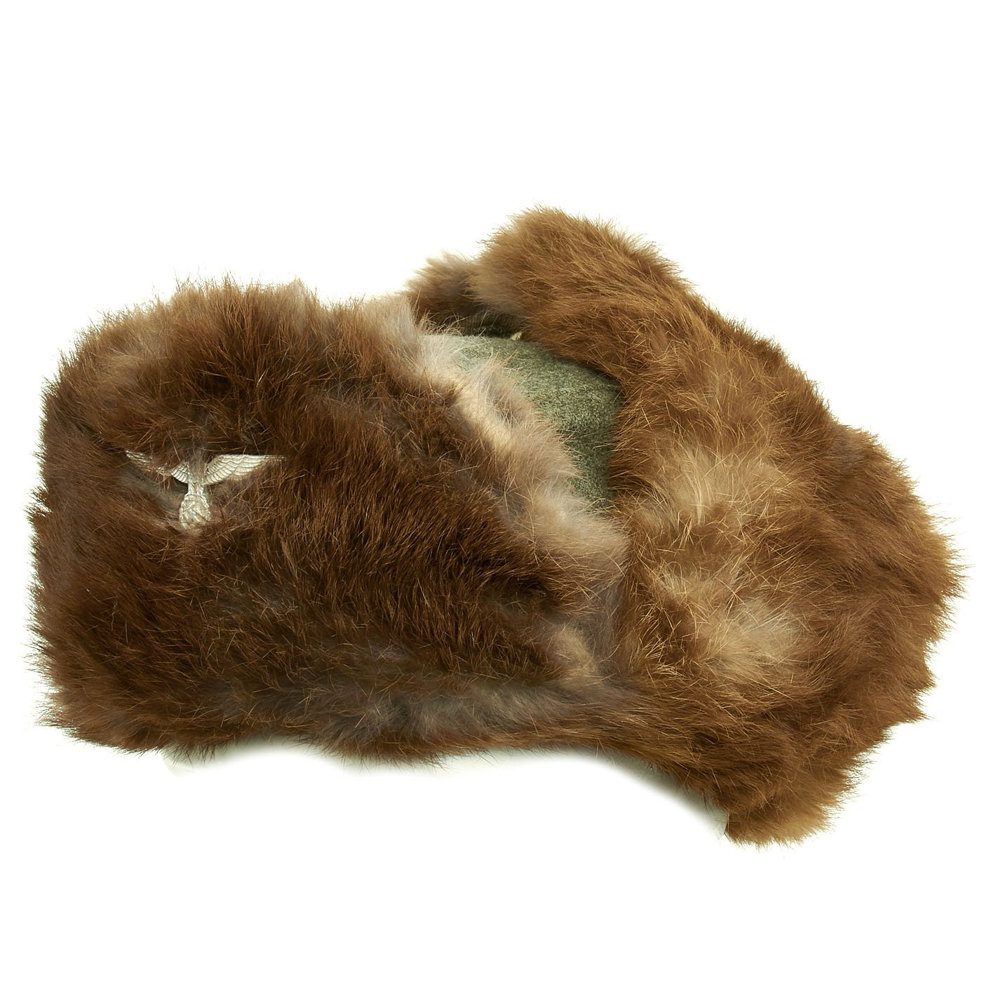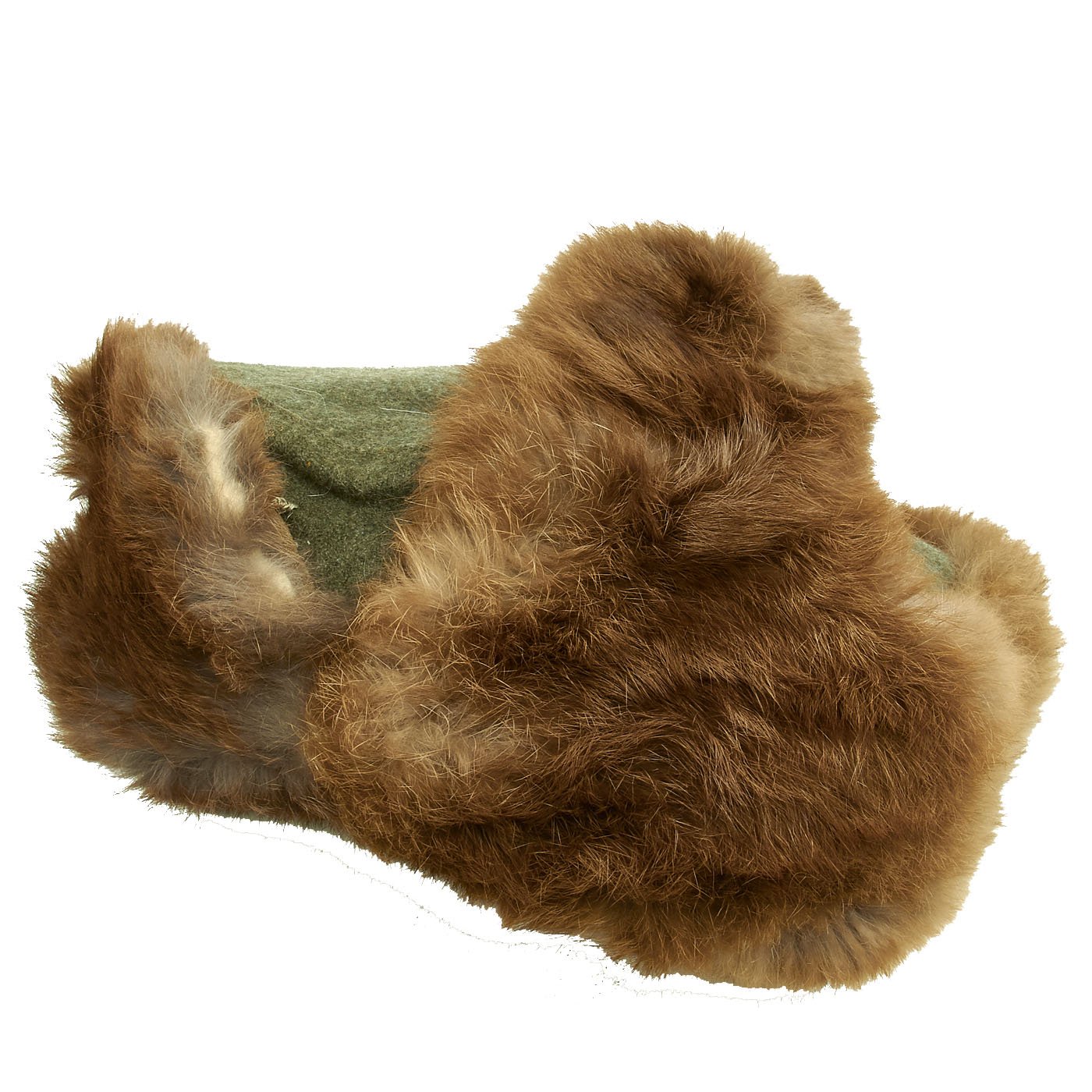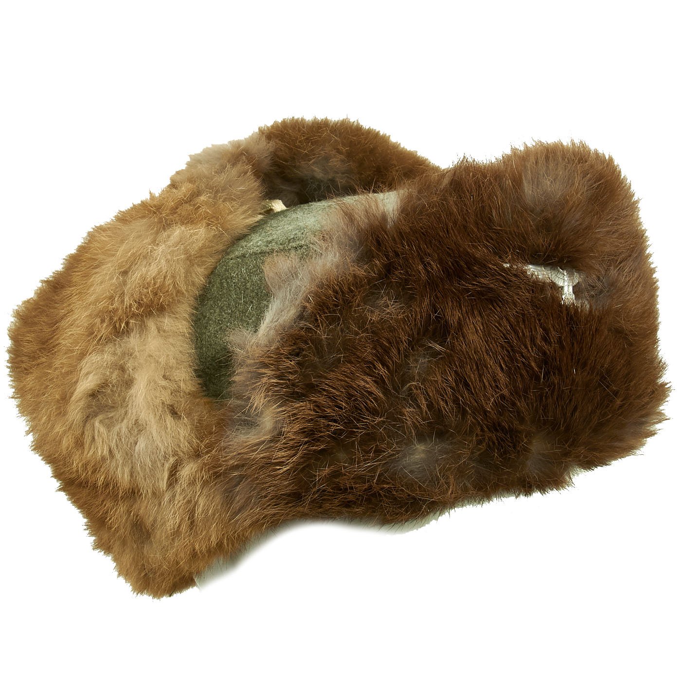 Original Item: Only One Available. After the catastrophic winter of 1941-42 on the Eastern Front, the German military rapidly designed improved cold weather clothing. By the Fall of 1942, a variety of fur lined caps had been introduced. There were no standardized "model numbers", but this version is a commonly encountered pattern. It has a fieldgray wool body, which is lined with rayon fabric, and a visor and fold down ear flaps backed with rabbit fur. The flaps are held in the "up" (open) position by a single button (replacement button). The flaps can be tied under the wearer's chin via cloth ties.