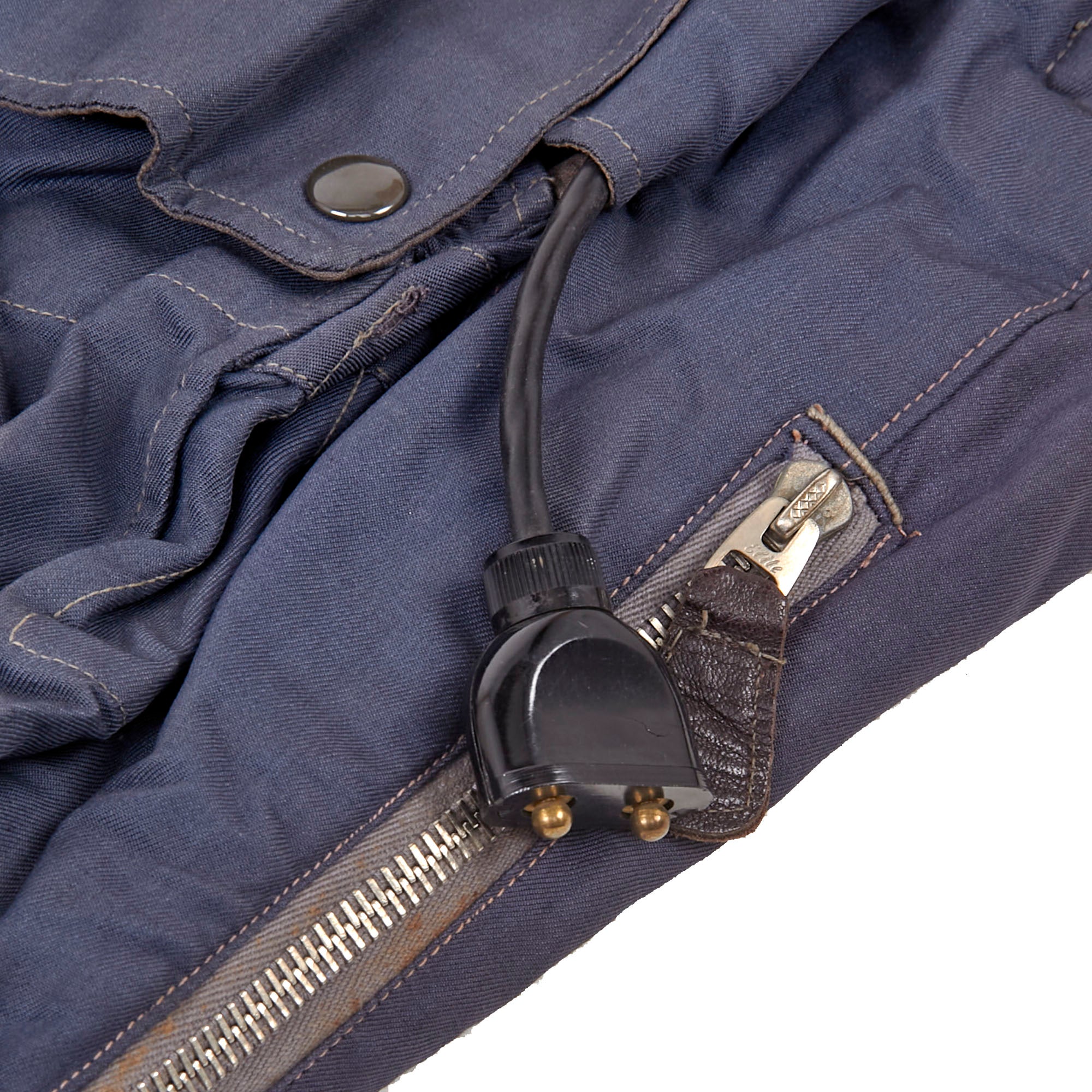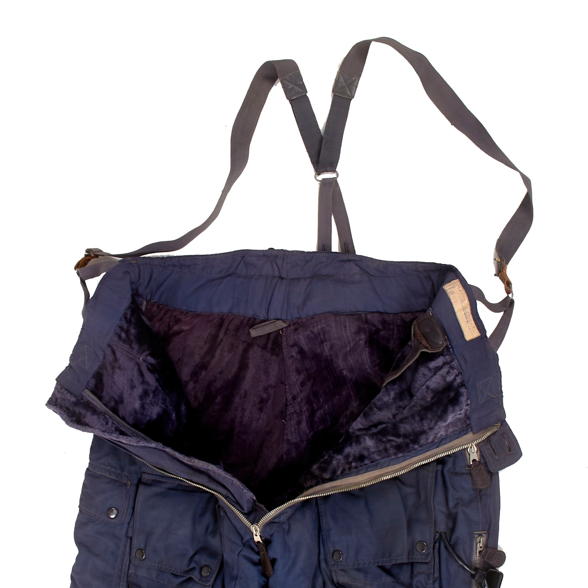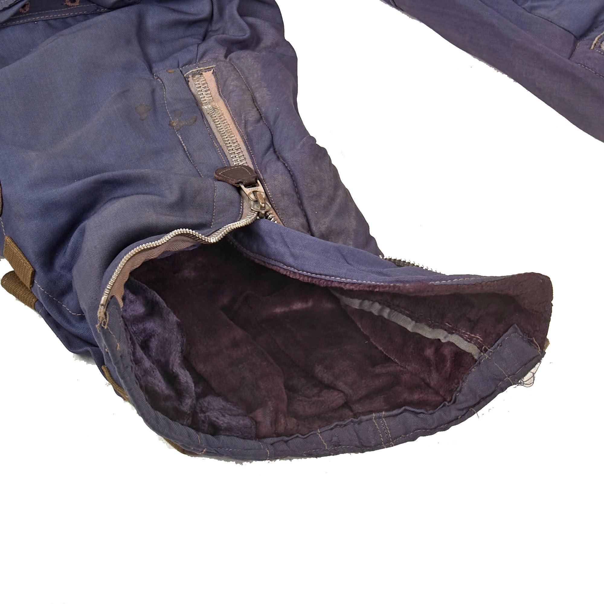 This is a very good light used condition pair of heavy winter flight trousers, constructed from a blue twill fabric shell, with purple and blue velvet plush type material lining. This extends all the way to the bottoms of the legs, and really looks great. It looks like the rear of the trousers is lined with purple, while the front is blue. It features a plug in wired heating system, which still looks to be intact, having a wire connector coming out of the left outer pocket, which would connect to the electronic system of the aircraft. There is also an interior connector that would probably connect to the jacket portion of the set. There are also additional connectors at the ends of the legs for the use of heated boots.