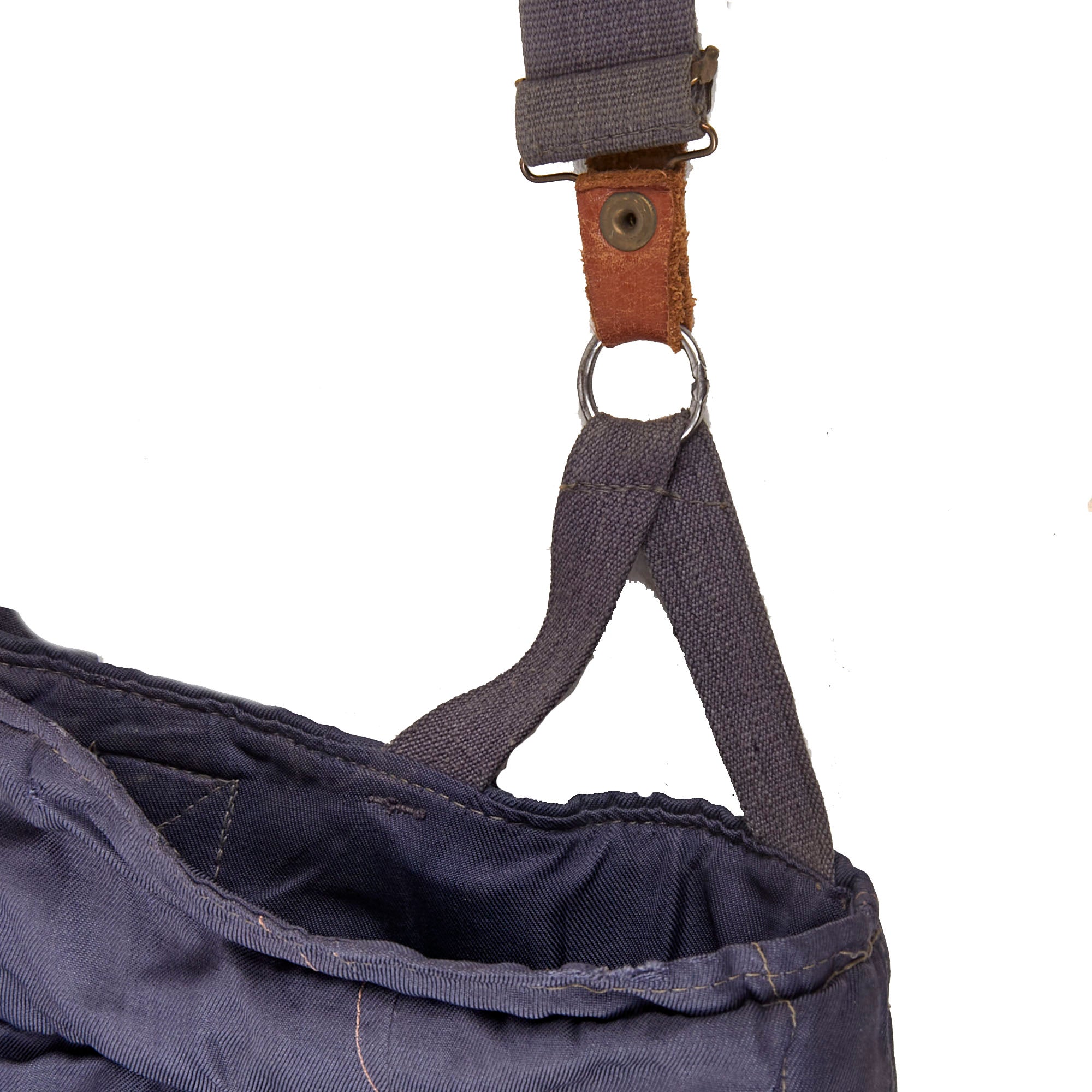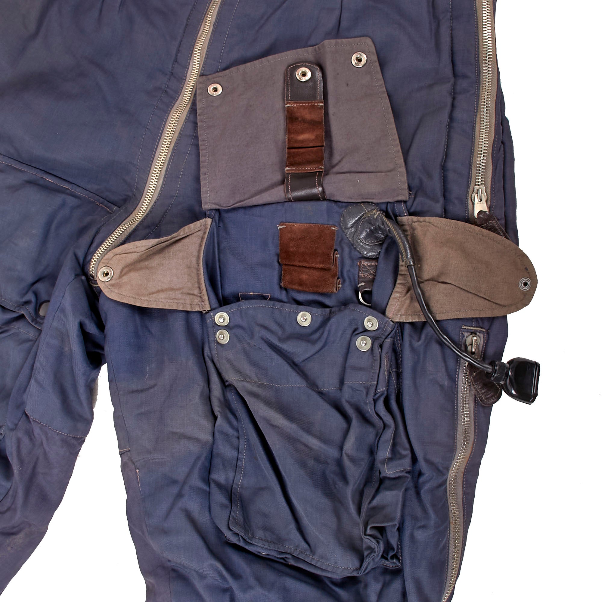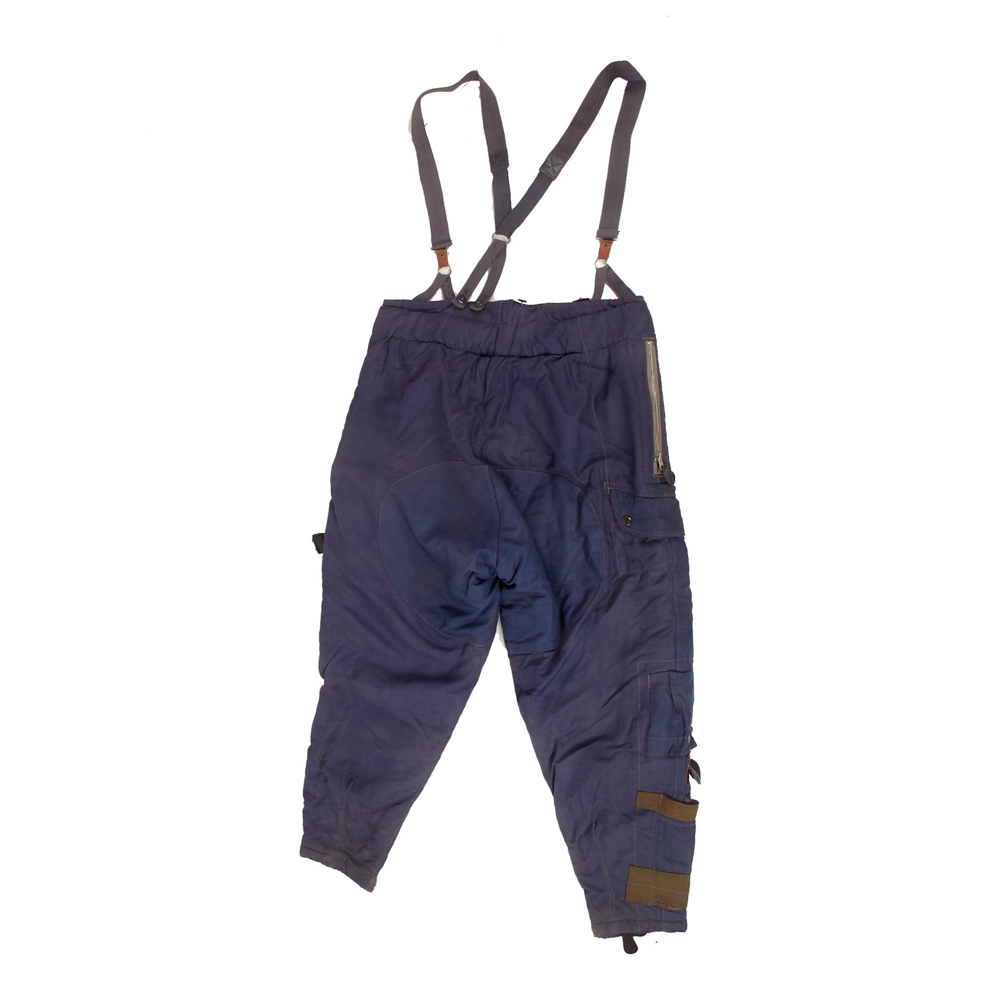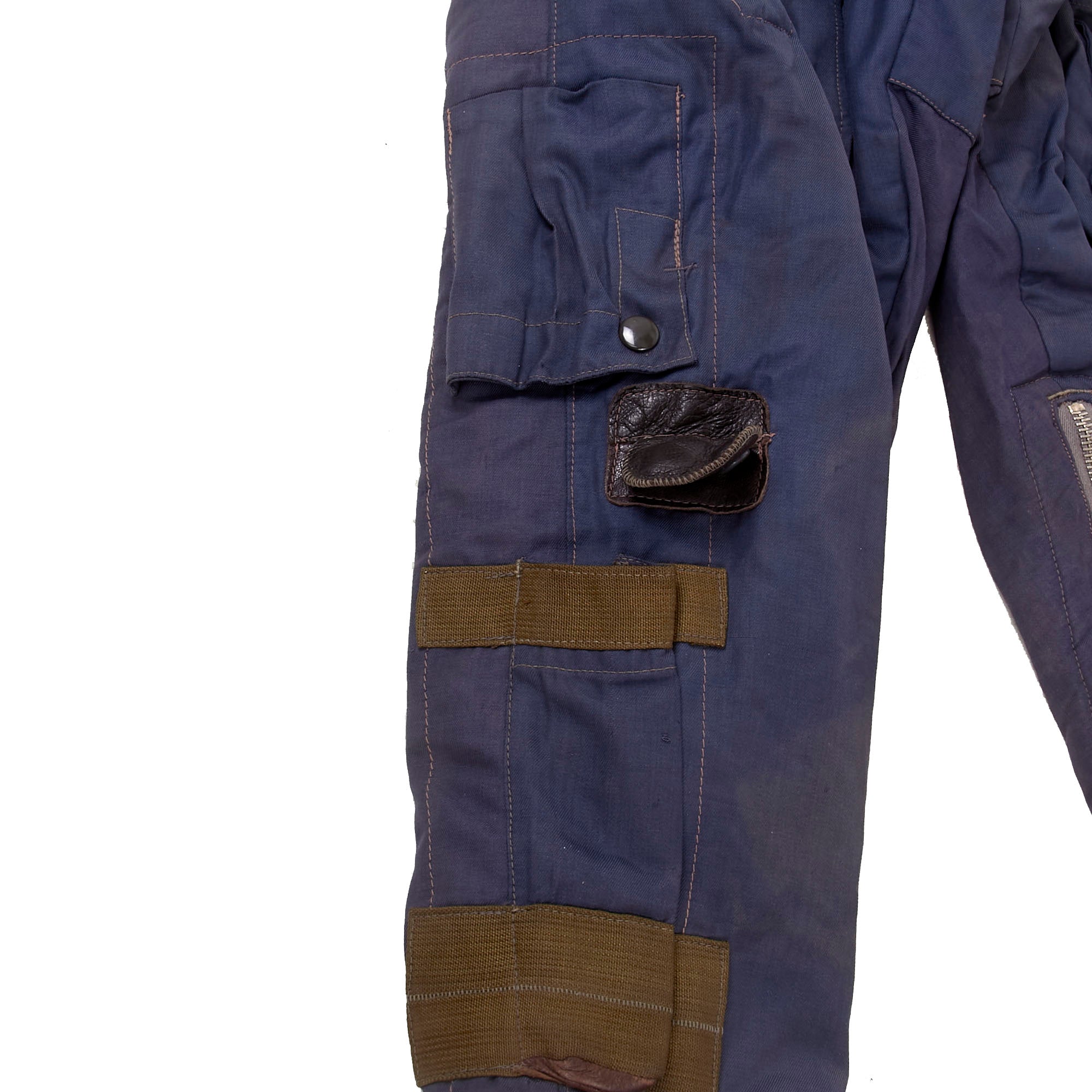 This is a very good light used condition pair of heavy winter flight trousers, constructed from a blue twill fabric shell, with purple and blue velvet plush type material lining. This extends all the way to the bottoms of the legs, and really looks great. It looks like the rear of the trousers is lined with purple, while the front is blue. It features a plug in wired heating system, which still looks to be intact, having a wire connector coming out of the left outer pocket, which would connect to the electronic system of the aircraft. There is also an interior connector that would probably connect to the jacket portion of the set. There are also additional connectors at the ends of the legs for the use of heated boots.