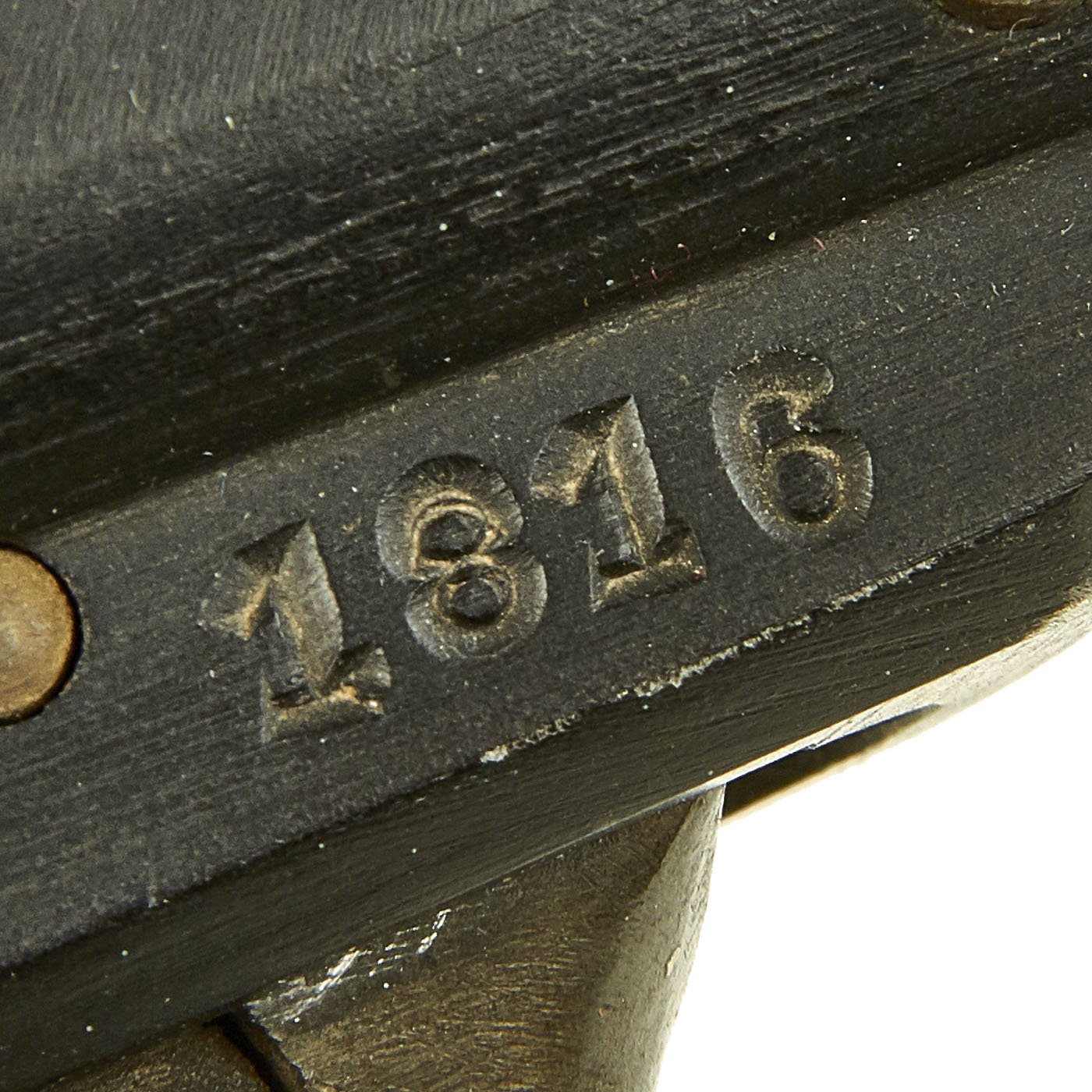 The signal pistol is marked with the serial number 1816 on the forward lower portion of the right hand side of the frame, and the Luftwaffe contract number Ln24483 is present on the opposite side of the frame. The gun has a frame mounted safety with Fire and Safe markings.