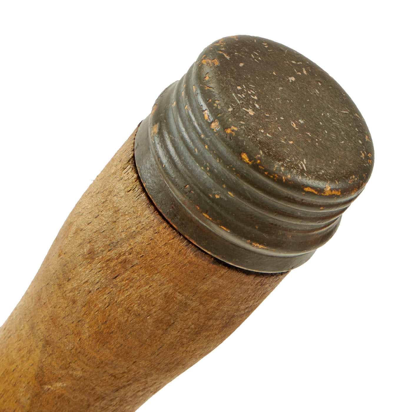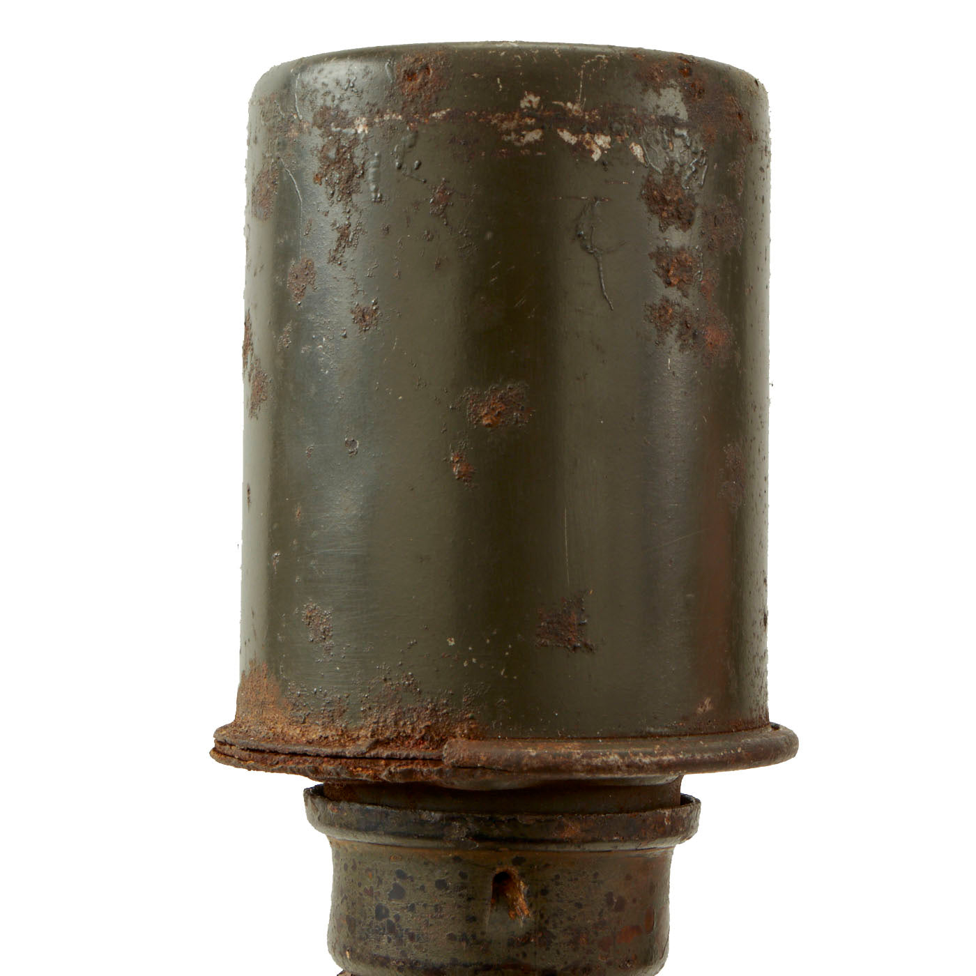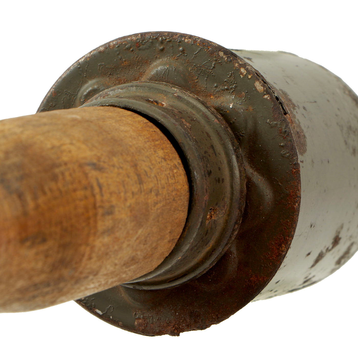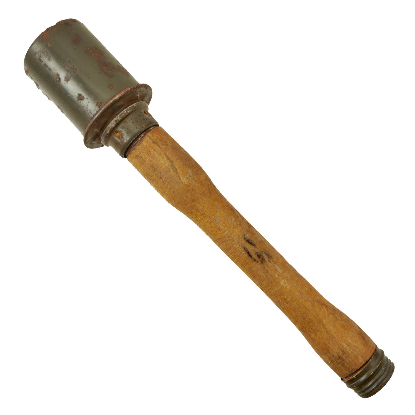 Original Item: Only One Available. This is an extremely rare M1924, M24, or "Stielhandgranate (stalk hand grenade) 24" German Stick Grenade, often called a "potato masher". This example, acquired from the family of a WWII veteran, has been demilitarized according to specifications by the BATF. It still retains its original paint, and the original markings can be seen on the warhead & handle of the grenade.