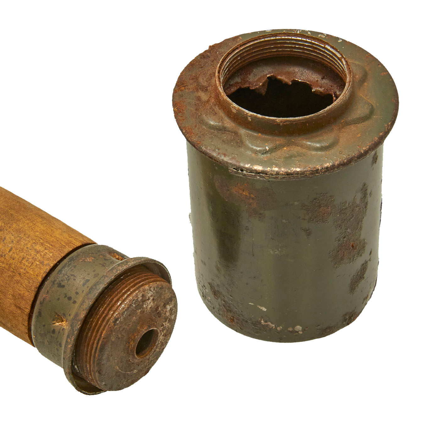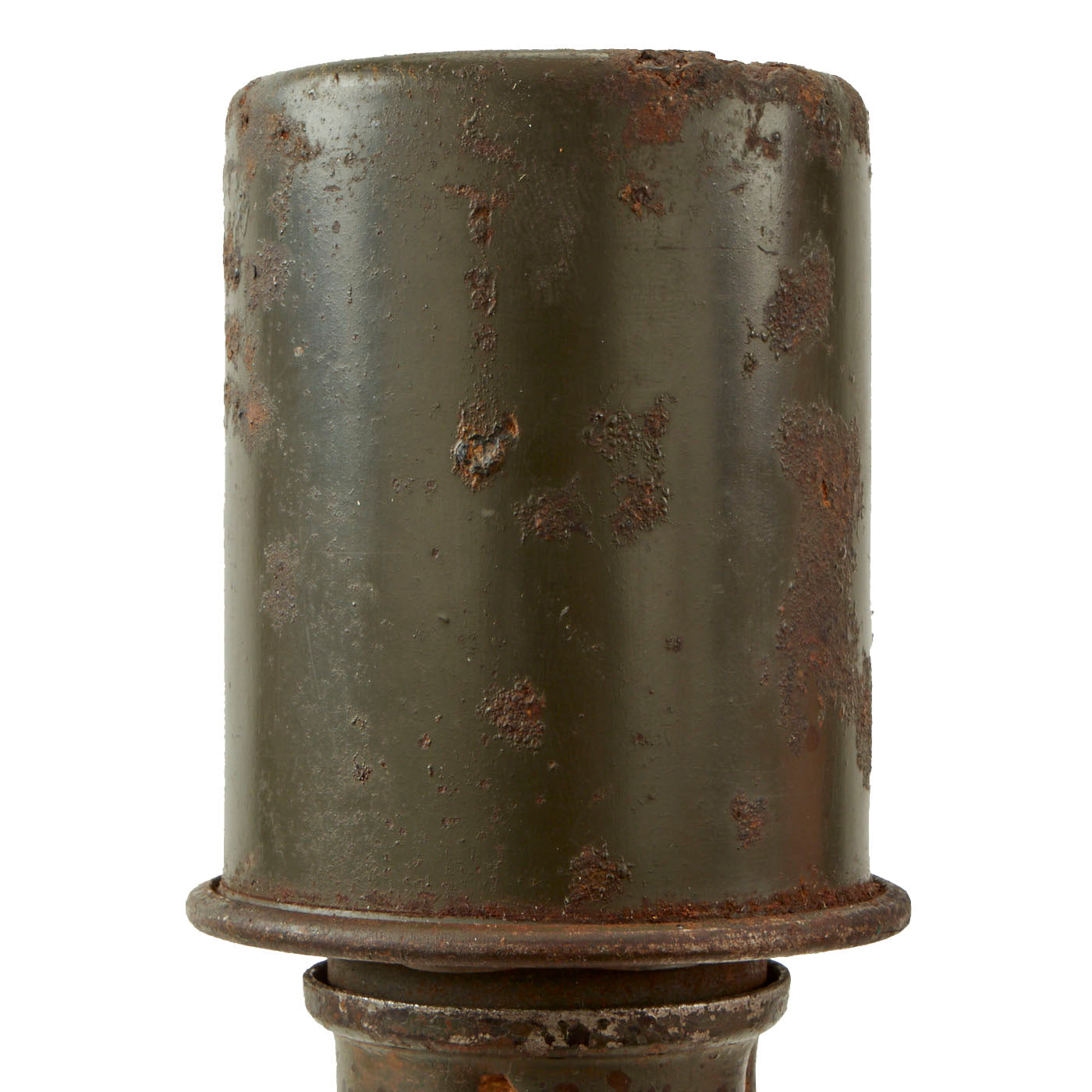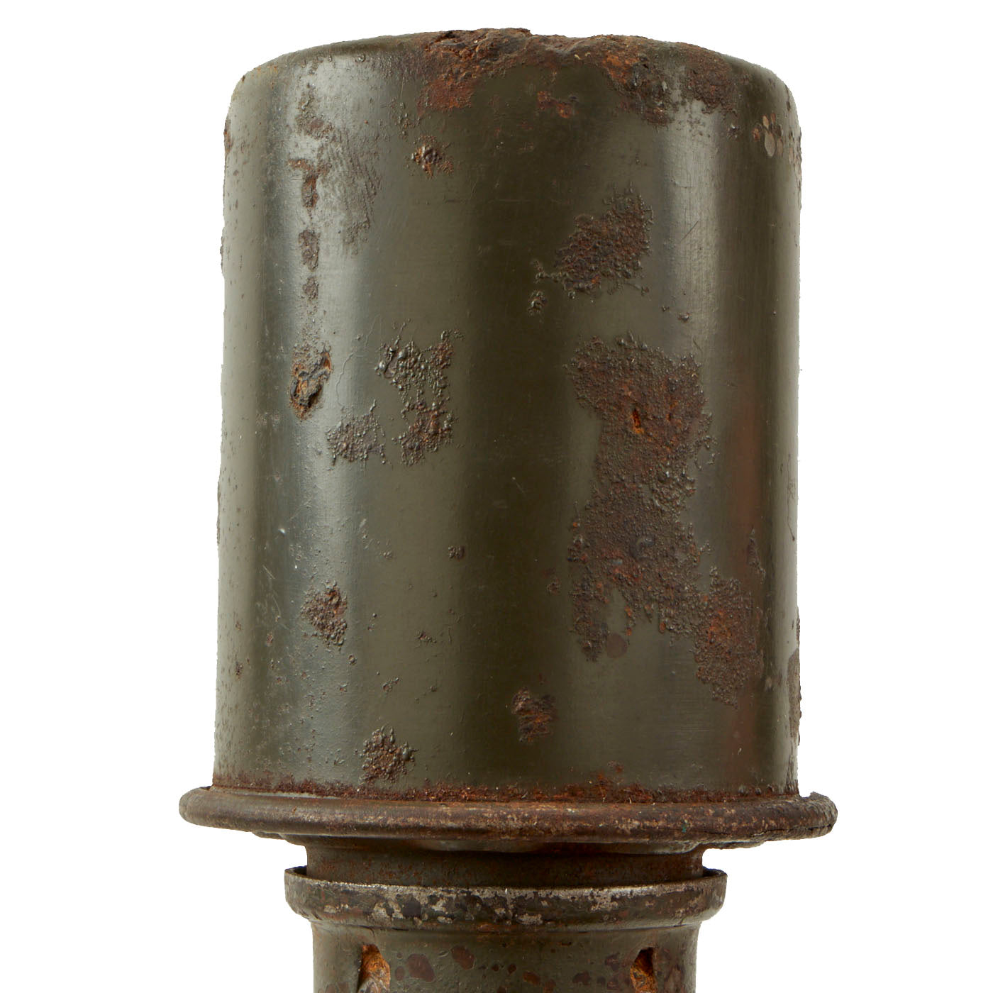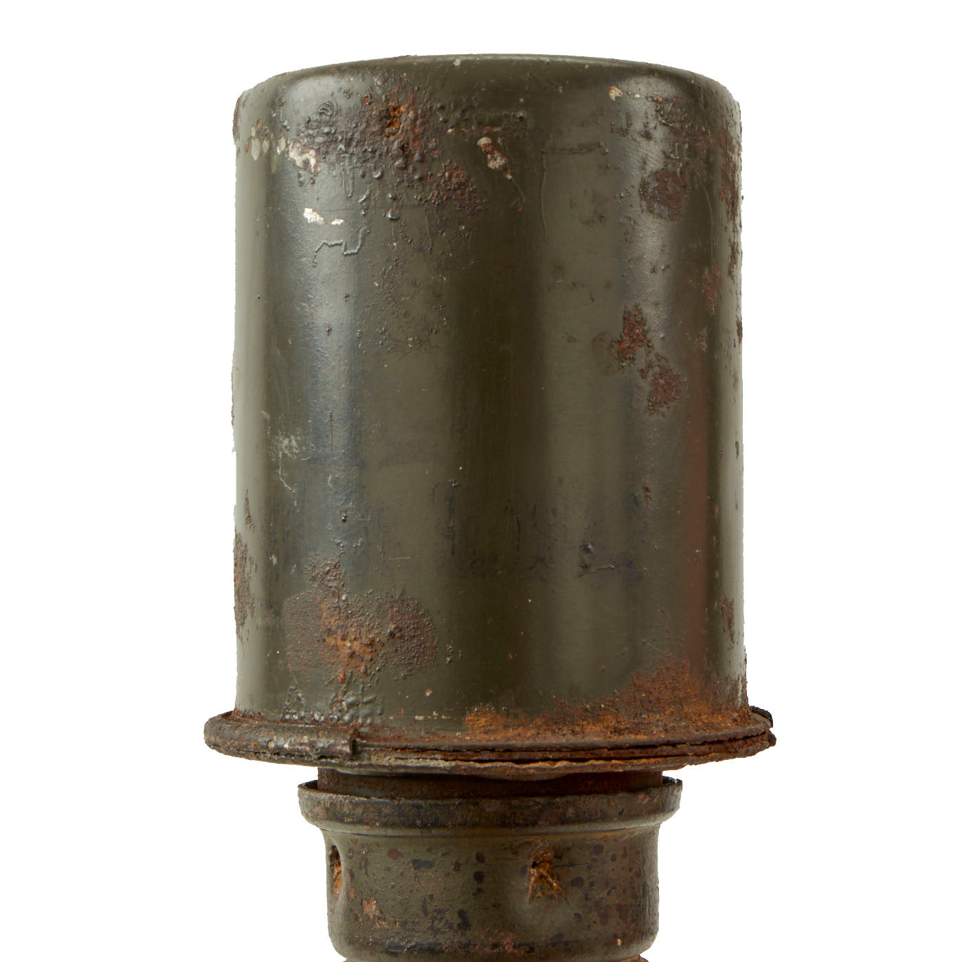 Original Item: Only One Available. This is an extremely rare M1924, M24, or "Stielhandgranate (stalk hand grenade) 24" German Stick Grenade, often called a "potato masher". This example, acquired from the family of a WWII veteran, has been demilitarized according to specifications by the BATF. It still retains its original paint, and the original markings can be seen on the warhead & handle of the grenade.