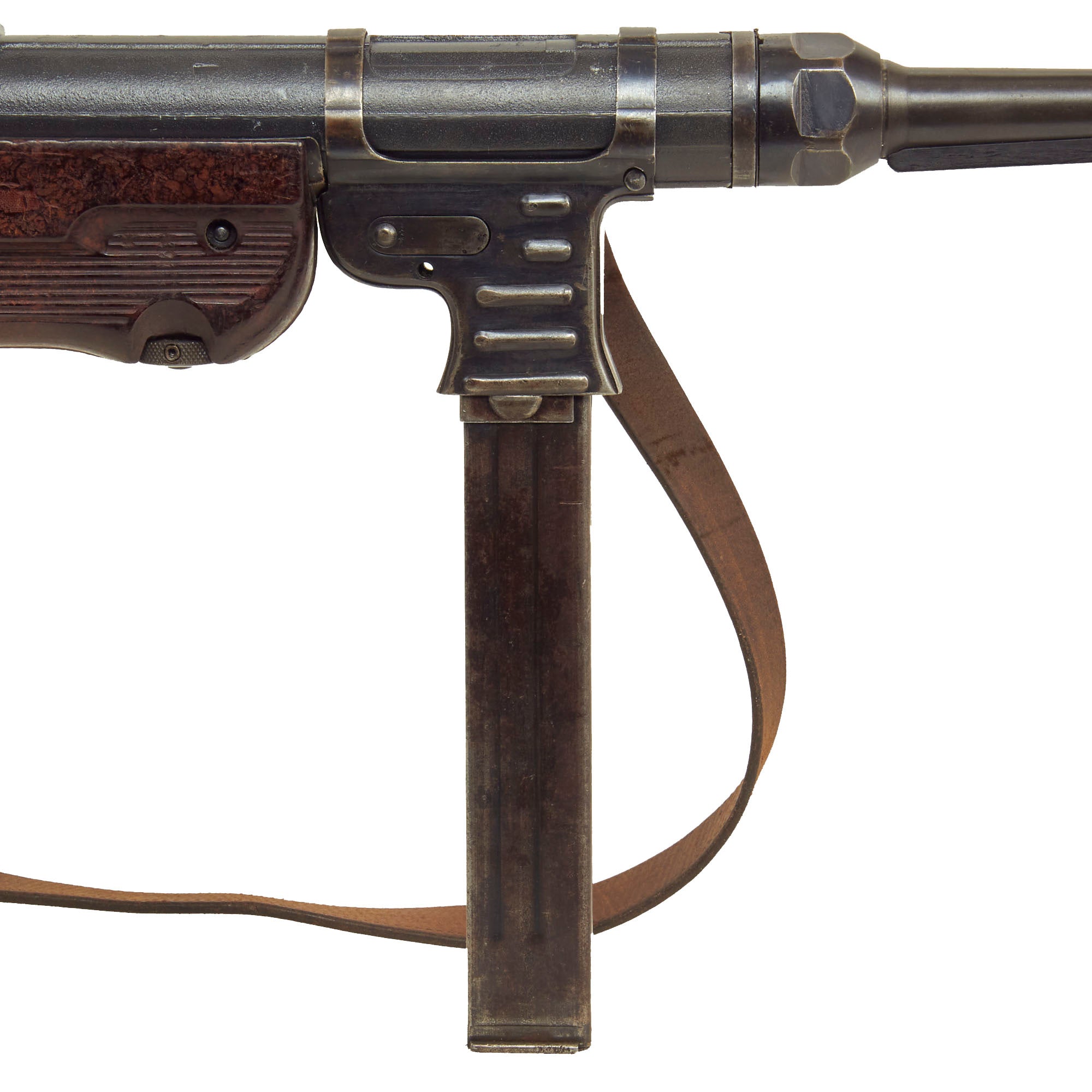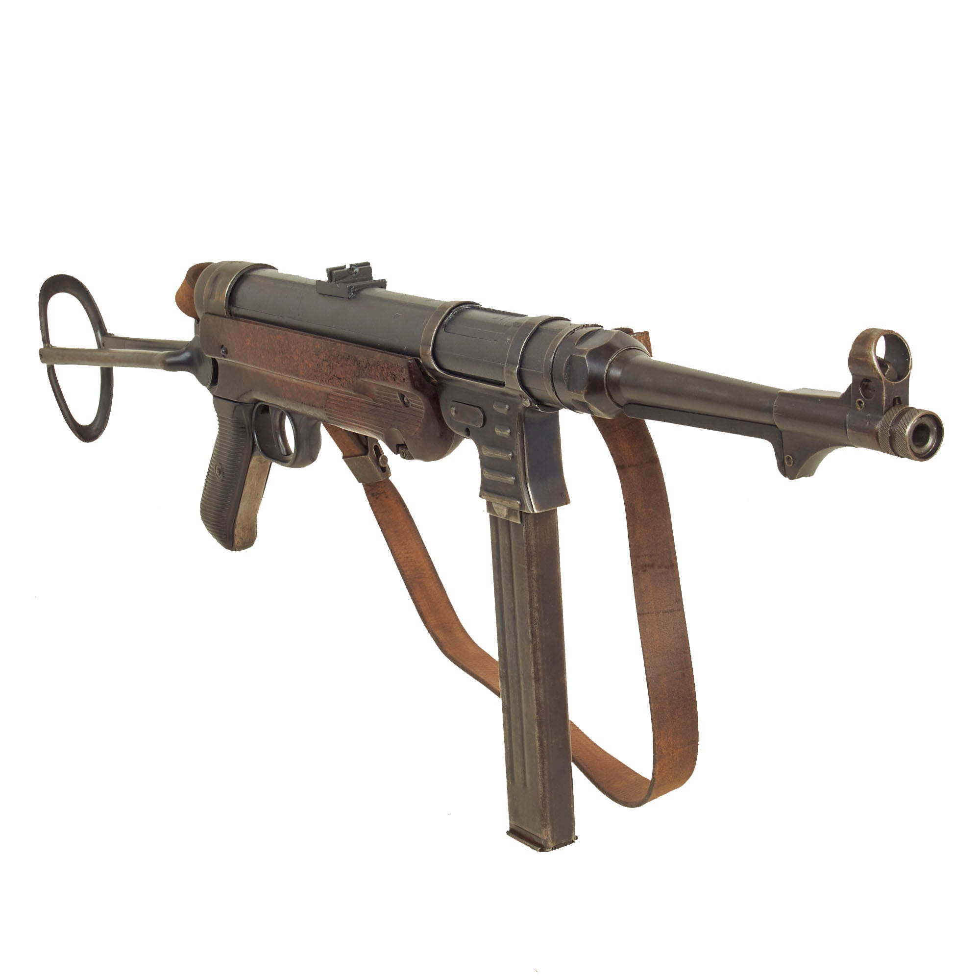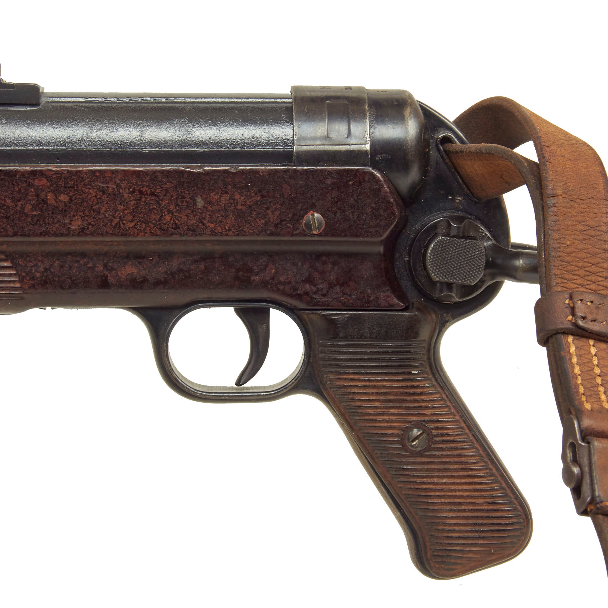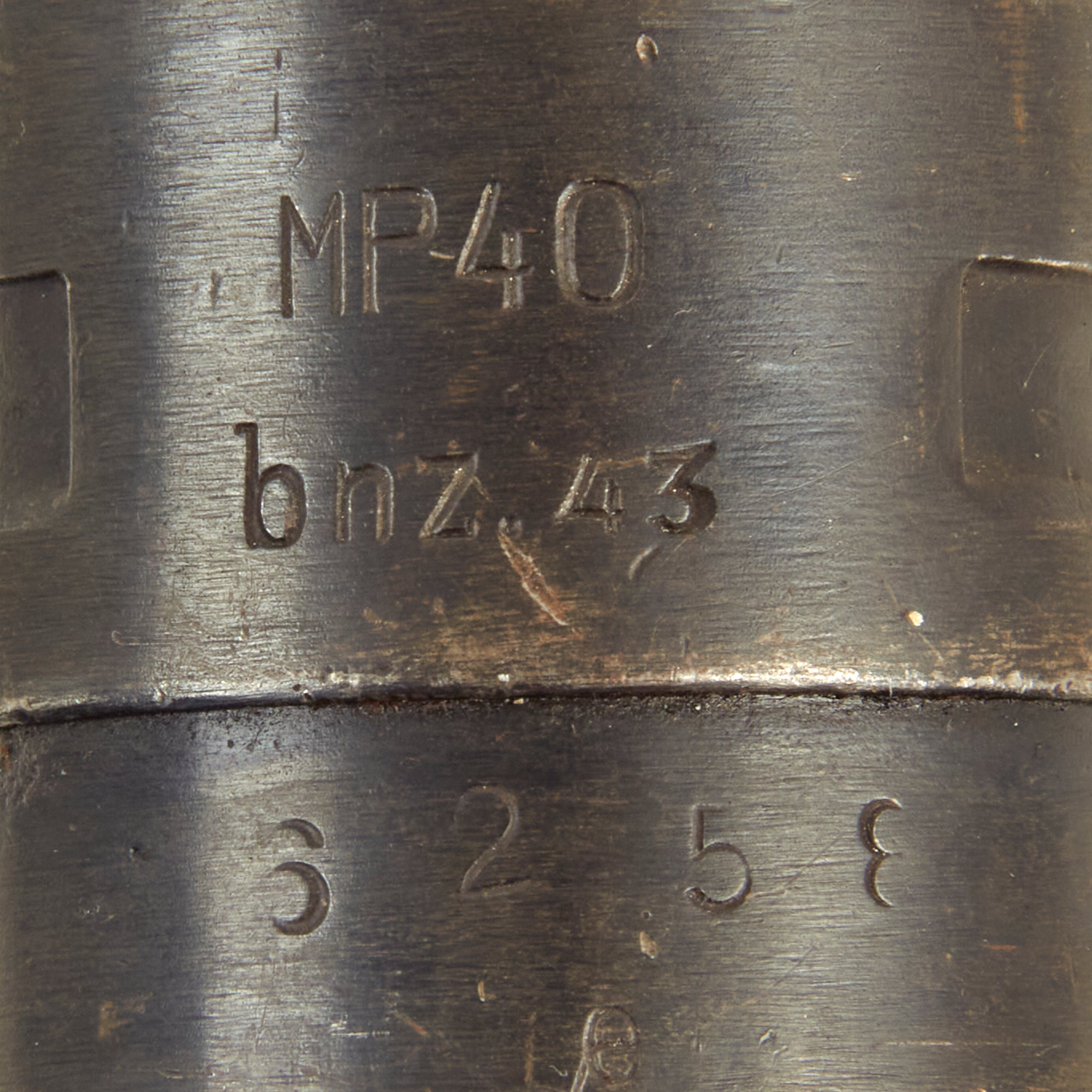 Offered with exceptional original dark brown bakelite stock and grips, this is the real thing that will only appreciate in value over time. The extending butt stock is present and fully functional. The receiver is a BATF approved new made aluminum example, shaped to resemble an original MP40 receiver and fitted with a generic cocking handle. The barrel is original and has not been deactivated in any way, and the bore is in very good shape, with a bright finish and clear lands and grooves. Original markings have been maintained and make a keystone item for any serious WWII collection.