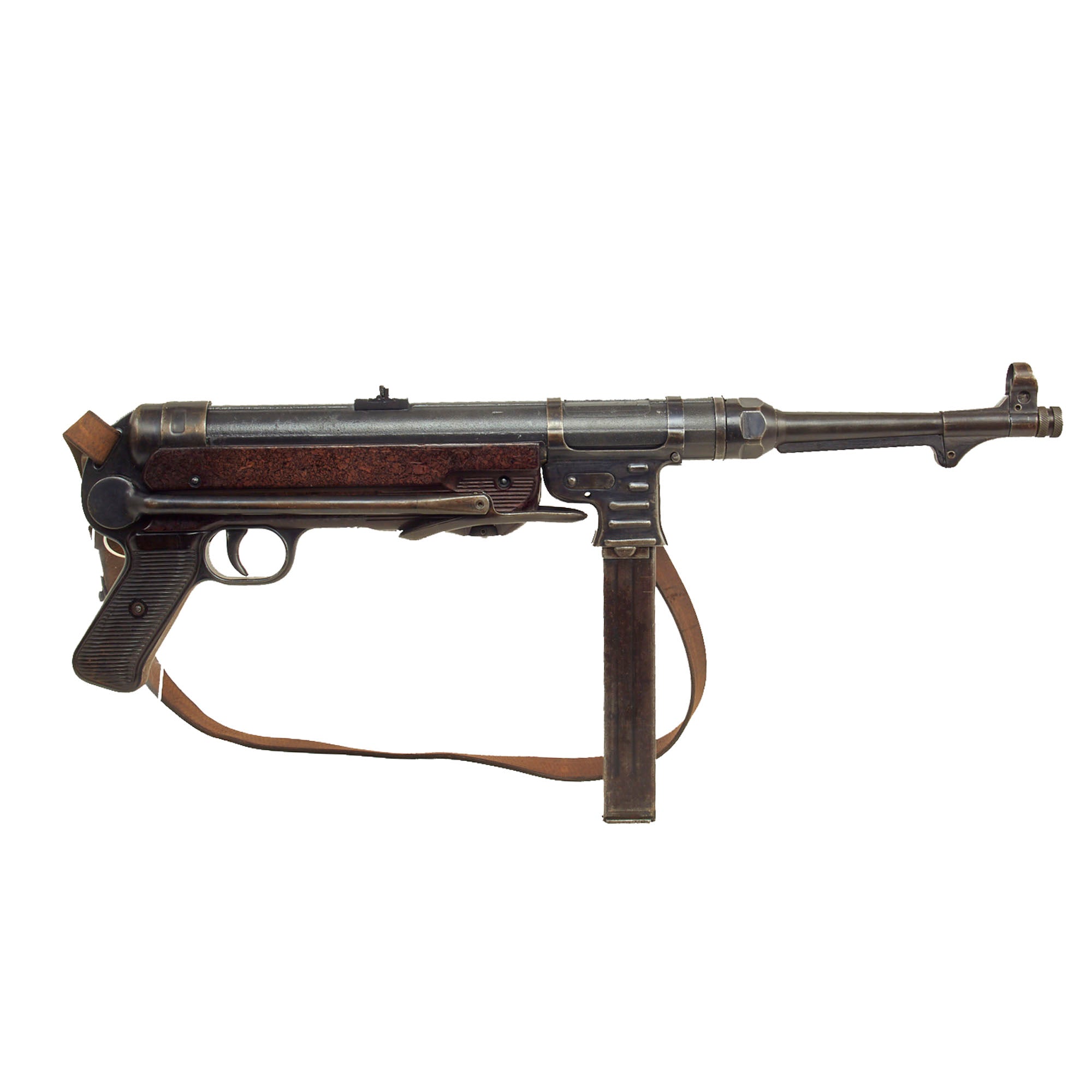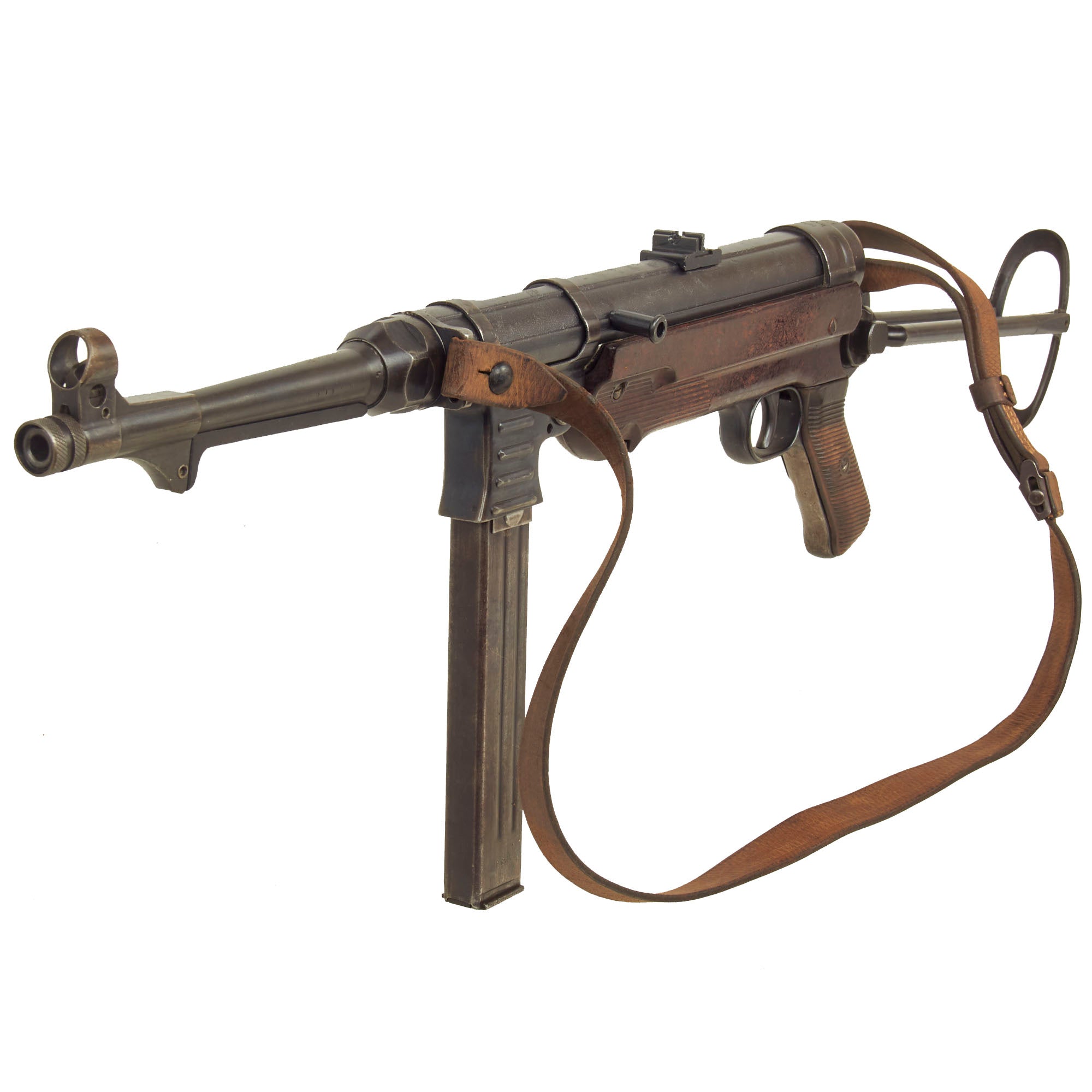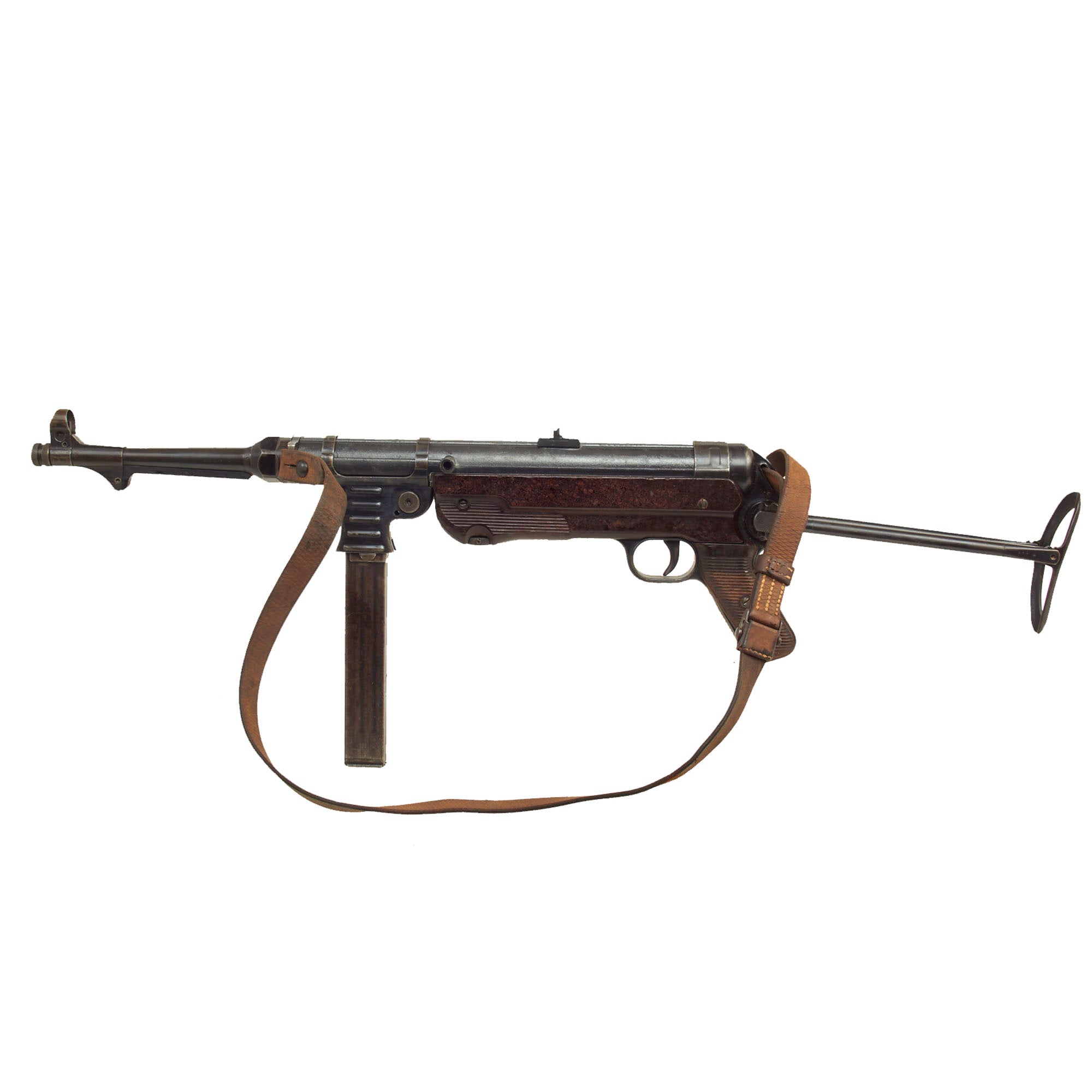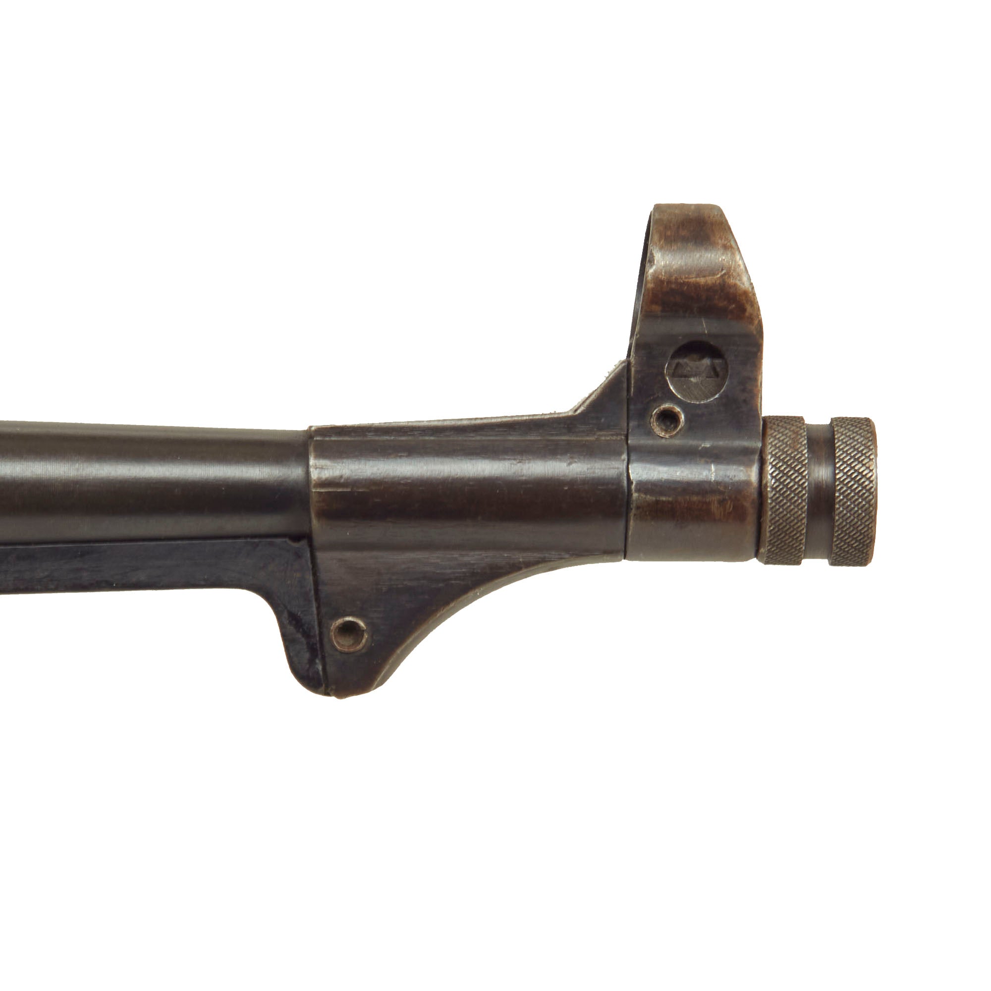 Offered with exceptional original dark brown bakelite stock and grips, this is the real thing that will only appreciate in value over time. The extending butt stock is present and fully functional. The receiver is a BATF approved new made aluminum example, shaped to resemble an original MP40 receiver and fitted with a generic cocking handle. The barrel is original and has not been deactivated in any way, and the bore is in very good shape, with a bright finish and clear lands and grooves. Original markings have been maintained and make a keystone item for any serious WWII collection.