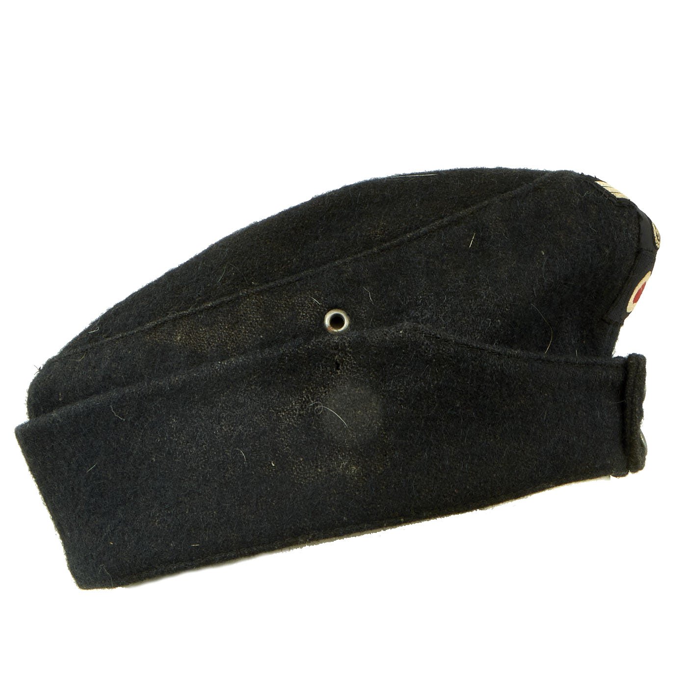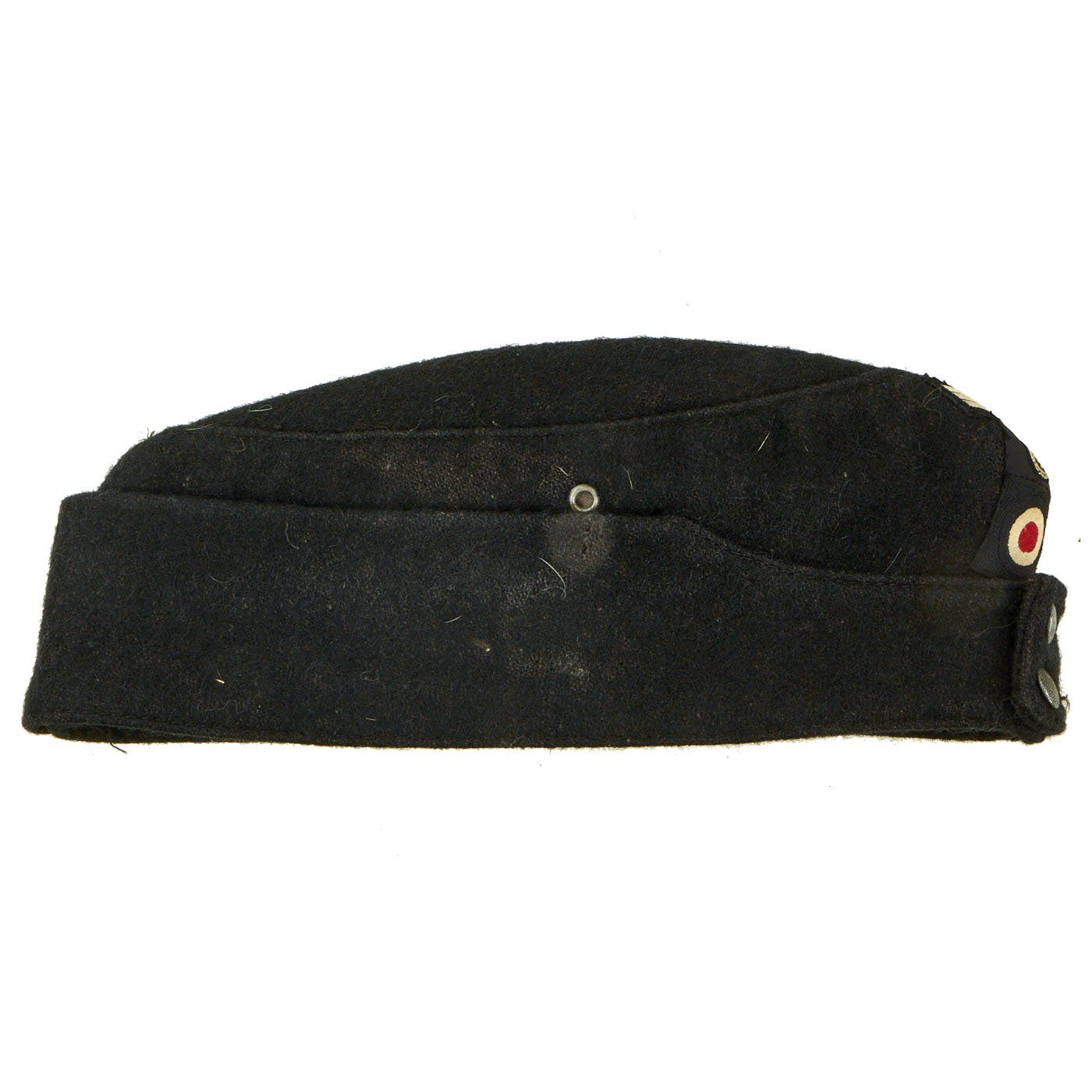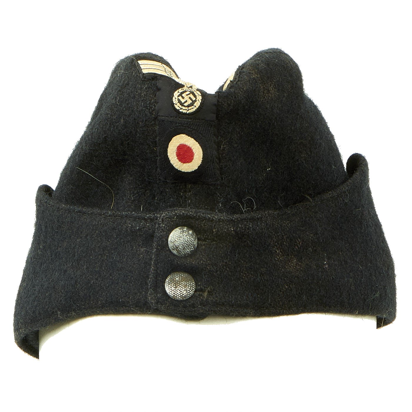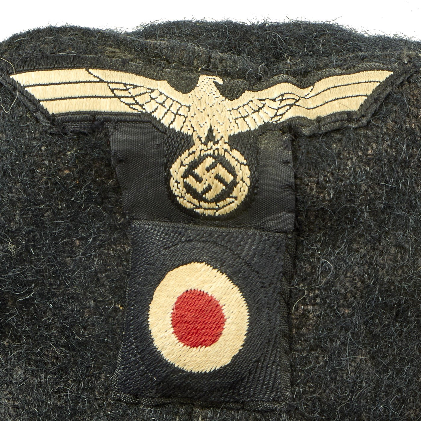 This example is constructed of a black wool exterior for Panzer troops, with a gray rayon lining. It features a fine Panzer BeVo style machine embroidered eagle, with white thread on a black green base, the standard Panzer Field colors. Below this is a machine embroidered bullion National Tri-Color Cockade on a square black. background. There is no piping or soutache, so this was for an enlisted man.