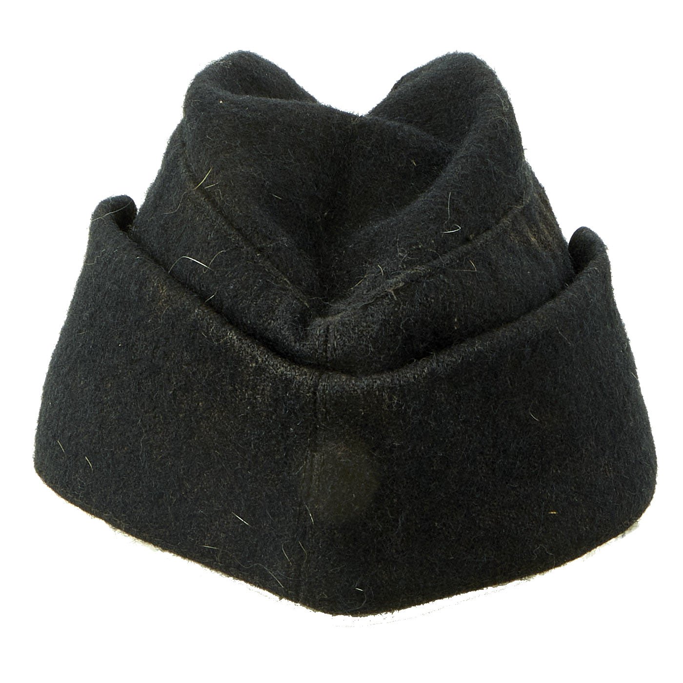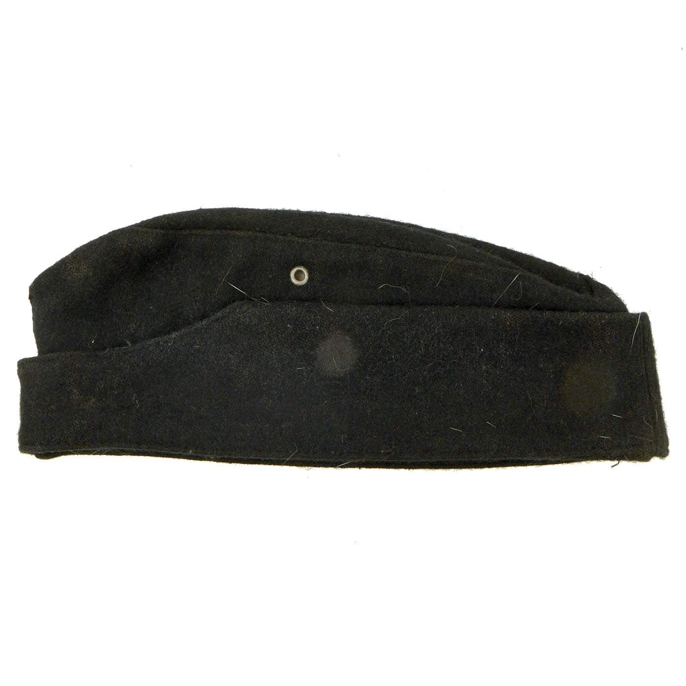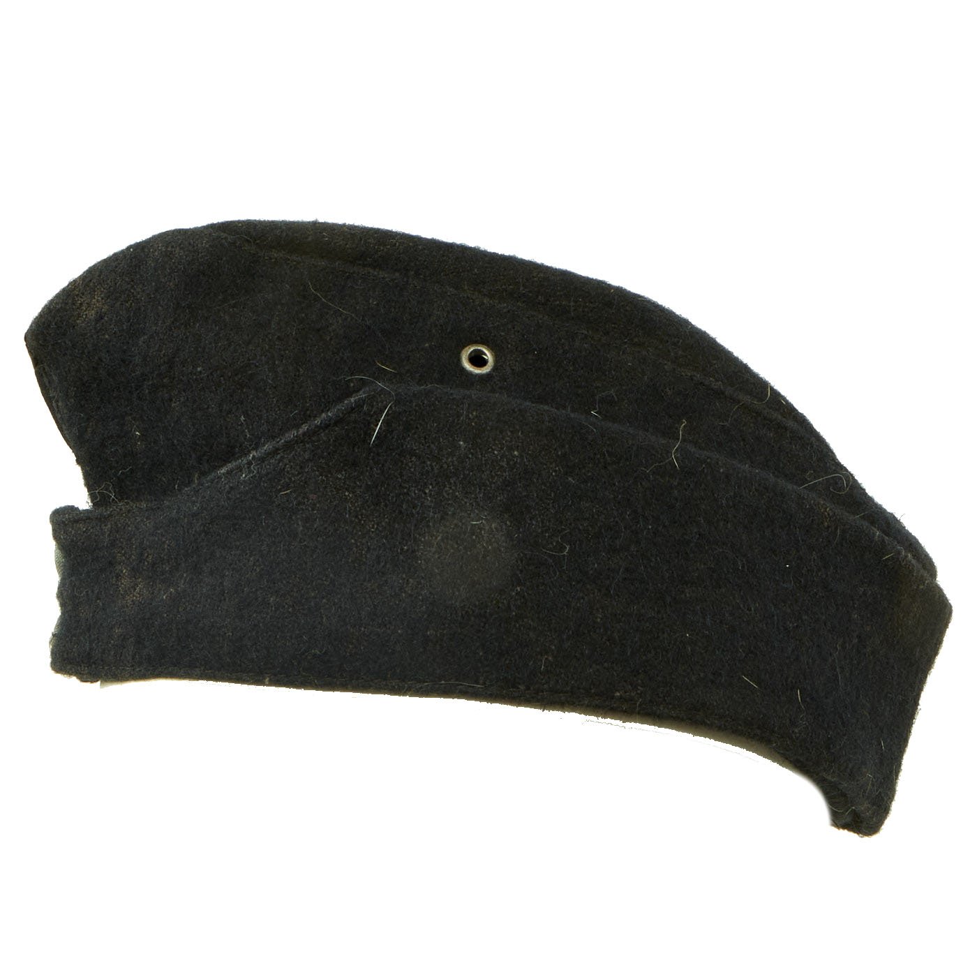 Condition of this cap is very good, with spotted wear to the nap of the outer shell, most likely from moth damage. The front buttons are still intact, and the flaps fold down easily. The interior shows only light service wear, making this a really great example.