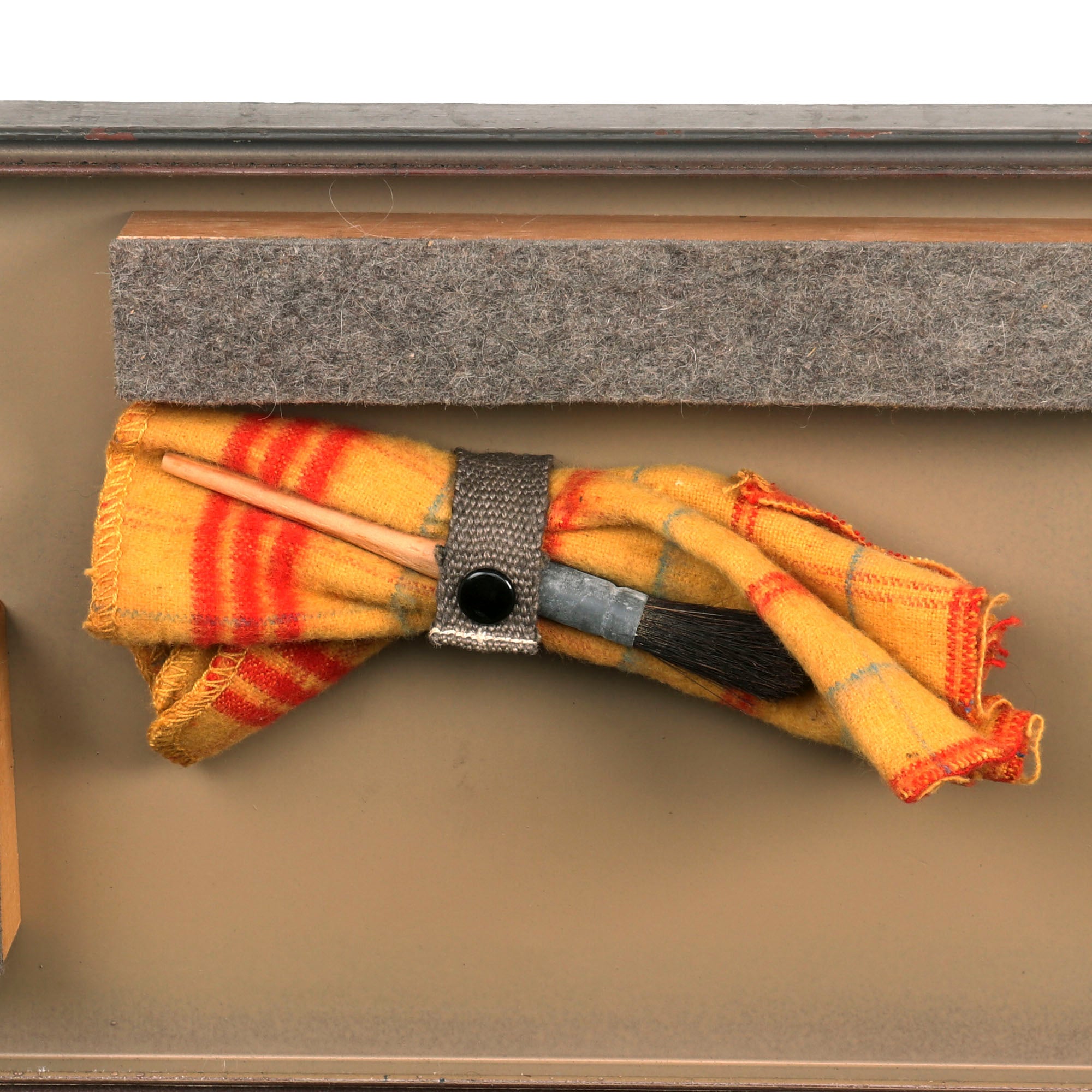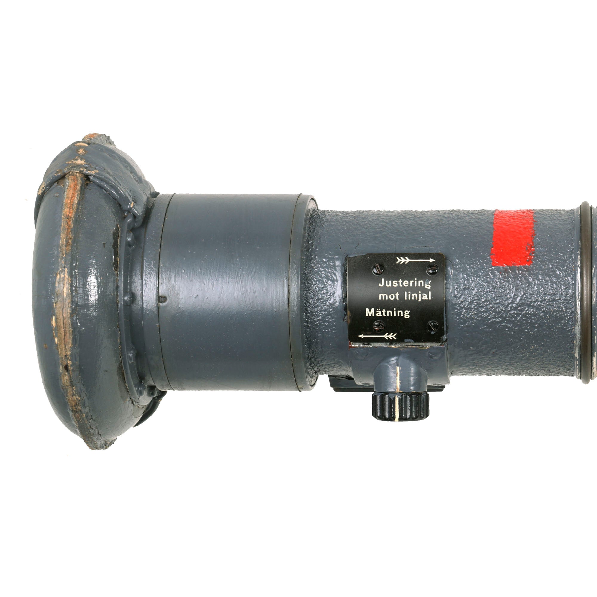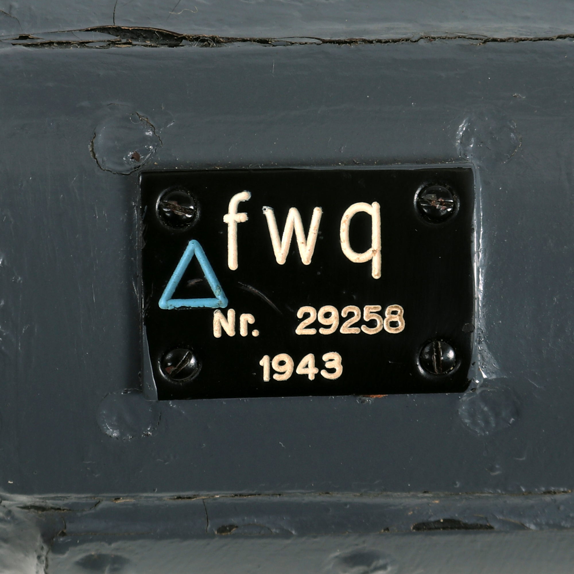 This indicates 1943 production by Saalfelder Apparatebau GmbH in Saalfeld, Germany, not far from Jena, where many optics companies were based. They are a known maker of German WWII optics, and other examples have been seen of their equipment. There is a blue triangle on the left side of the plate, indicating the type of lubricant to be used. The "fwq" marking is present on the rubber eyepiece as well. The other data plates are all in Swedish, and indicate that the rangefinder is a 1m a - instr m/43 ( 6 × ), which is also listed on the serial number matched crate: