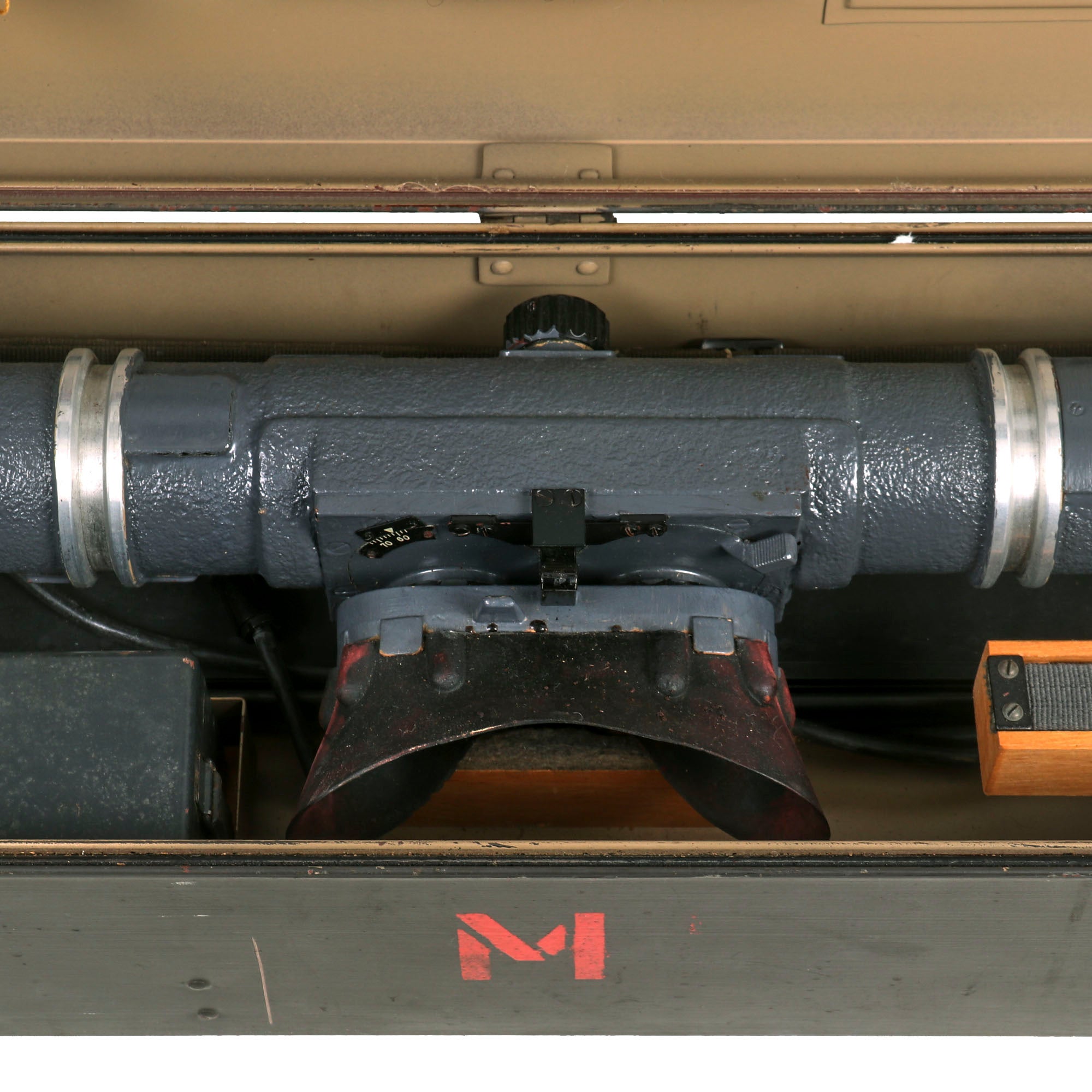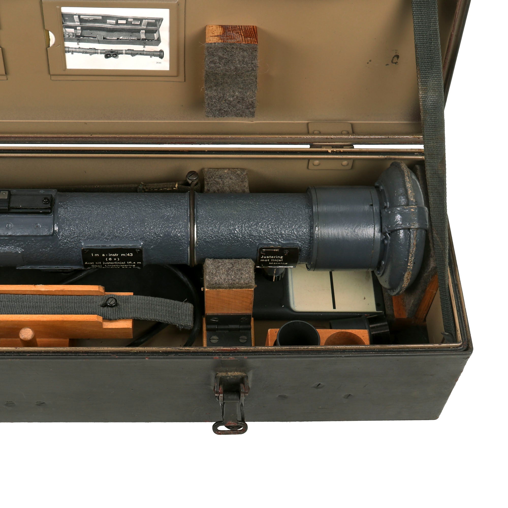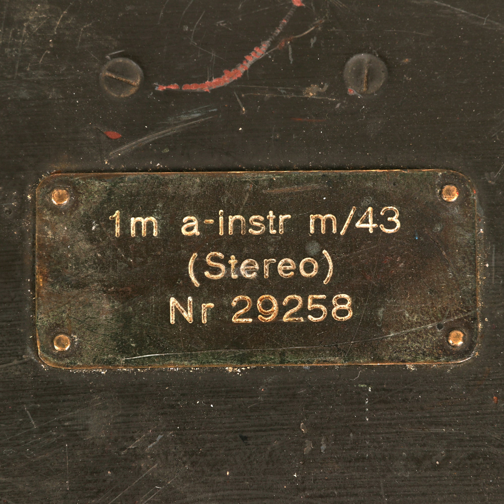 Original Items: Only One Set Available. This is an excellent example of a German WWII Entfernungsmesser 1-meter Raumbild 36 (1936) or "Em 1m R36" rangefinder, complete in its original transit chest. This model was one of the most widely used optical rangefinders in the German Wehrmacht during WWII. In the words of one German source, "A light rangefinder for all branches of the service, especially suitable for moving targets on the ground and in the air". The markings on the rangefinder and chest indicate that it was made for Sweden as their M/43 rangefinder, and all of the data plates on the rangefinder itself are in Swedish.