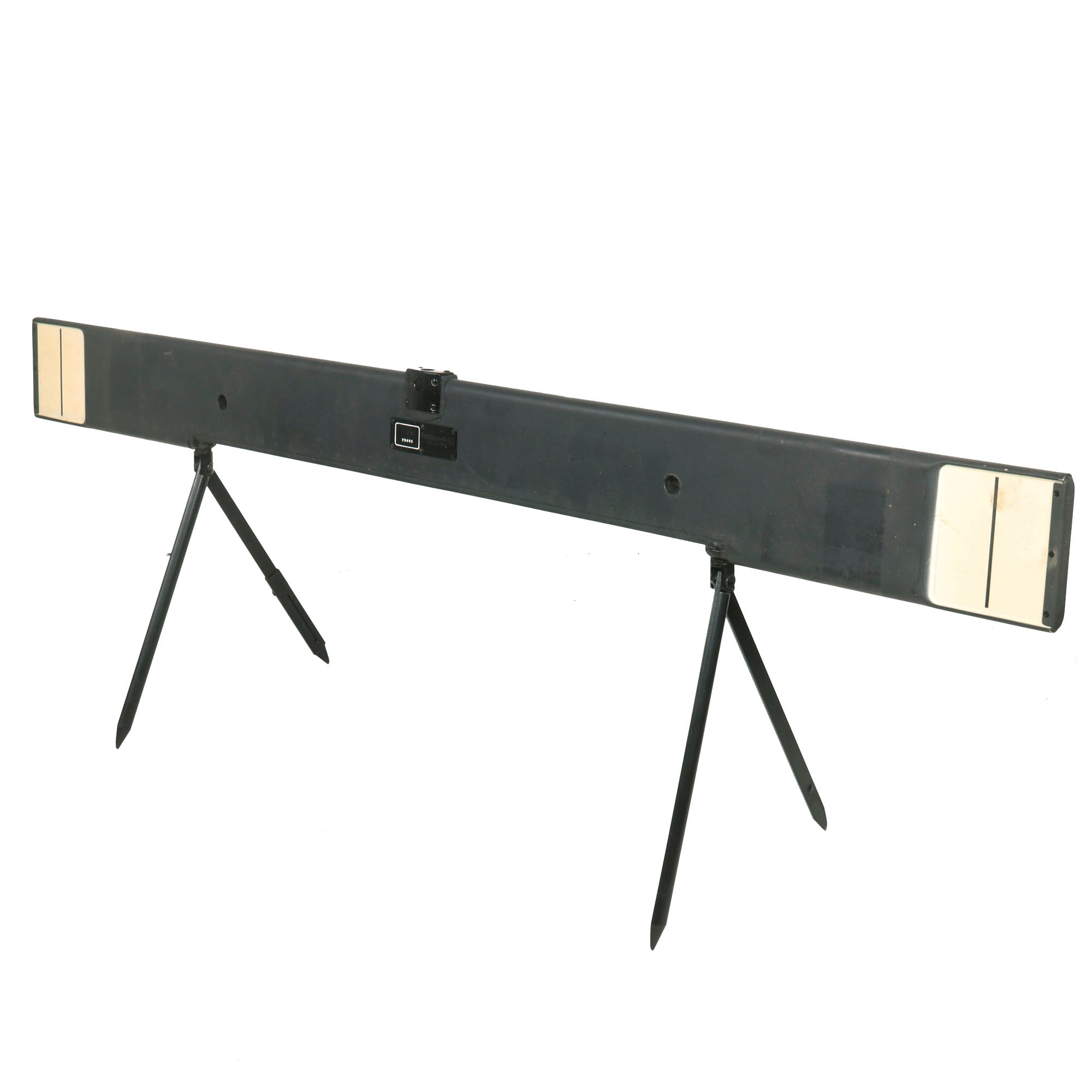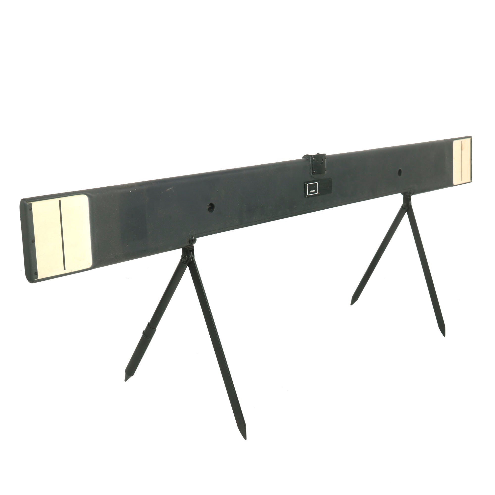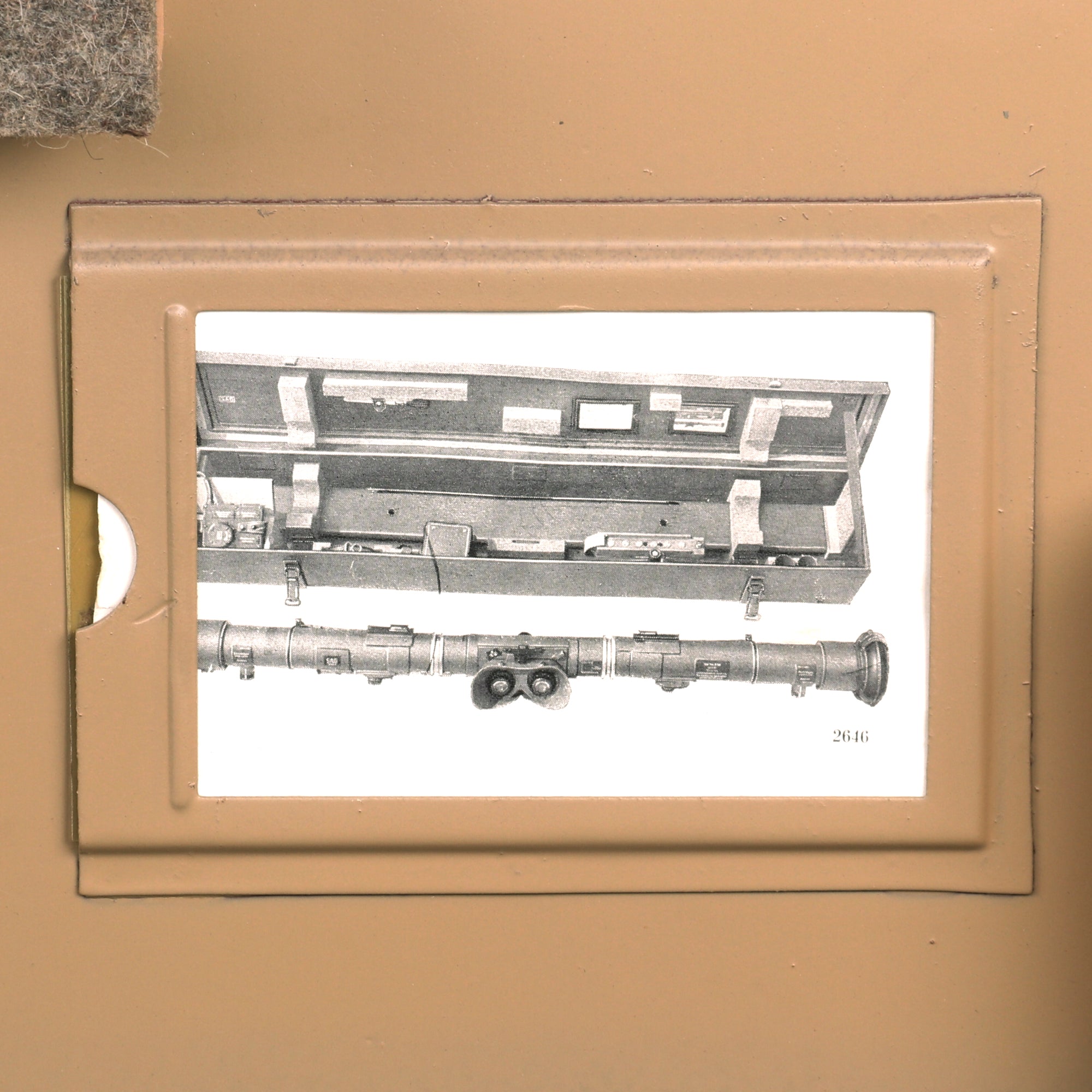 Equipment included in the transit chest includes, in addition to the rangefinder itself, a 1-meter calibrating slat with built-in dual bipod legs and rain protection / sun shield tubes for the objective lenses. There are also some electronic components included, which look to be a battery compartment and brightness control. None of the manuals are included, probably removed long ago, however the chest is definitely in great shape, and does not appear to be missing any of the wood inserts. There is even the knurled post for holding it by hand. There are compartments for extra bulbs and other components, however none of these are included.