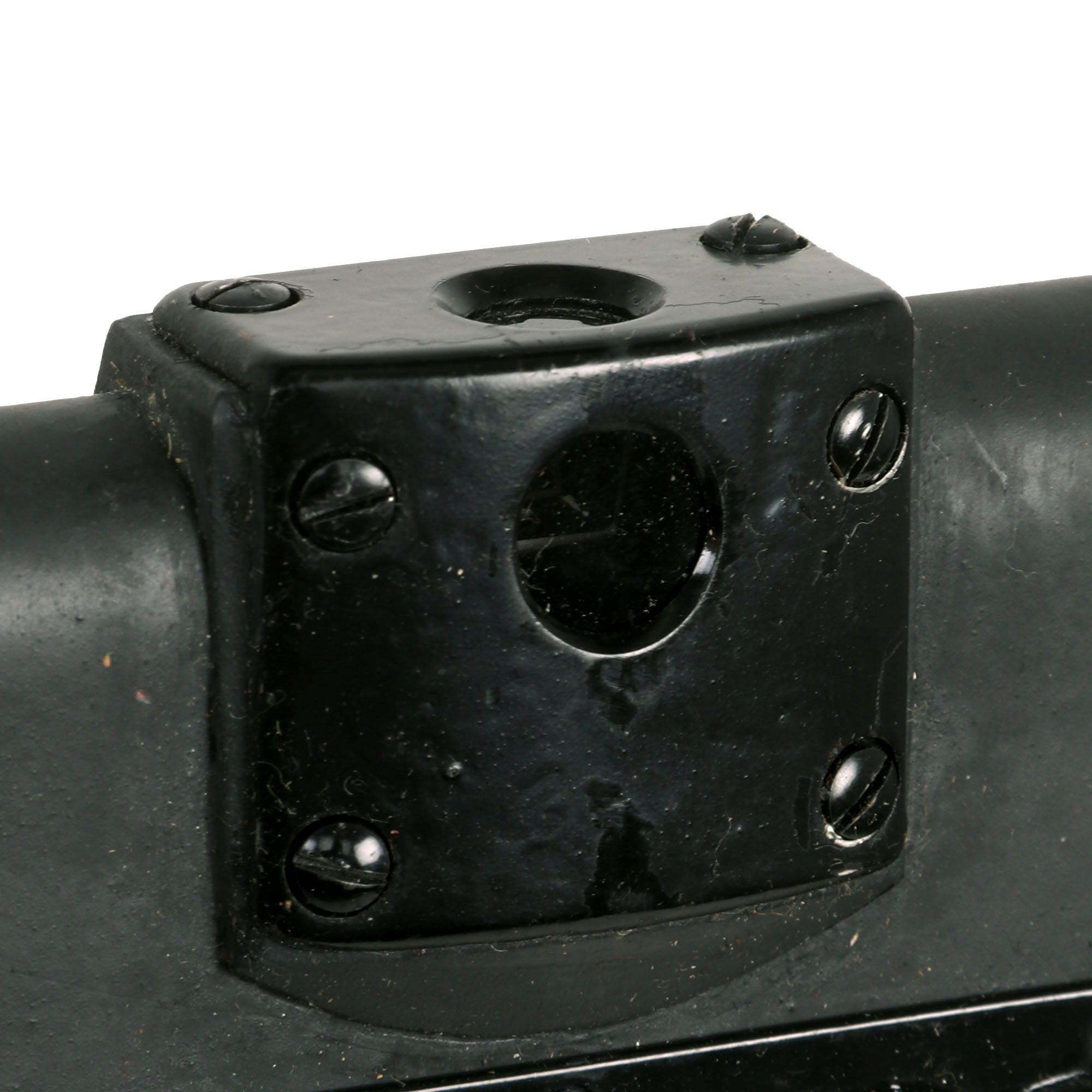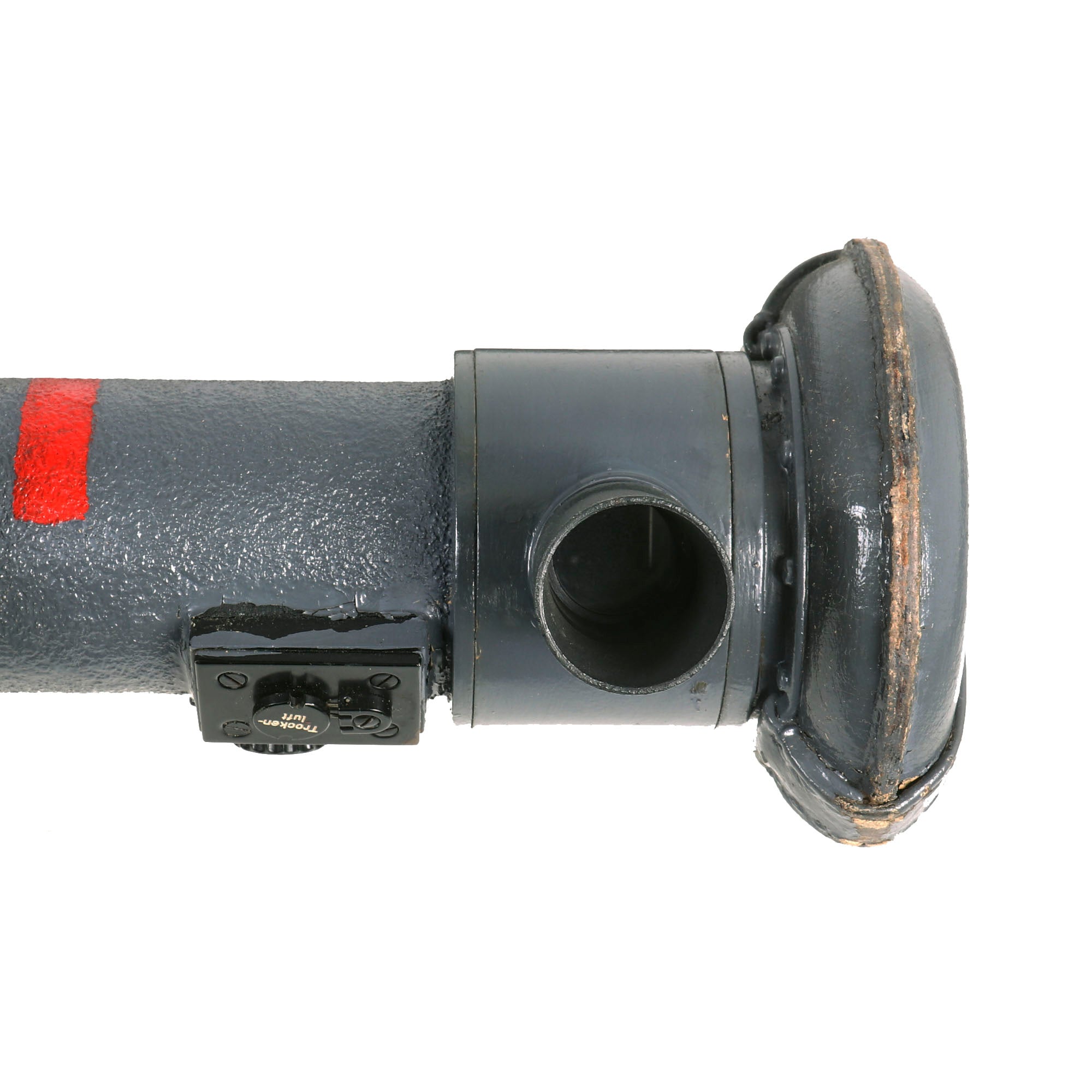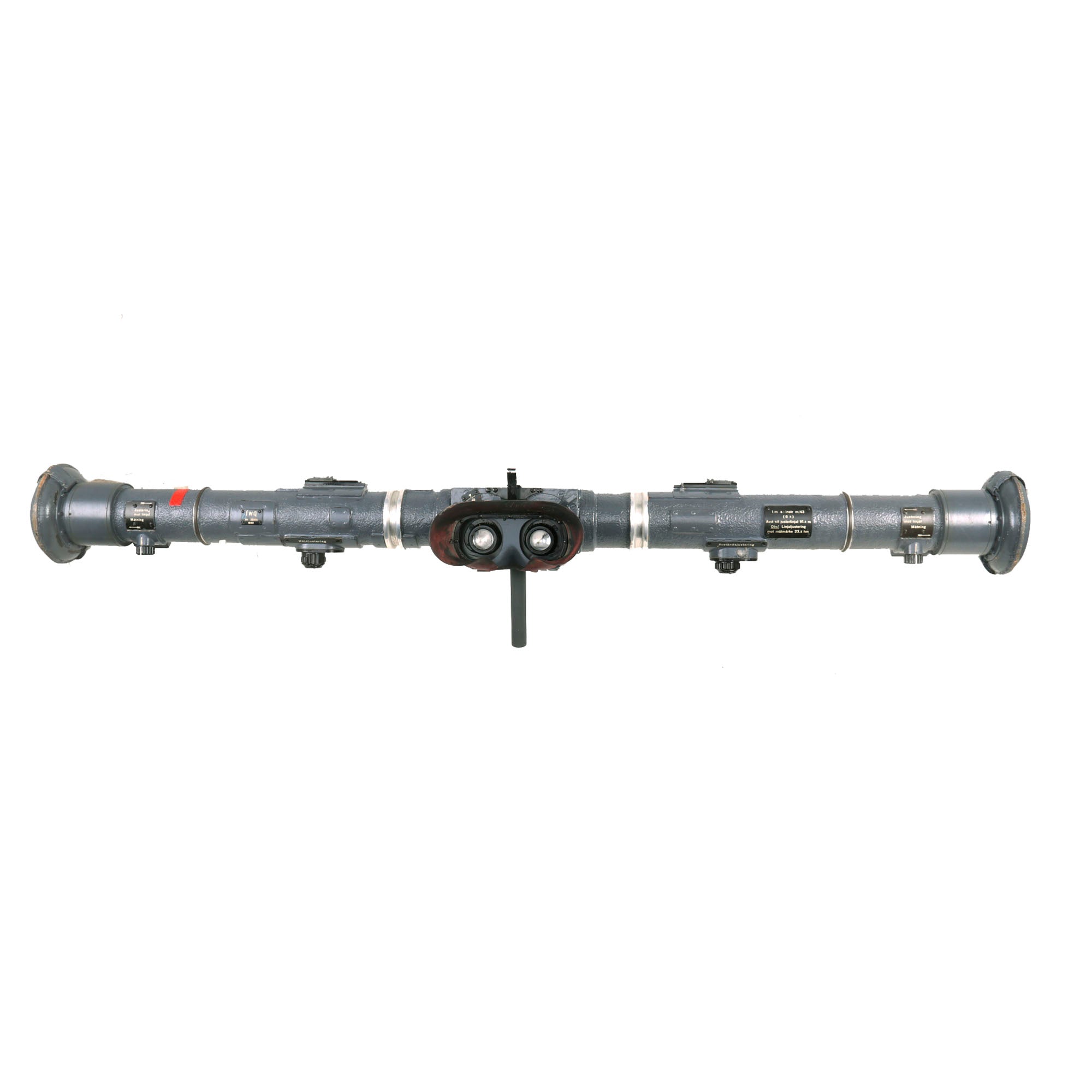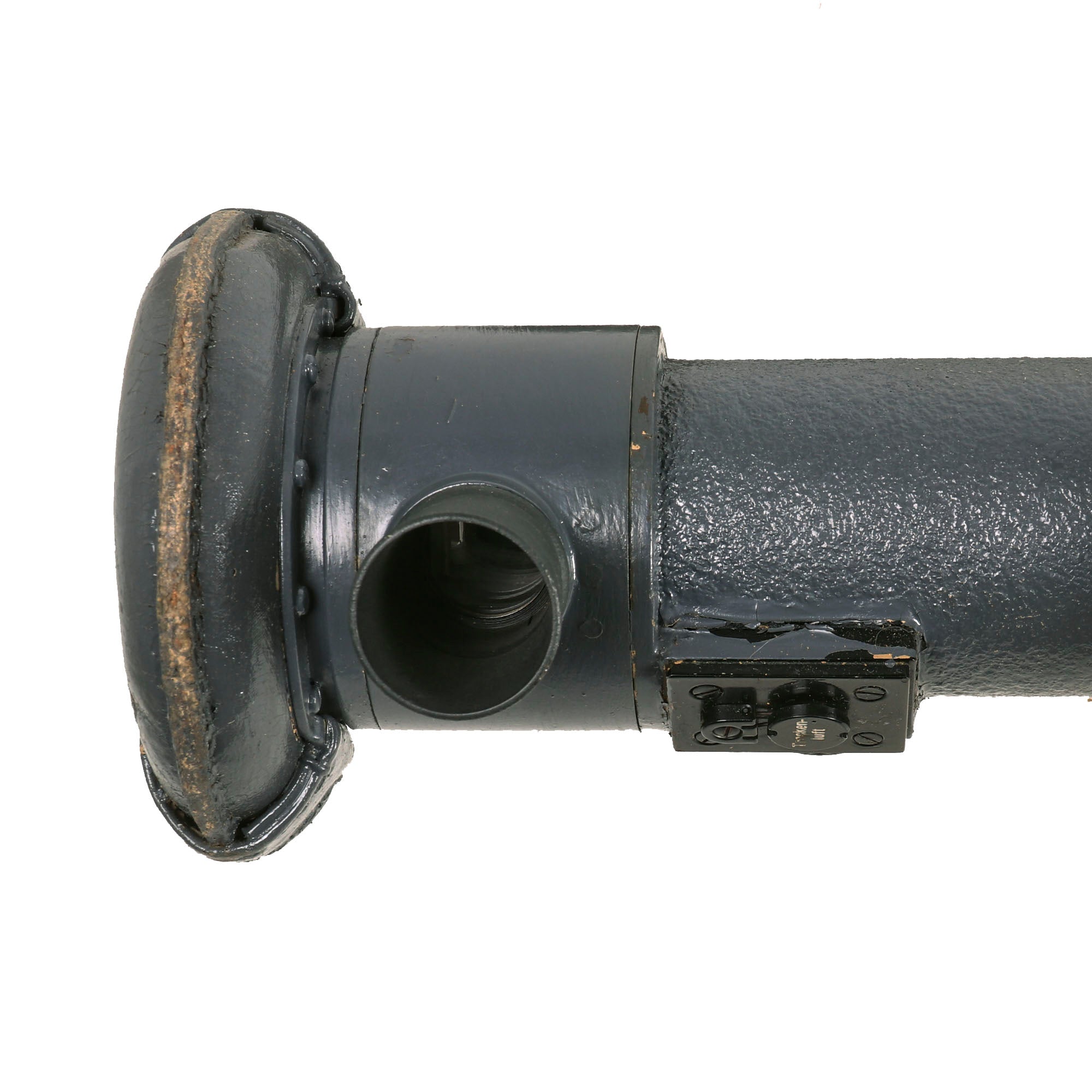 Equipment included in the transit chest includes, in addition to the rangefinder itself, a 1-meter calibrating slat with built-in dual bipod legs and rain protection / sun shield tubes for the objective lenses. There are also some electronic components included, which look to be a battery compartment and brightness control. None of the manuals are included, probably removed long ago, however the chest is definitely in great shape, and does not appear to be missing any of the wood inserts. There is even the knurled post for holding it by hand. There are compartments for extra bulbs and other components, however none of these are included.