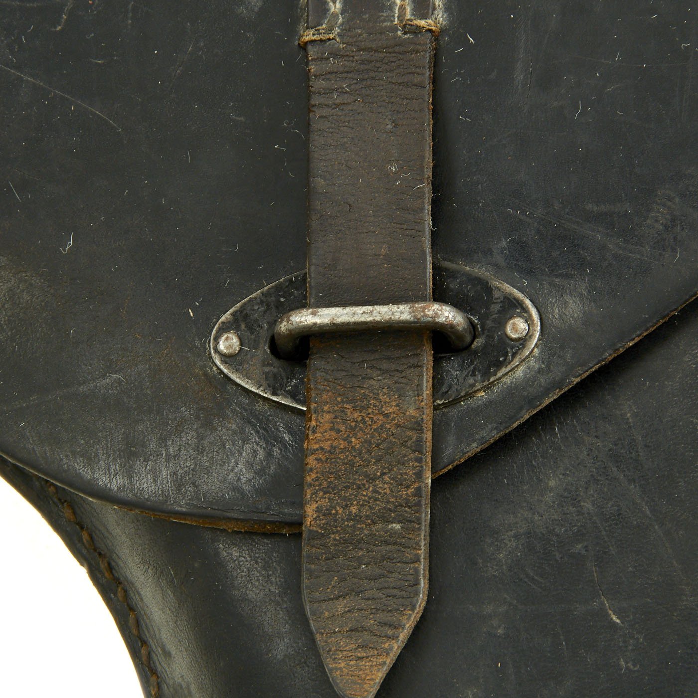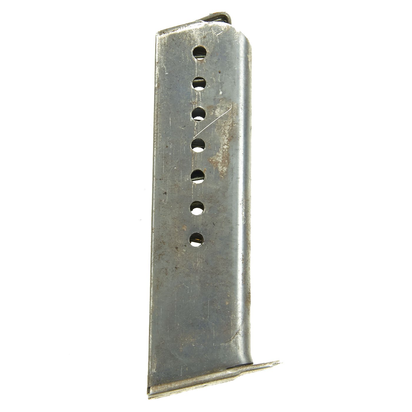 The included magazine is the standard P.38 configuration, with 7 holes on each side. As far as we can tell it is functional, and shows the expected wear to the blued finish from service. The side of the holster is marked P38, and the spine is Waffenamt WaA706 stamped like the holster, and has maker code jvd below this. This indicates manufacture by Erste Nordböhmische Metallwarenfabrik, Adolf Rössler, located in Niedereinsiedel, part of the so-called Sudetenland. This was a known manufacturer of parts and accessories for the P.38 pistol, as well as other small arms such as the StG44. After the war, the German population was expelled, and today the city is Dolní Poustevna in the Czech Republic.
