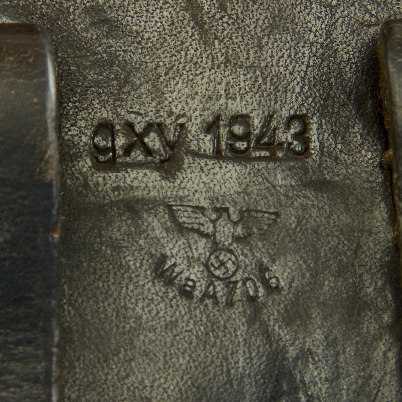 The back of the holster is marked P38 on the upper right hand corner, and between the belt loops it is marked gxy 1943 over a Waffenamt WaA706 inspection stamp. This indicates 1943 production by Gebrüder Klinge of Dresden-Löbtau, a known holster producer during the war according to GERMAN MILITARY LETTER CODES 1939-1945 by John Walter.