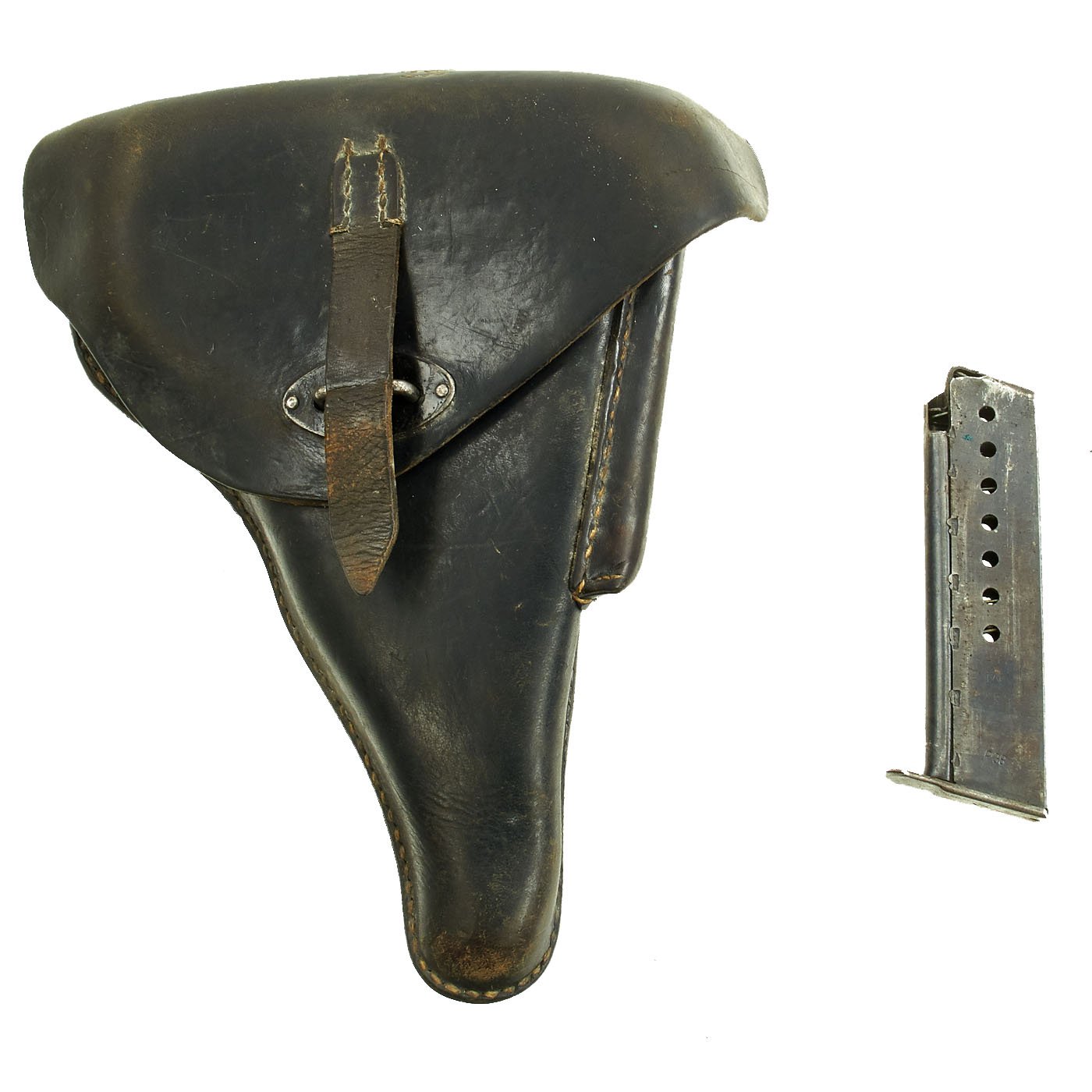 Original Item: Only One Available. Just purchased from a private collector, this is a very nice WWII issue Black Hardshell holster for the standard issue Walther P38 pistol, complete with all the correct period markings. Also included is a correct WWII marked magazine, in very good condition, something we have rarely had before!