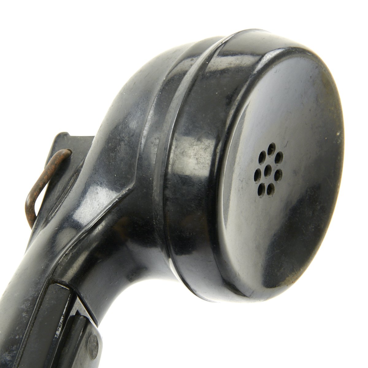 As this is a later war telephone, the maker name is indicated by German three-letter code "ded", for Heliowatt-werke Elektrizitäts-A.G., at their plant located in Schweidnitz/Schlesien, which is today part of Poland. The handset itself is dated 1940, and has a Waffenamt proof near the hanging loop. The coiled cord is not typical, and may be a post war replacement, however it was definitely replaced some time ago.
