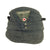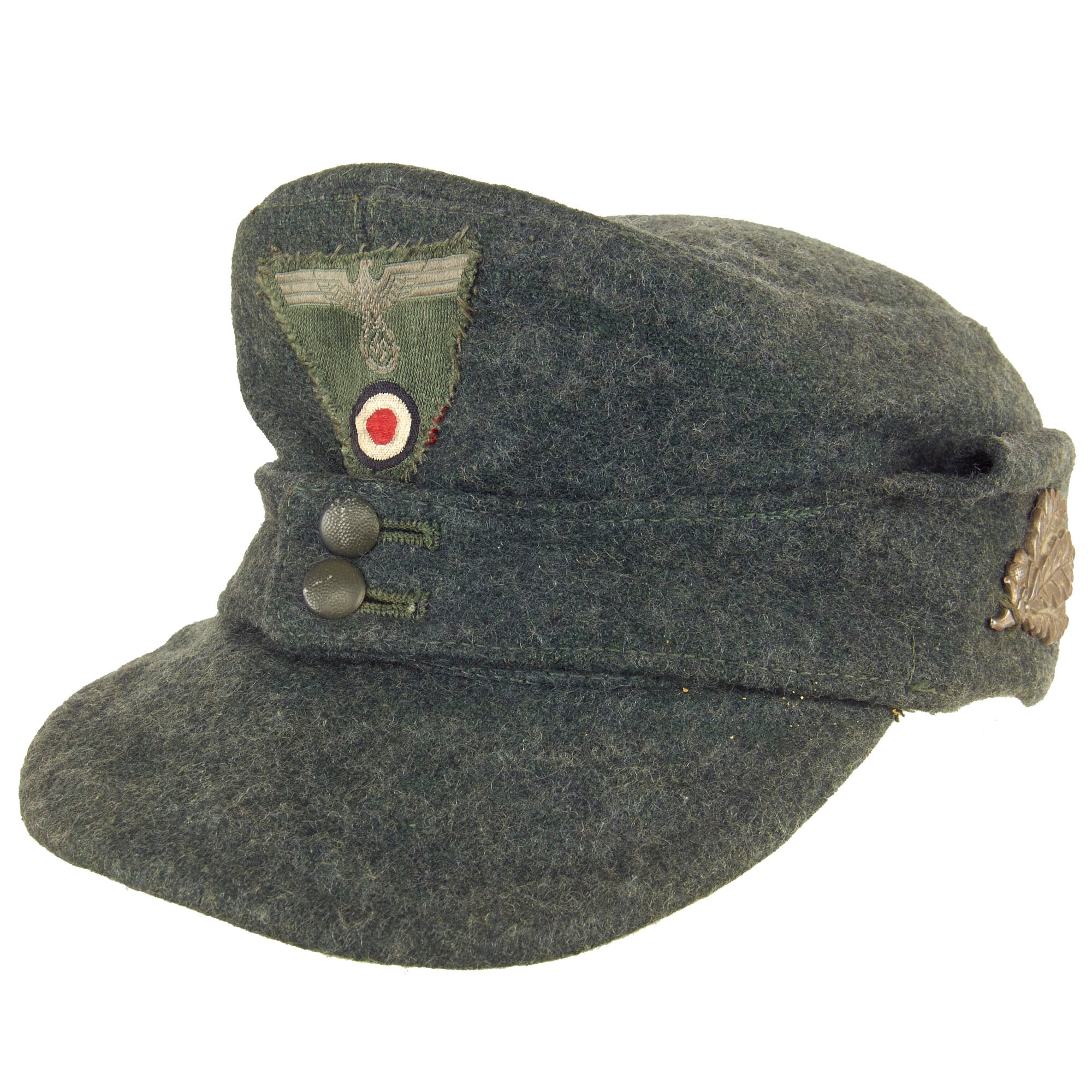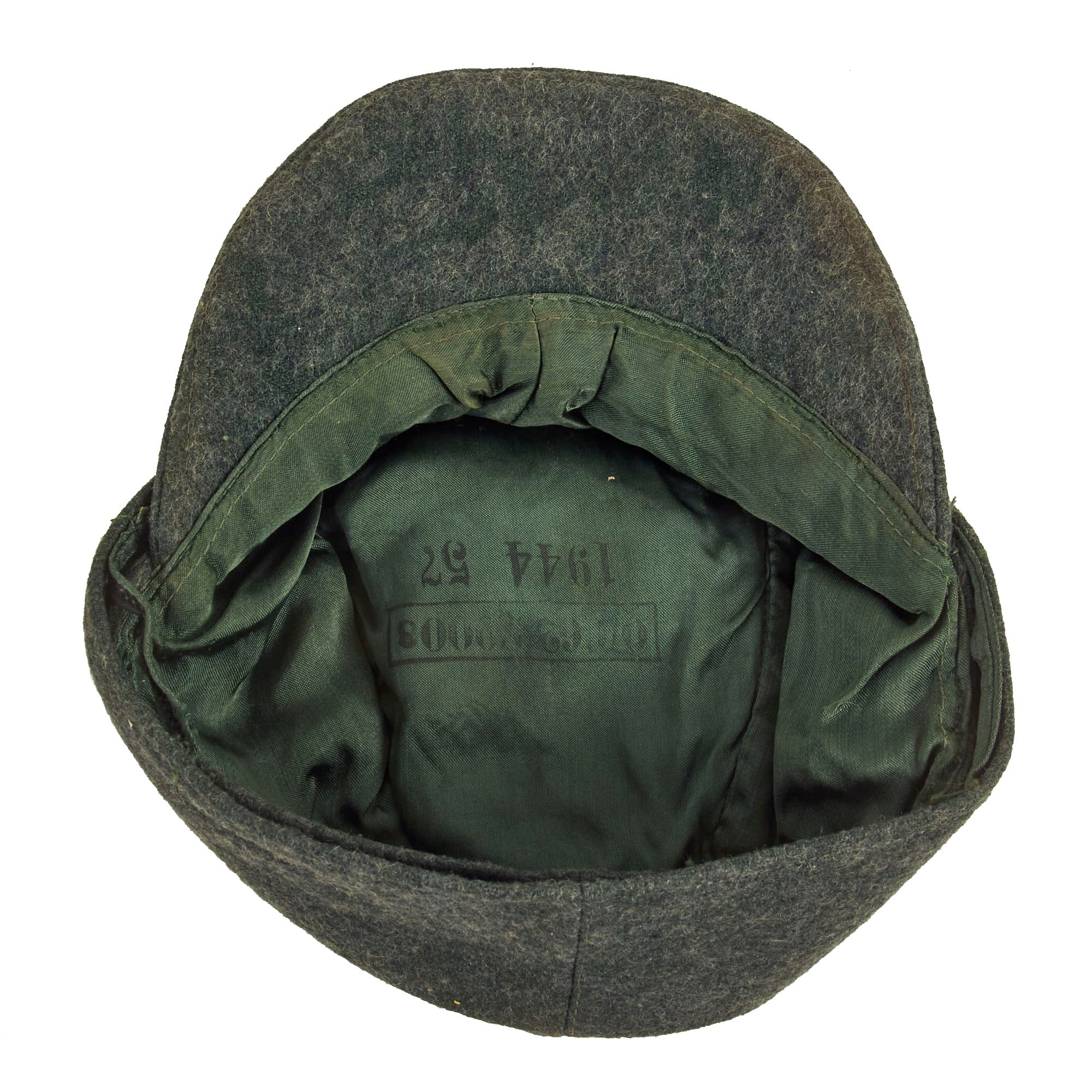 The cap is constructed of wool and is quite a bit more green in color than the usual Heer Feldgrau, probably for better camouflage in dense forests. It is definitely thicker in construction than the usual army issue, and has the correct "fold down" skirt for colder weather. It features a two pebbled aluminum buttons button to the front, securing the skirt, and has the correct securing loops on the underside of the fold down flaps. The peak of the cap has a very nice combined Eagle and cockade BEVO insignia on the front.