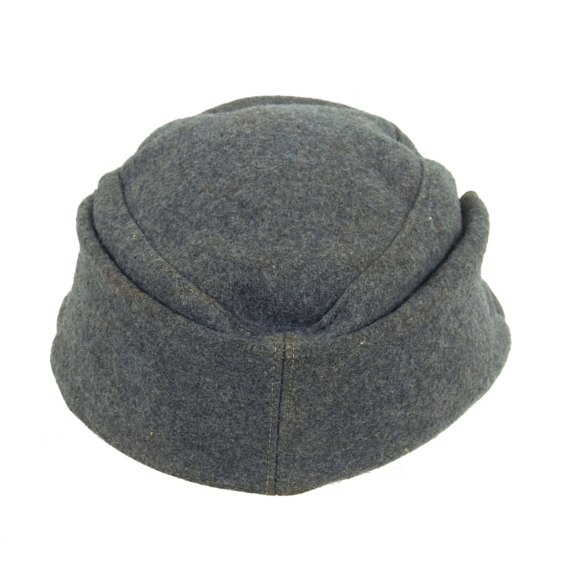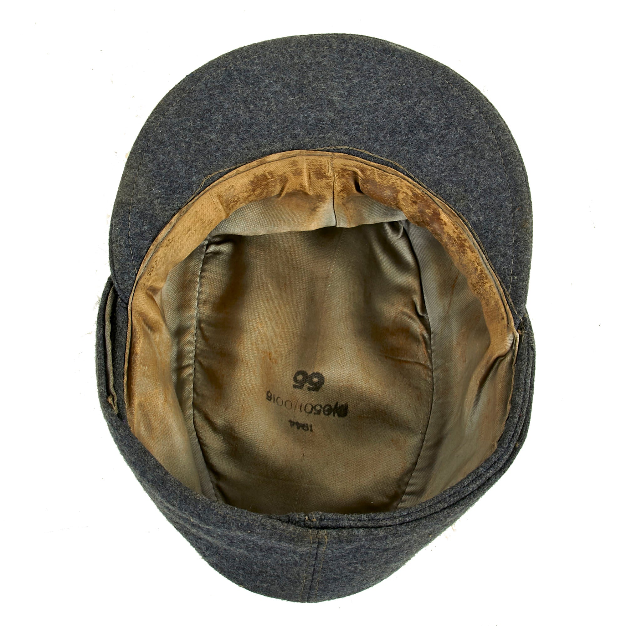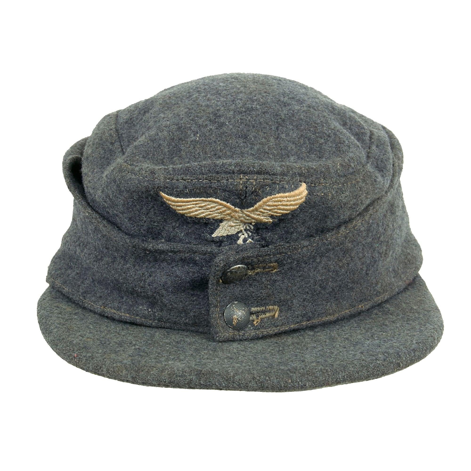 Original Item: Only One Available. This is a very nice example of a Luftwaffe M43 Einheitsmütze Wool field cap, with a great service used look. The cap is constructed of Luftwaffe blue Fliegerblau (Flyer's Blue) blue/grey wool, and has the correct "fold down" skirt for colder weather. It features two pebbled aluminum buttons to the front, securing the skirt, and has the correct rayon loops on the underside.