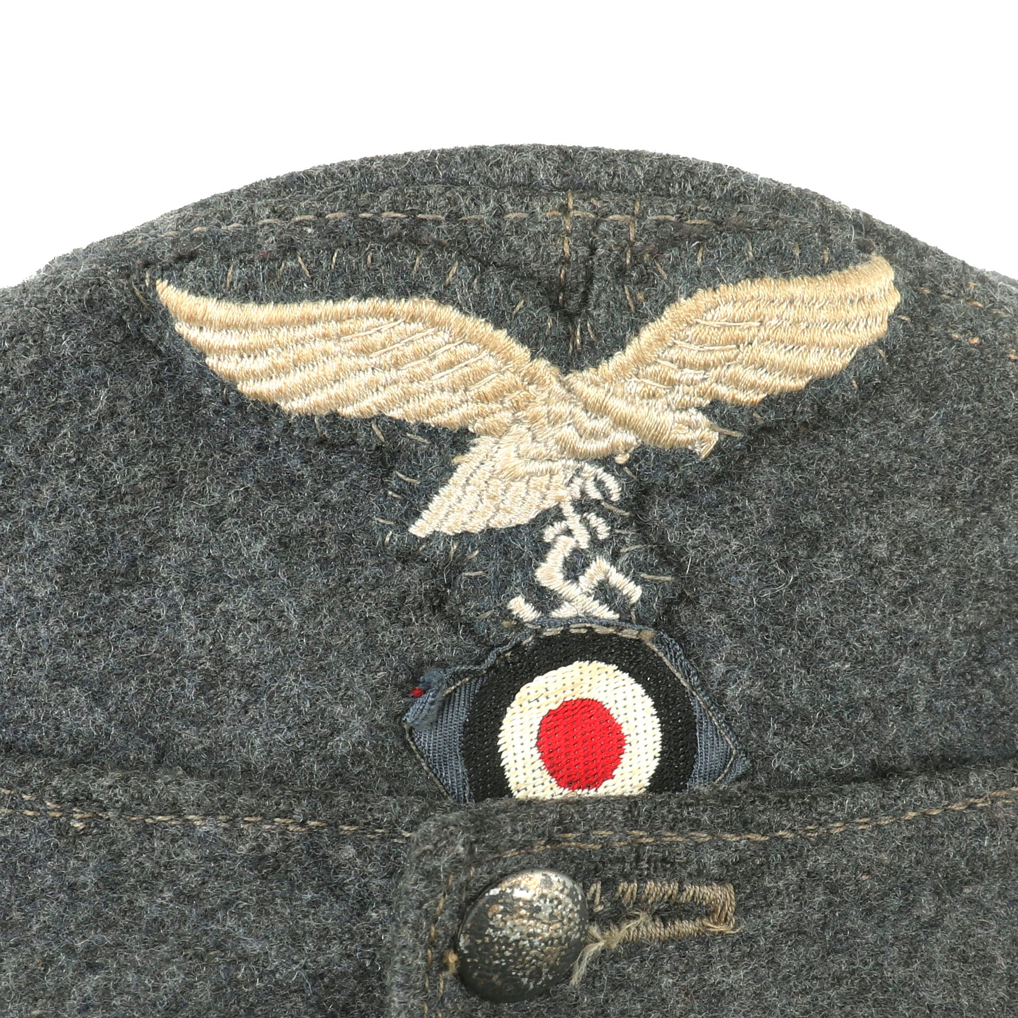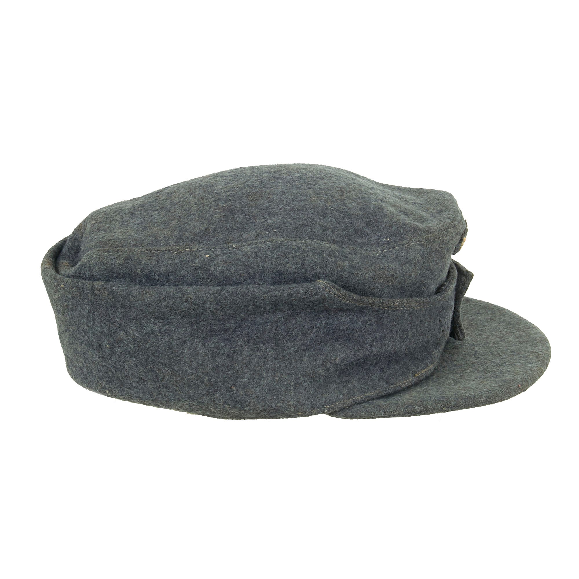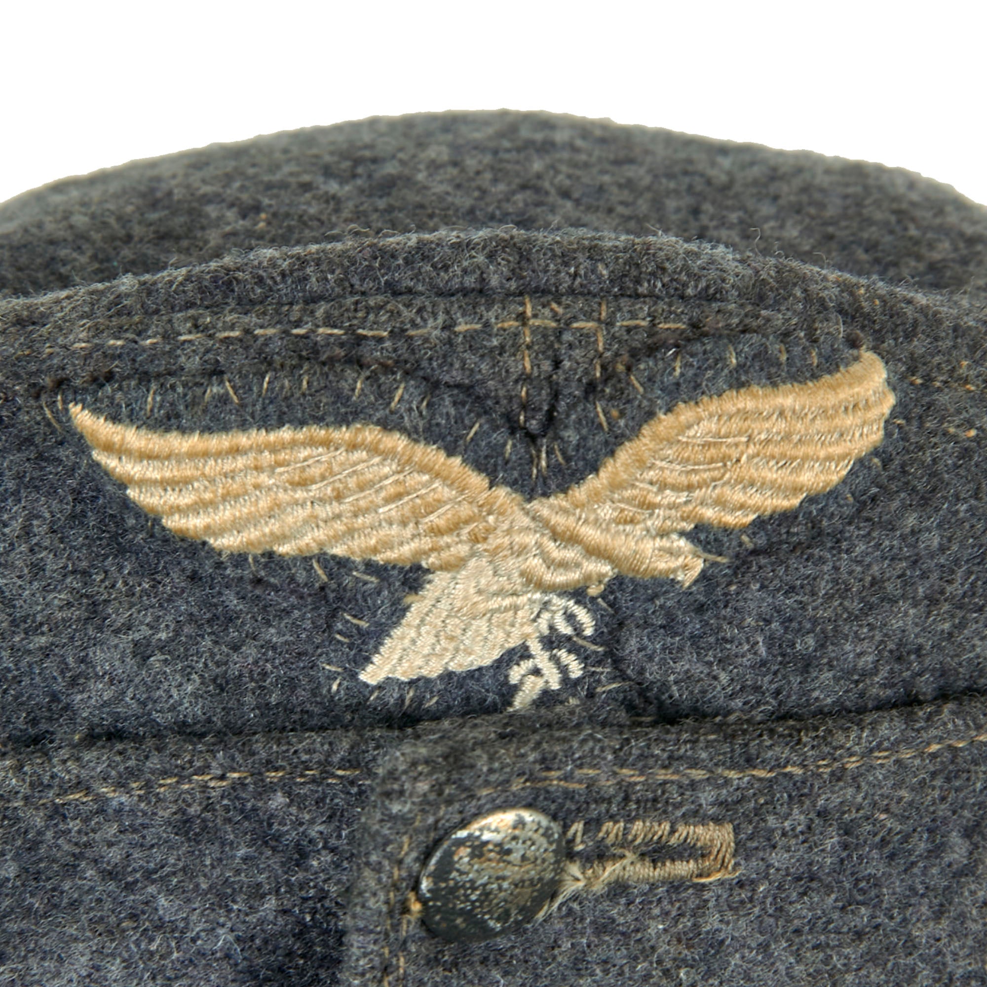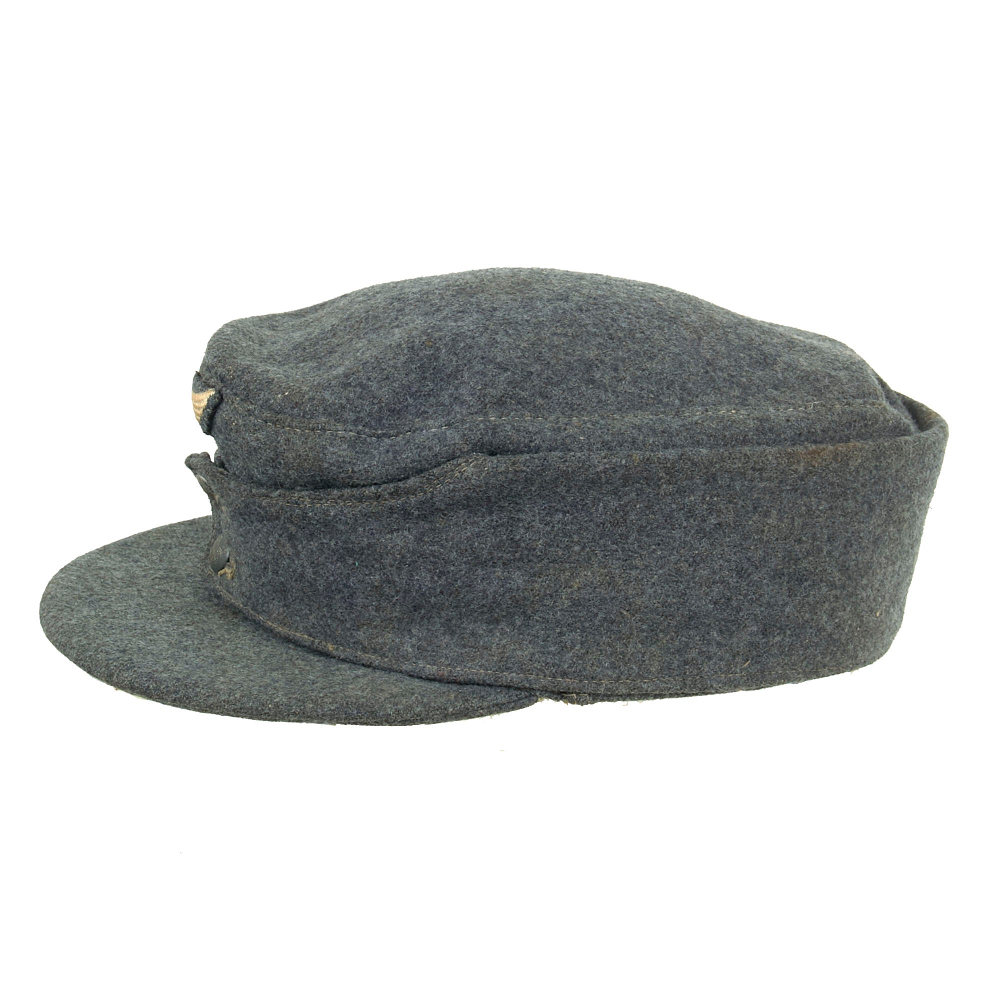 Original Item: Only One Available. This is a very nice example of a Luftwaffe M43 Einheitsmütze Wool field cap, with a great service used look. The cap is constructed of Luftwaffe blue Fliegerblau (Flyer's Blue) blue/grey wool, and has the correct "fold down" skirt for colder weather. It features two pebbled aluminum buttons to the front, securing the skirt, and has the correct rayon loops on the underside.