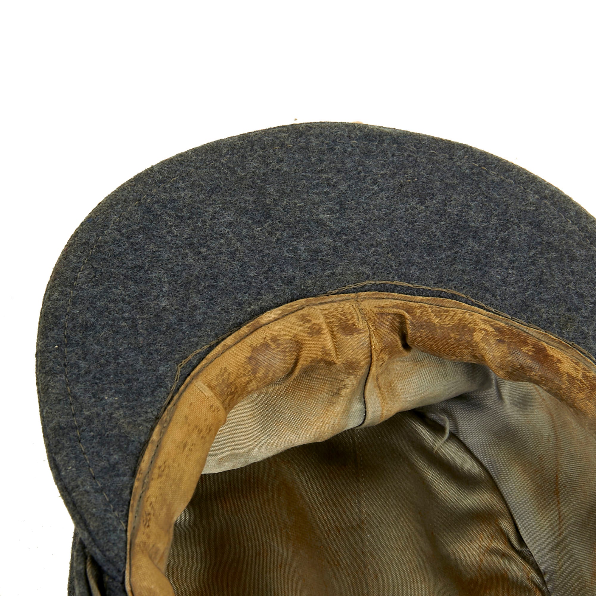 The visor is still in good condition, and the internal cardboard stiffener is still in great shape, with just a bit of a ripple. The exterior is in very good condition, with little sign of moth, if any. There are not any tears or repairs that we can see.