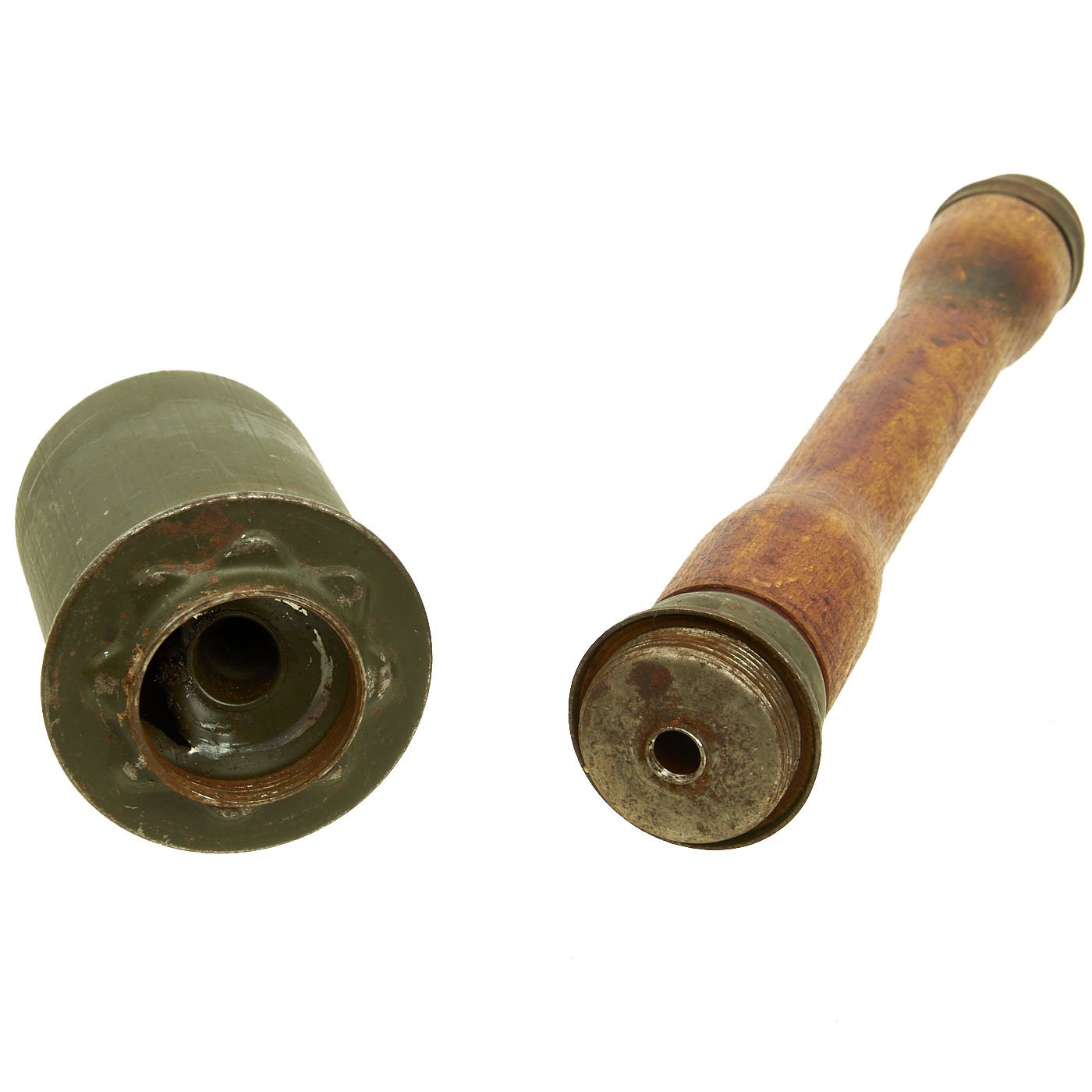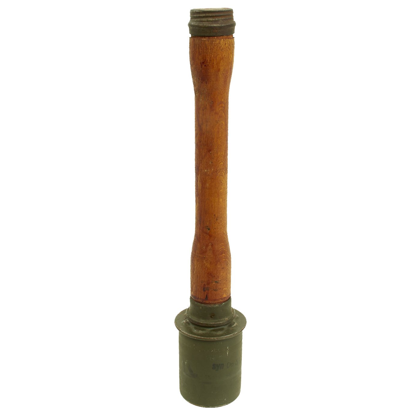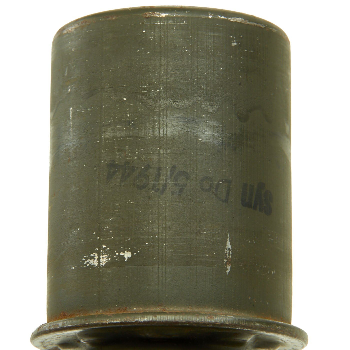 The warhead is in excellent condition and easily unscrews from the shaft. The interior even still has the detonator housing partly intact, something we almost never see! It still has almost all of the original green paint, which is very rare to see! The side of the grenade is paint stamped syn Do 5/1944, indicating it was assembled and filled by Westfälish-Anhaltische Spréngstoff AG (Westfalia-Anhalt Explosives Co.), Werk Sythen, a maker of propellant and explosives. Additionally, the top of the grenade is maker marked with gck 44, indicating that the housing itself was subcontracted out to Gebr. Schuppener, Siegwerk in Siegen. This was a maker of tools and metal wares, who would be well equipped to stamp grenade bodies.