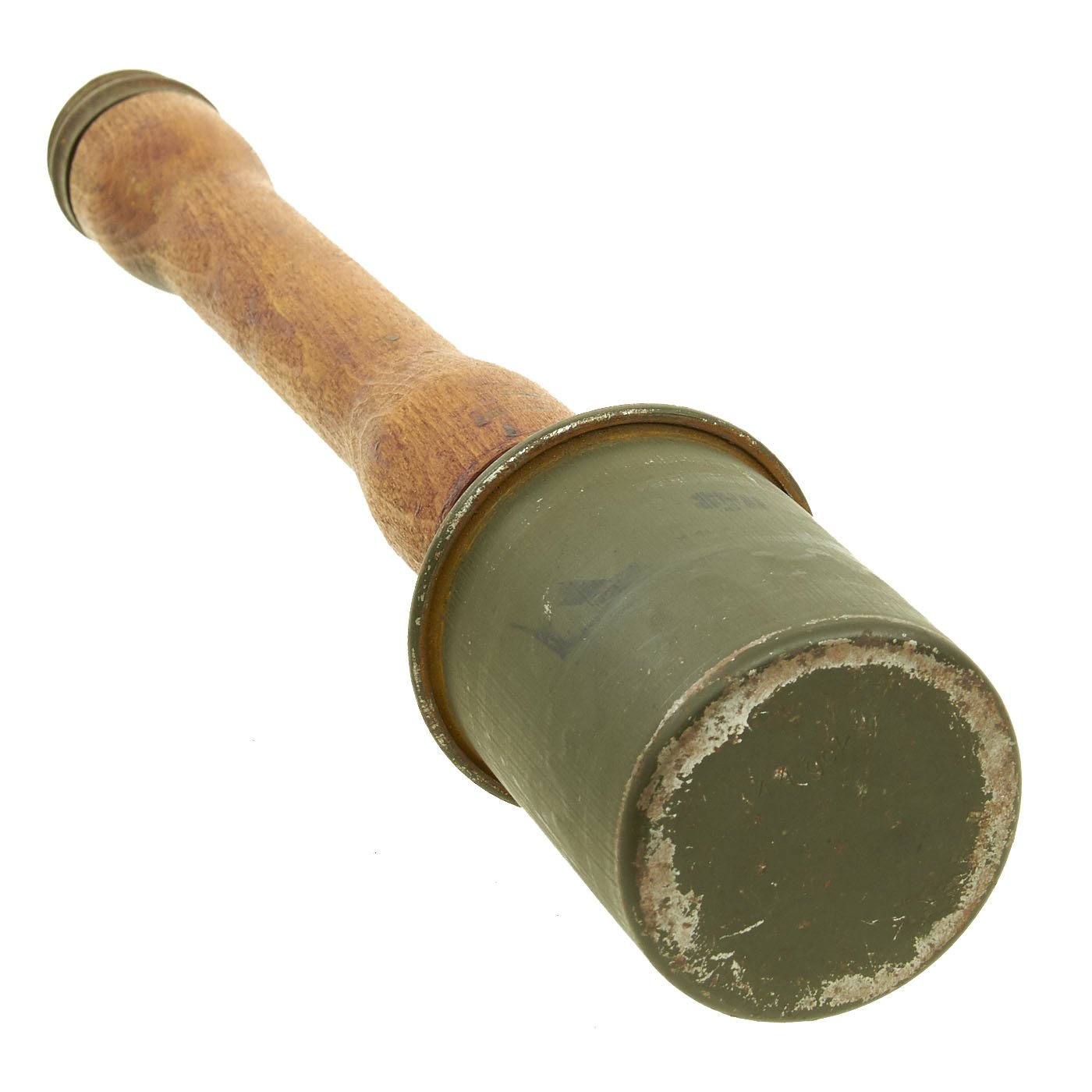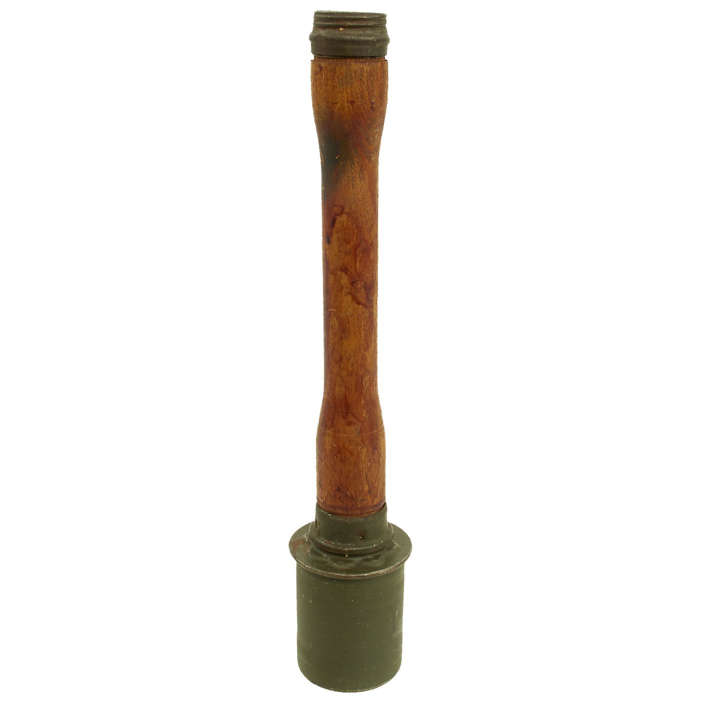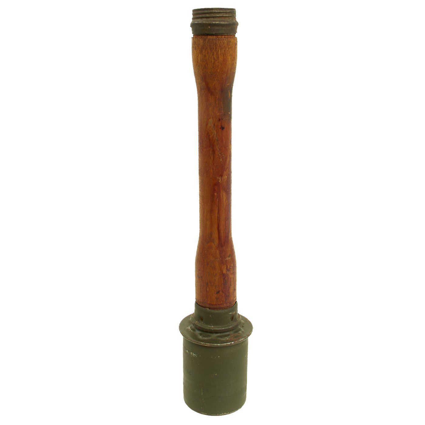 Original Item: Only One Available. This is an extremely rare M1924, M24, or "Stielhandgranate (stalk hand grenade) 24" German Stick Grenade, often called a "potato masher". This example, acquired from the family of a WWII veteran, has been demilitarized according to specifications by the BATF. The warhead still unscrews, though the detonator is not included. It still retains its original paint, and the original markings can be seen on the head of the grenade.