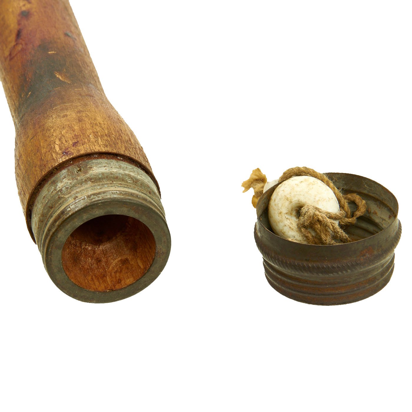 The wood shaft handle is also in excellent shape, and still has a lot of the original preservative paint intact. The lower screw cap is complete and unscrews, easily from the end fitting. It is not the type with a spring inside. The shaft is correctly hollow to allow the internal components and the porcelain "donut" bead with pull string are sttill present! Even part of the smaller bead on the detonator end is still present! We very rarely get these with the string and bead, so this is a real treat!
