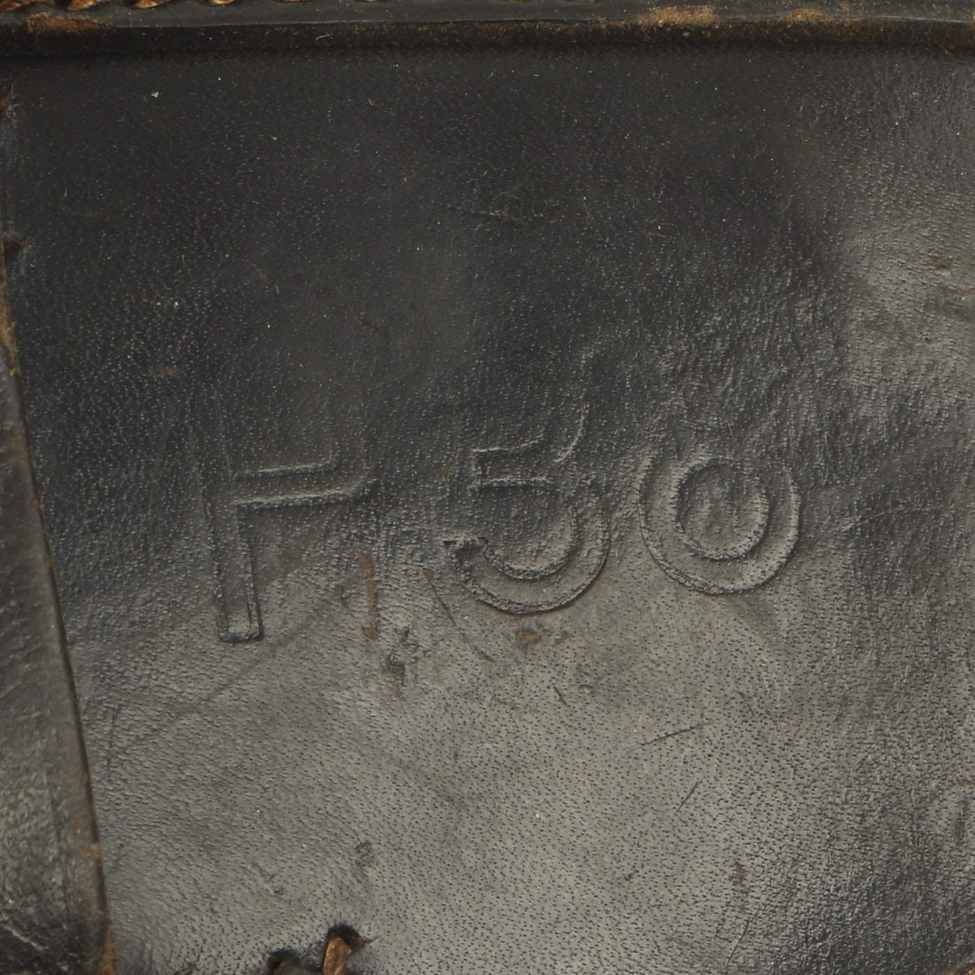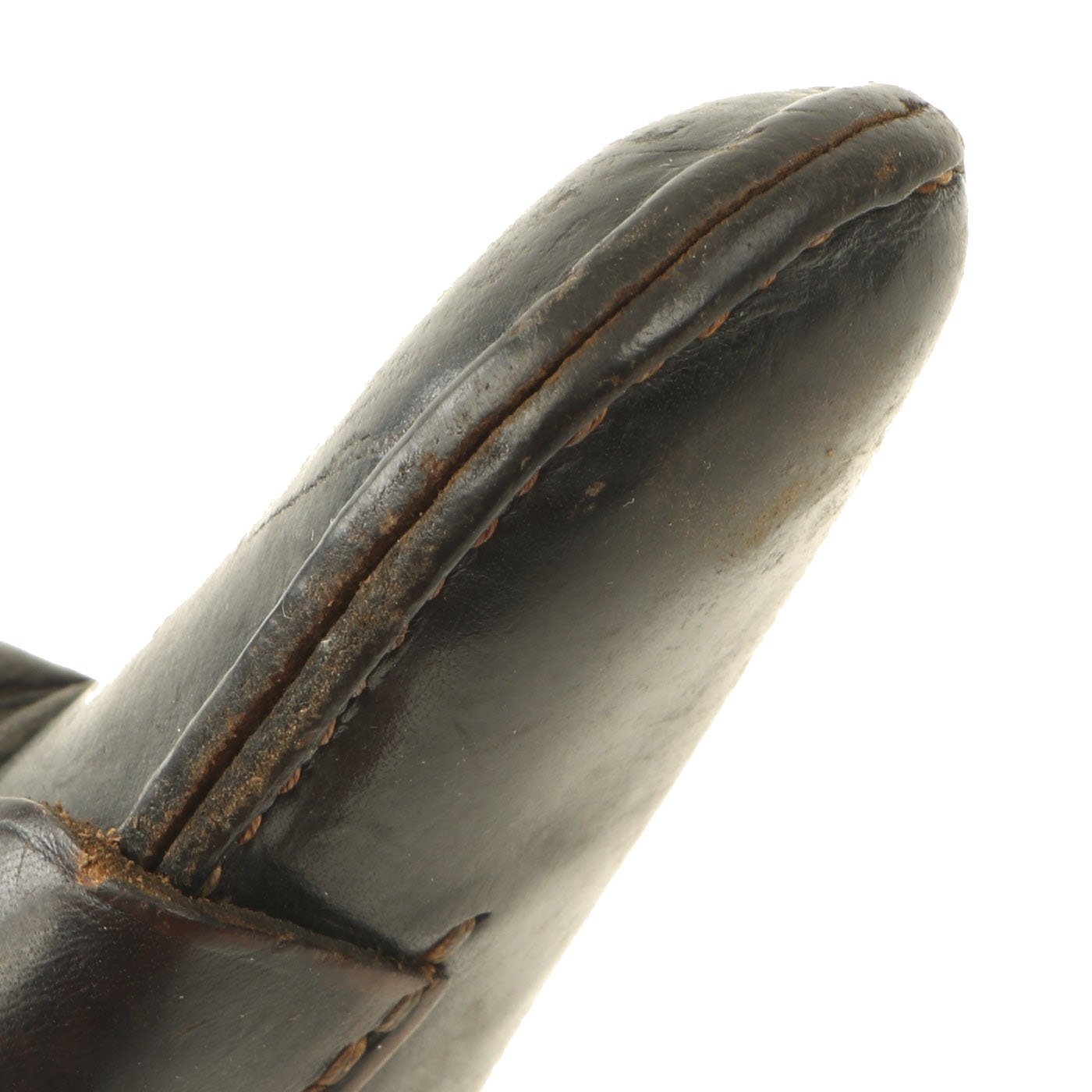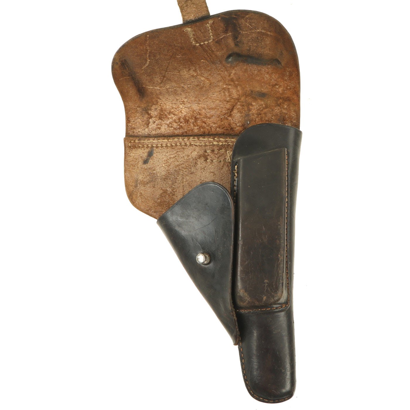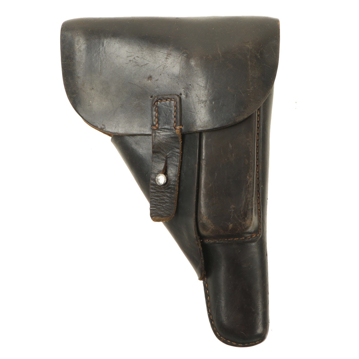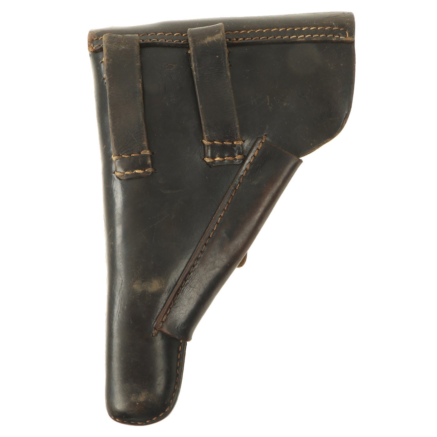 Original Item: Only One Available. Recently purchased at an estate sale, this is a very nice condition WWII production black finished leather holster for the standard issue Walther P-38 pistol in 9mm. It is nicely maker marked and dated on the back with jhg / 44. This indicates 1944 production by Gustav Genschow ;& Co. AG, Abteilung Lederwaren-Fabriken (Leatherware Factory Department), located in Alstadt-Hachenburg, Germany. This was a sporting goods company that manufactured holsters, pouches, map cases, and other items, according to GERMAN MILITARY LETTER CODES 1939-1945 by John Walter. There is also Waffenamt inspection mark WaA41 above the maker mark.