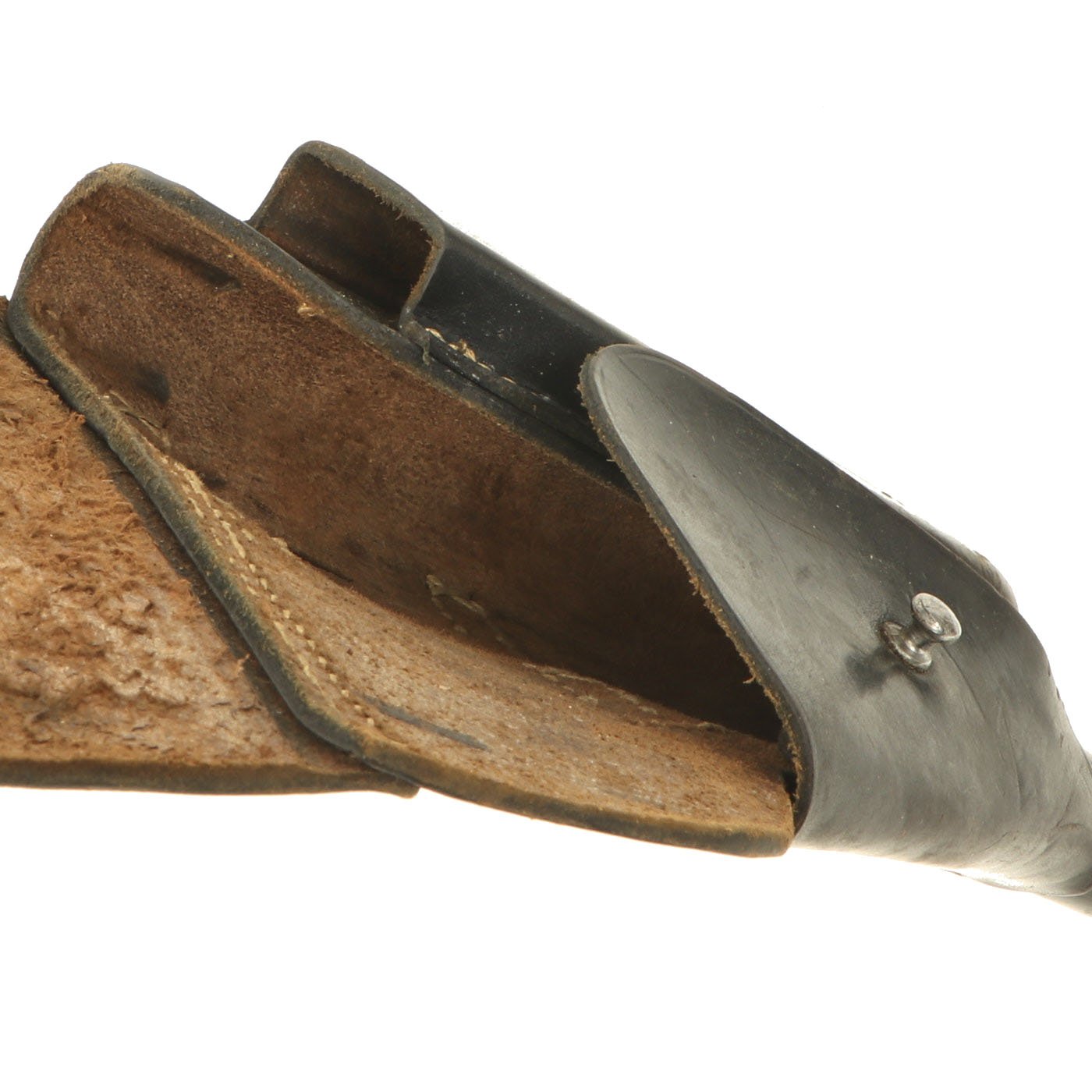 The holster is correctly marked P38 on the upper right rear, and appears to have seen moderate use while in service. There are some light markings and stains on the inside of the holster indicating that it did hold a pistol for a time. The exterior also has wear markings on the finish. However all of the stitching is still intact, making this a solid example.
