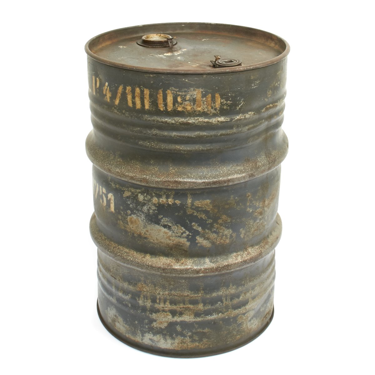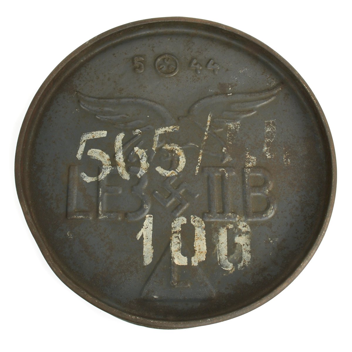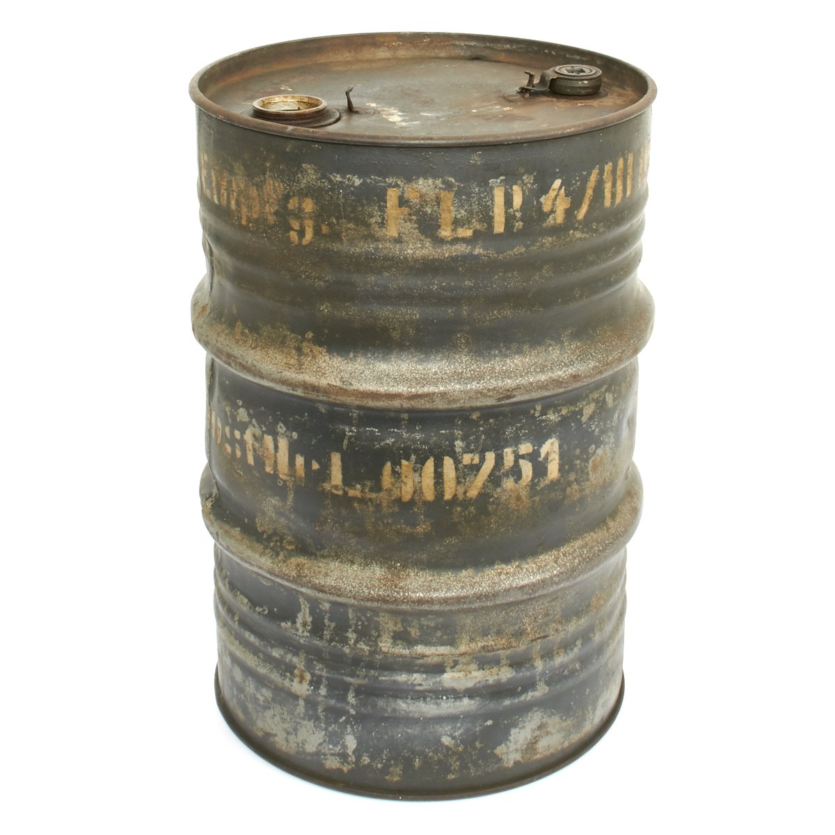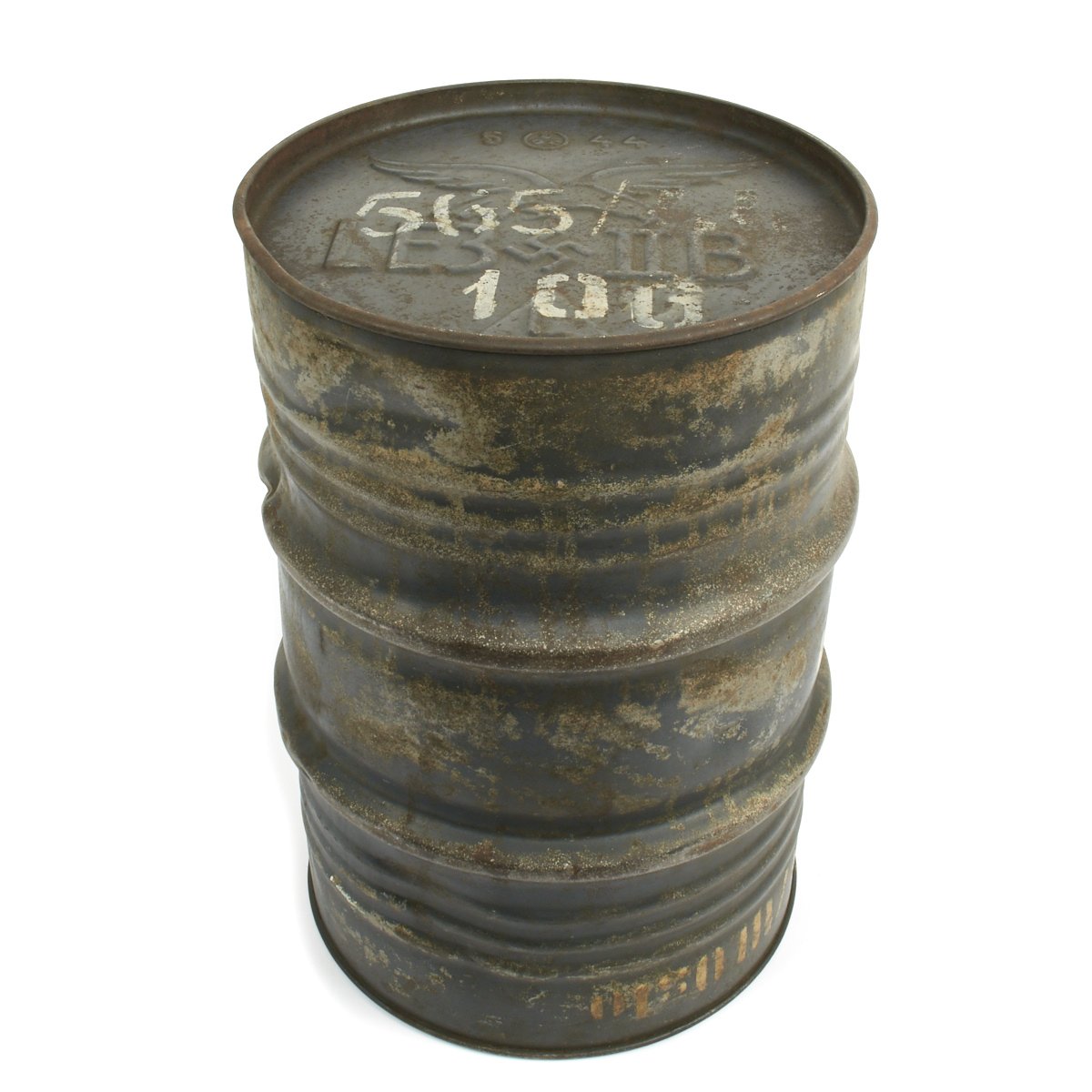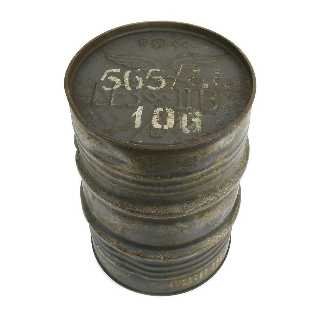 Original Item: Only One Available. This is a May 1944 dated Luftwaffe 50L fuel oil drum that measures approximately 23 inches (58cm) high with a 15 inch (38cm) diameter. The base has an embossed Luftwaffe Eagle with: