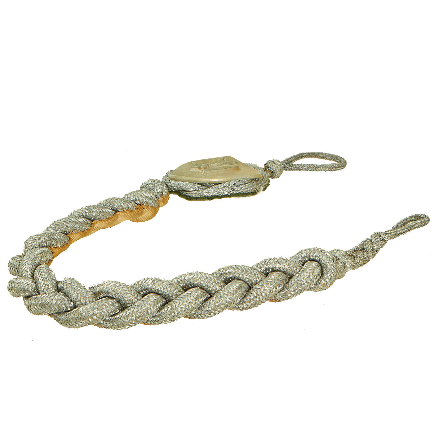 This is a very nice 1st Pattern Heer / Army Marksmanship Lanyard, Grade1 (No Acorns). This earlier version has a simple Heer Shield Medallion on the top of the liner. The condition is very good, showing only light wear, and no major deterioration to the felt backing of the badge but does have moth nips present. The bullion portions are still bright and look great.