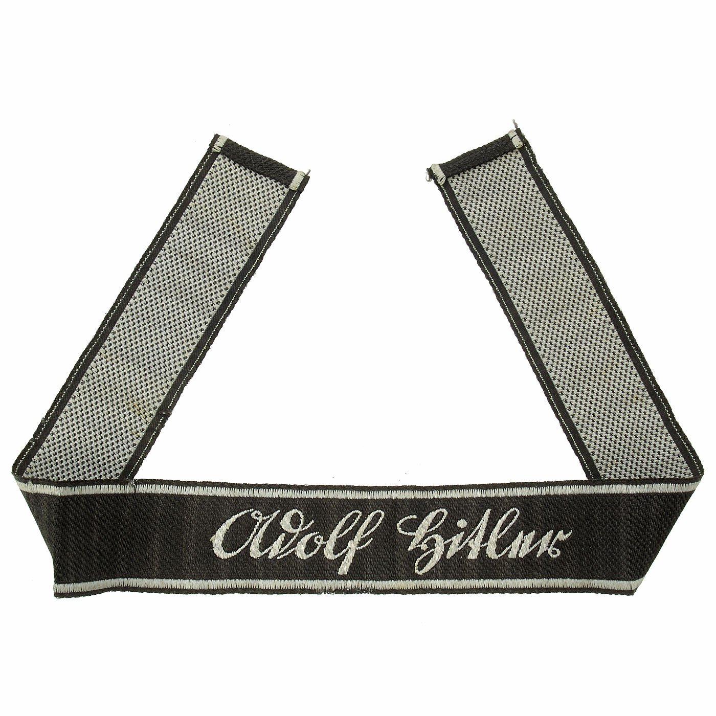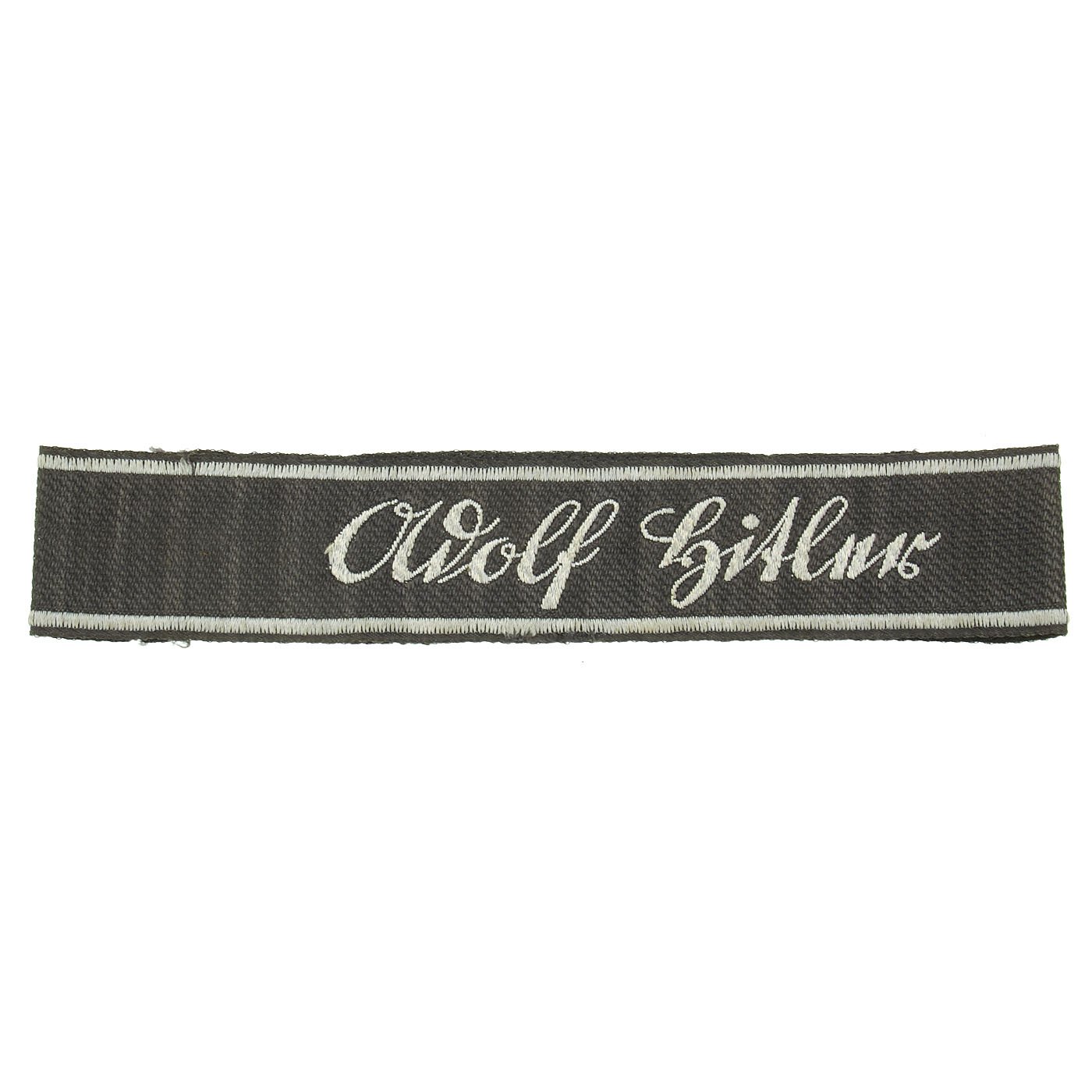 Original Items: Only One Available. This is an excellent unissued example of an Adolf AH script Cuff Title, as worn by the 1st SS Panzer Division "Leibstandarte SS Adolf AH". It shows no signs of ever having been attached to a uniform. It is woven from black and gray thread in the typical German "BeVo" style.