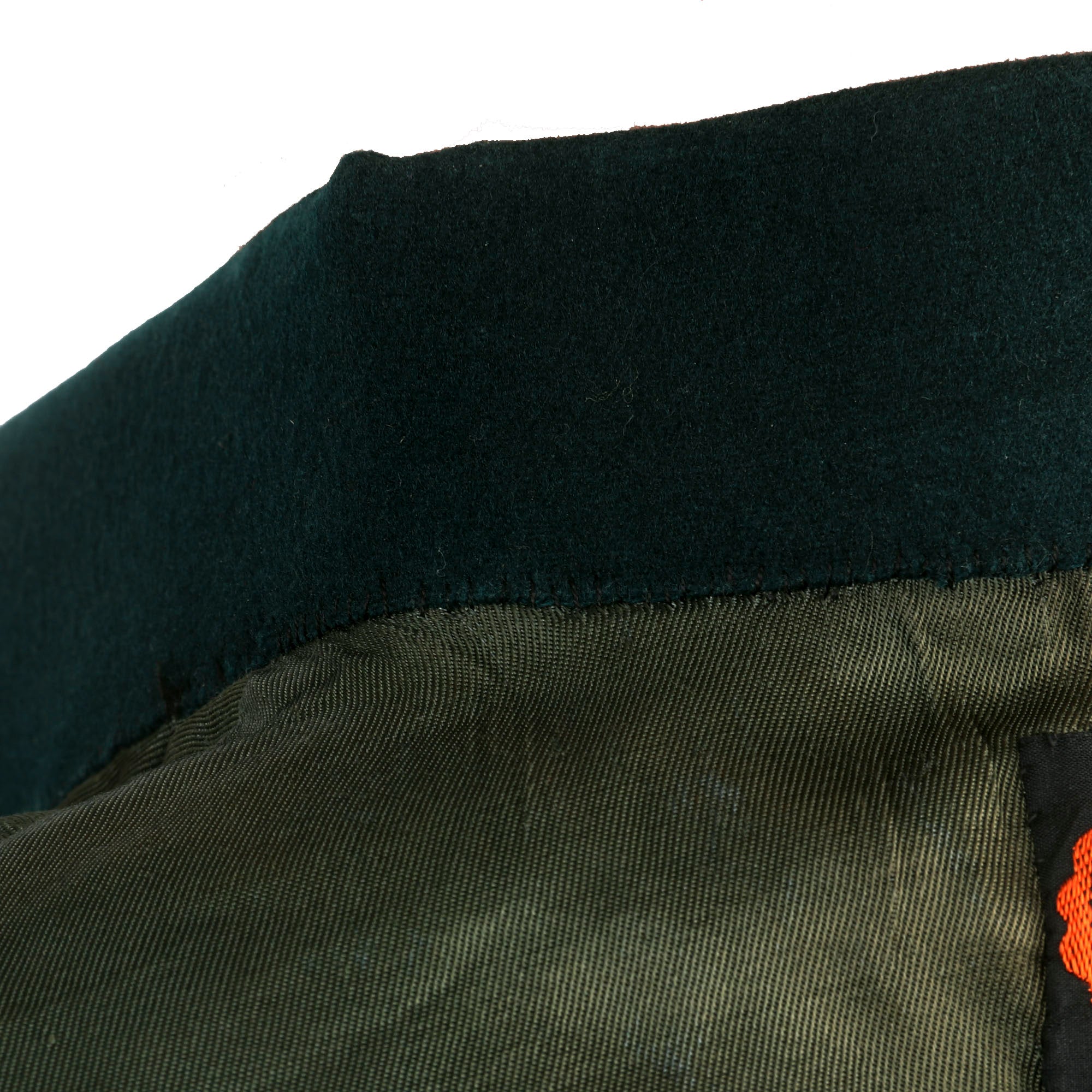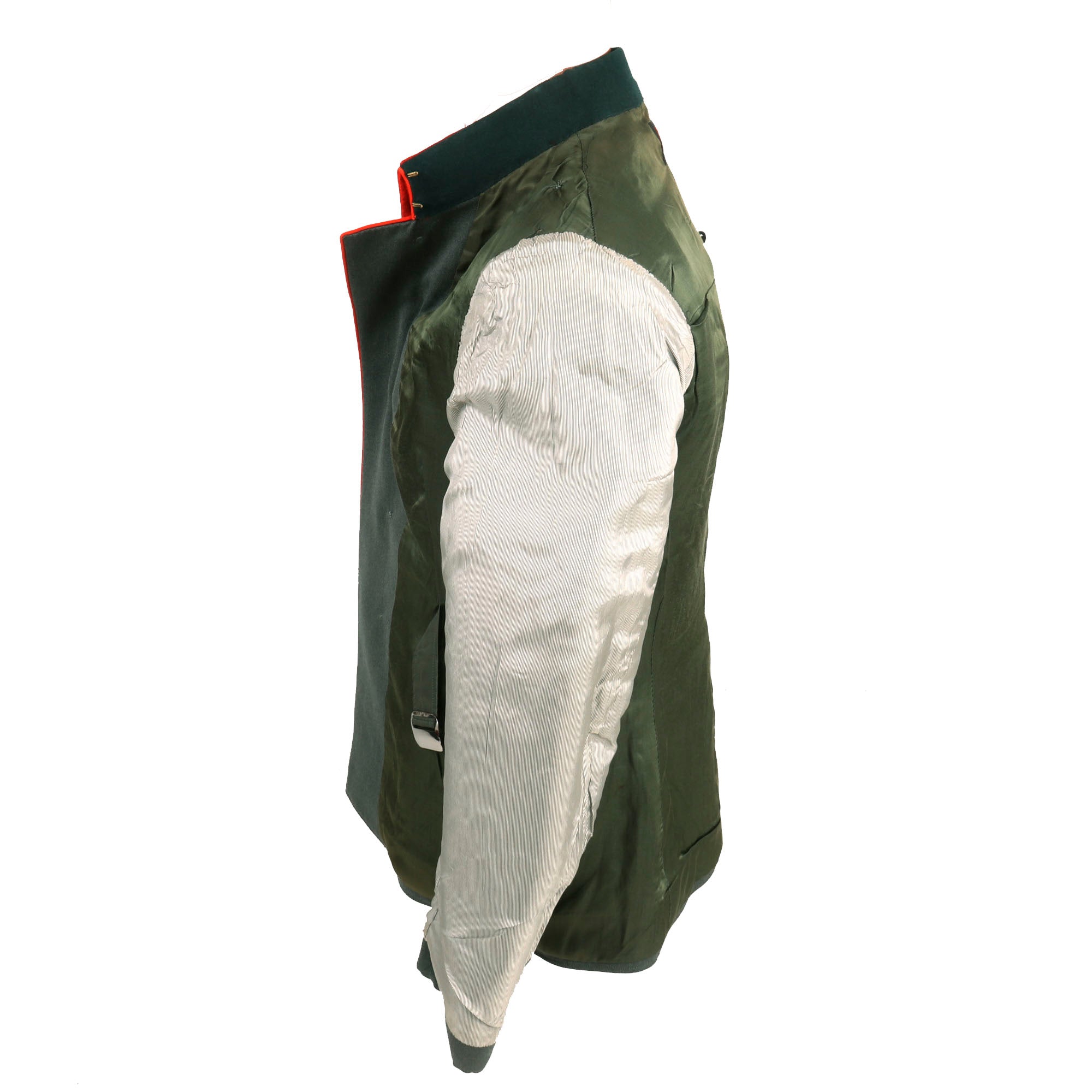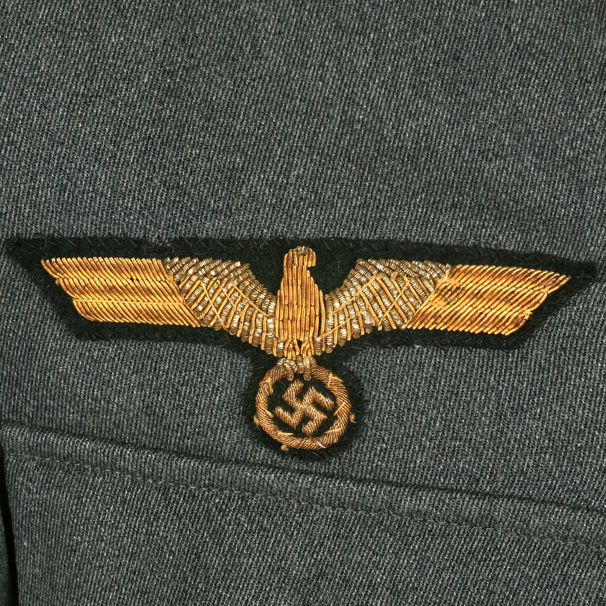 On the right breast is a fine quality gold bullion eagle, constructed of rolled, twisted, and flat hand embroidered gilt stitching with gold cotton retaining threads, placed onto a dark bottle green wool backing. It is neatly stitched to the outer layer of fabric, which is still bright and shiny. really a lovely looking tunic, showing just a bit of wear.