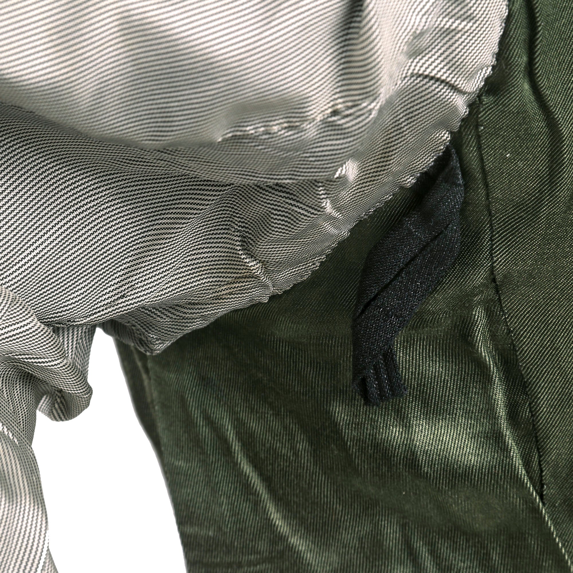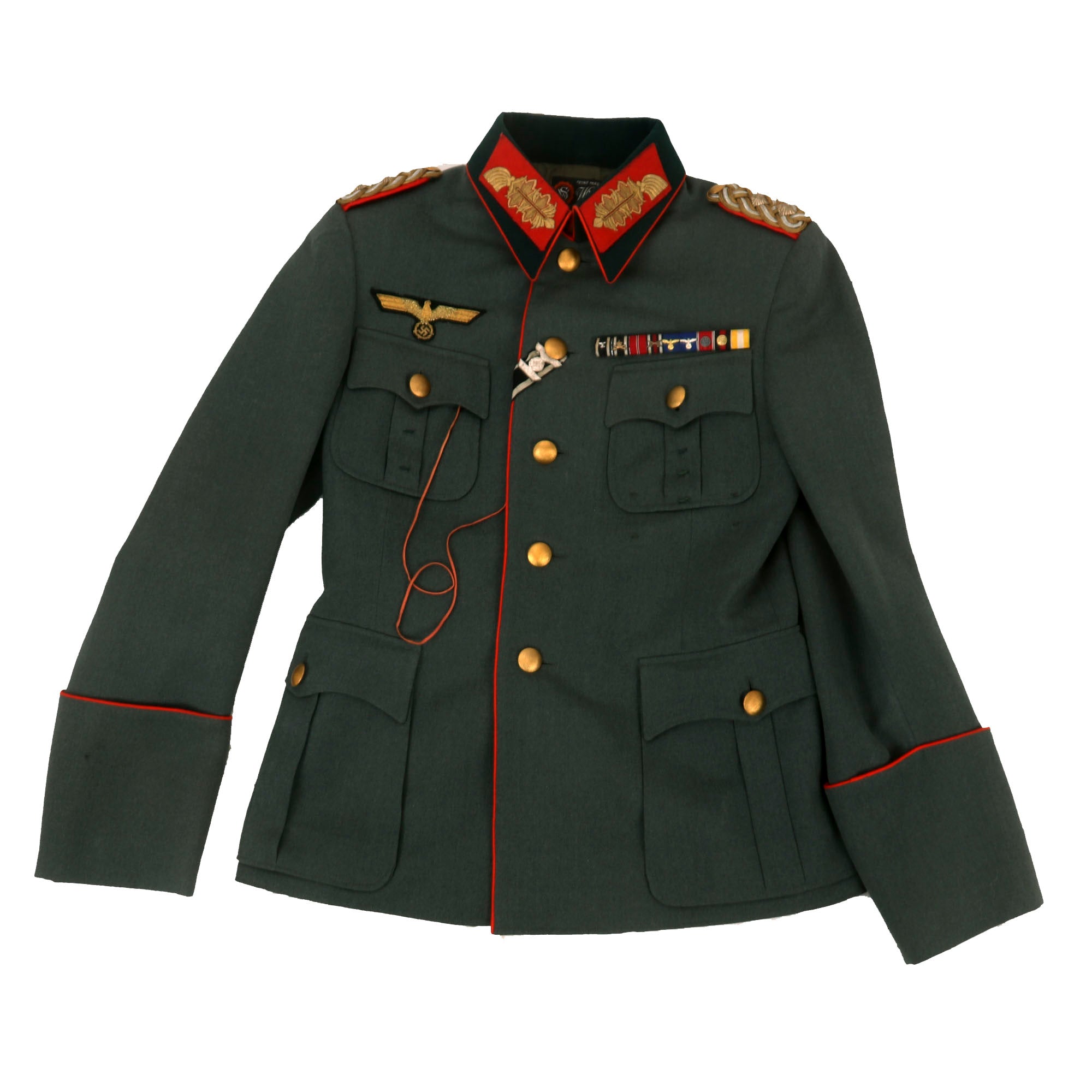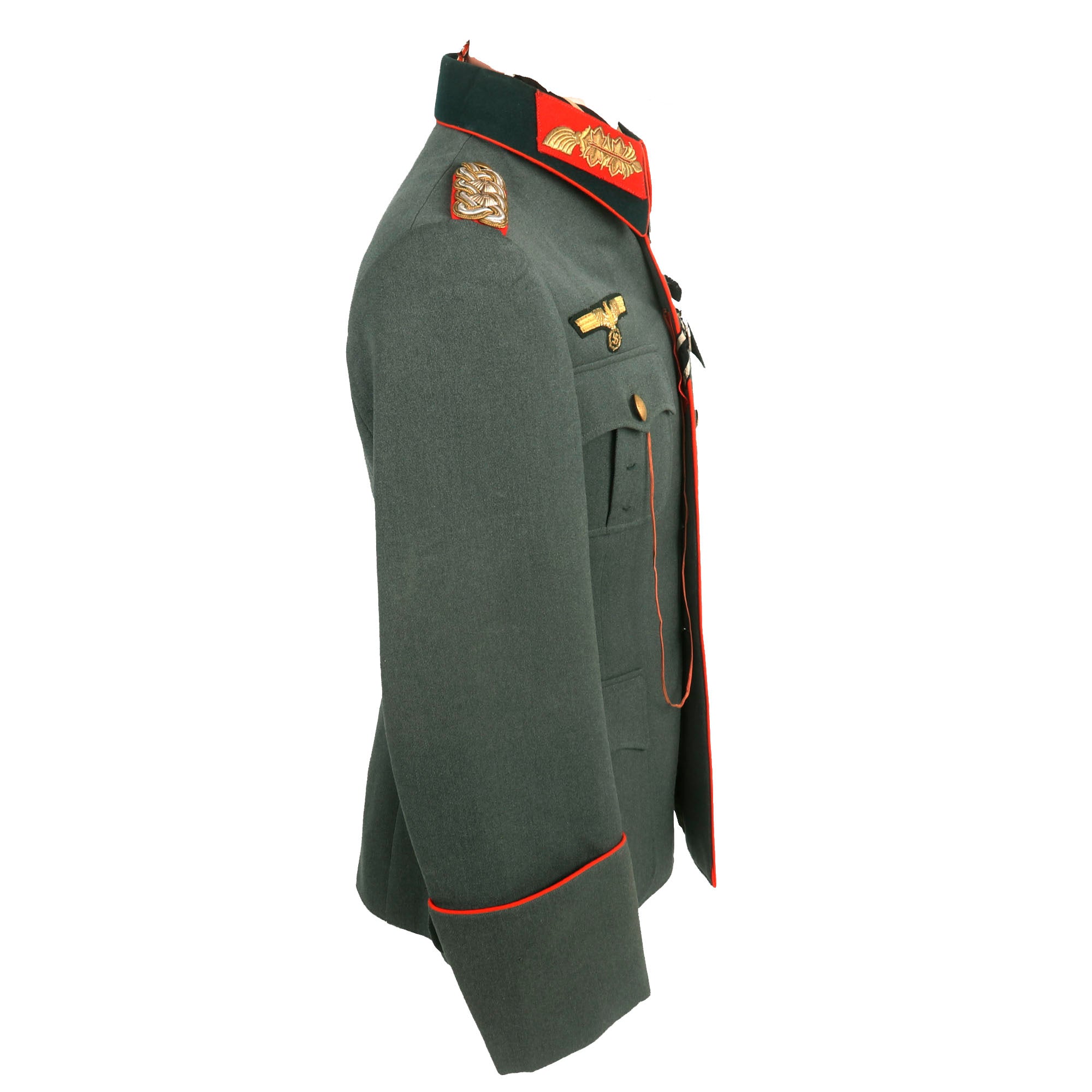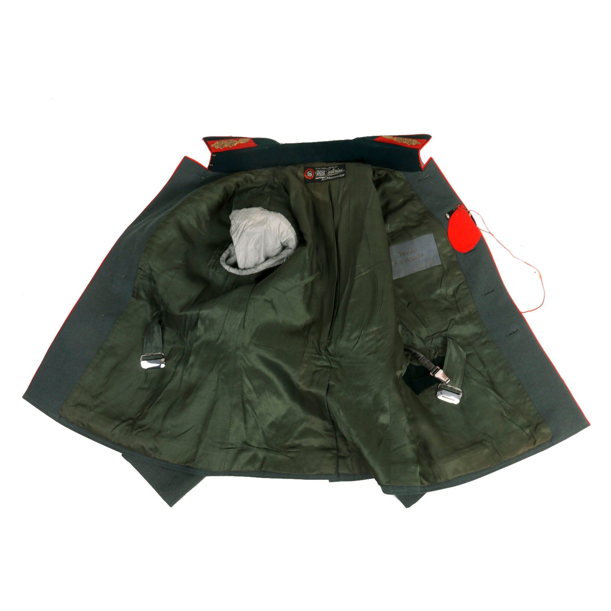 The tunic is really a great example of a private purchased Wehrmacht Heer Generäle Dienstbluse (General Officer Service Tunic). It is constructed from a fine quality field-gray "whipcord" wool woven exterior, with a green cotton-rayon blended interior lining. The sleeves are lined with the usual blue / gray striped rayon. The collar is constructed of flaschengrün (dark bottle-green) wool, and is adorned by a set of General grade collar tabs, known as alt-Larisch or Arabesque style, which were used for all General ranks below Feldmarschall. These have the correct red backgrounds with gold bullion embroidery. and the collar edge, front closure, and the cuffs are piped with red as well.