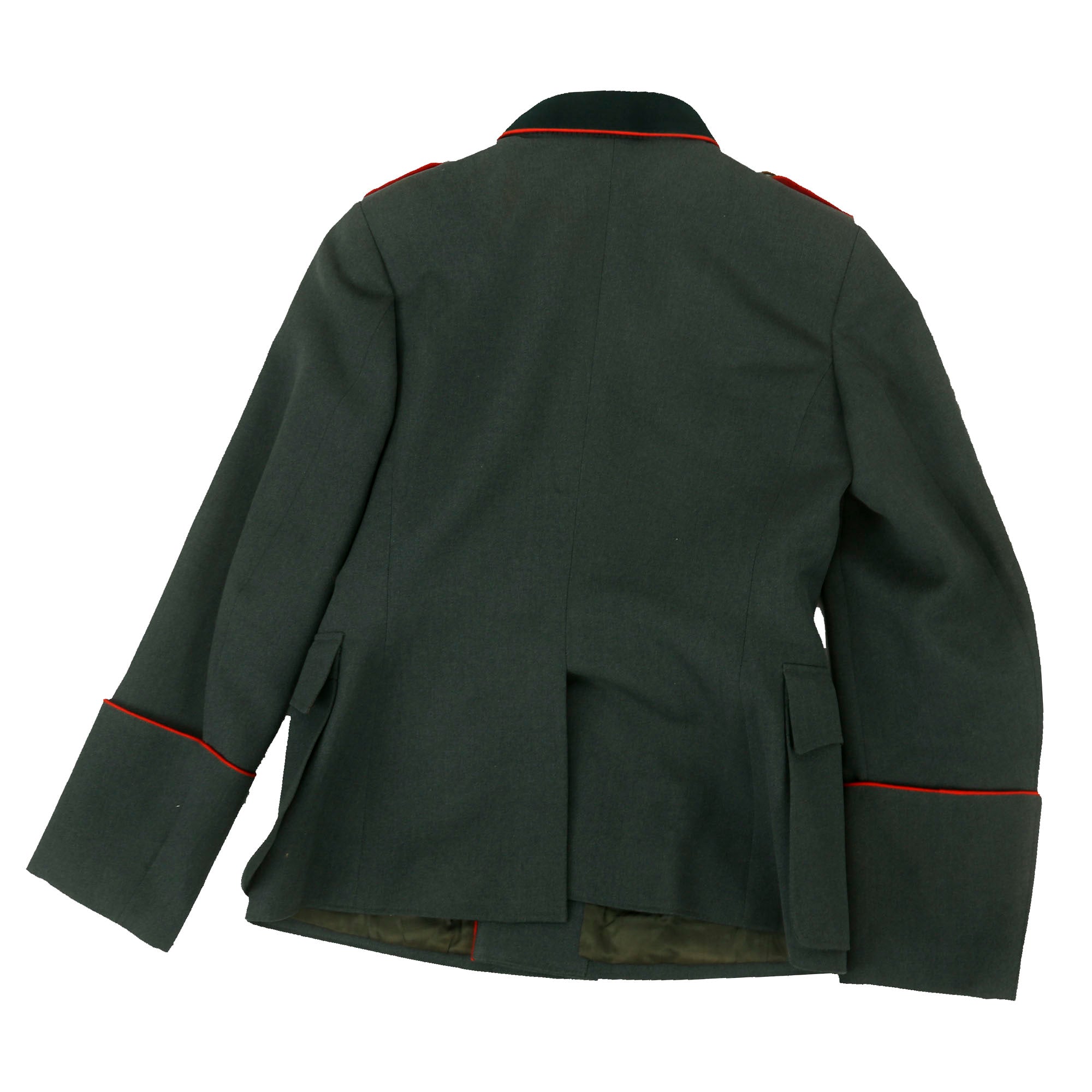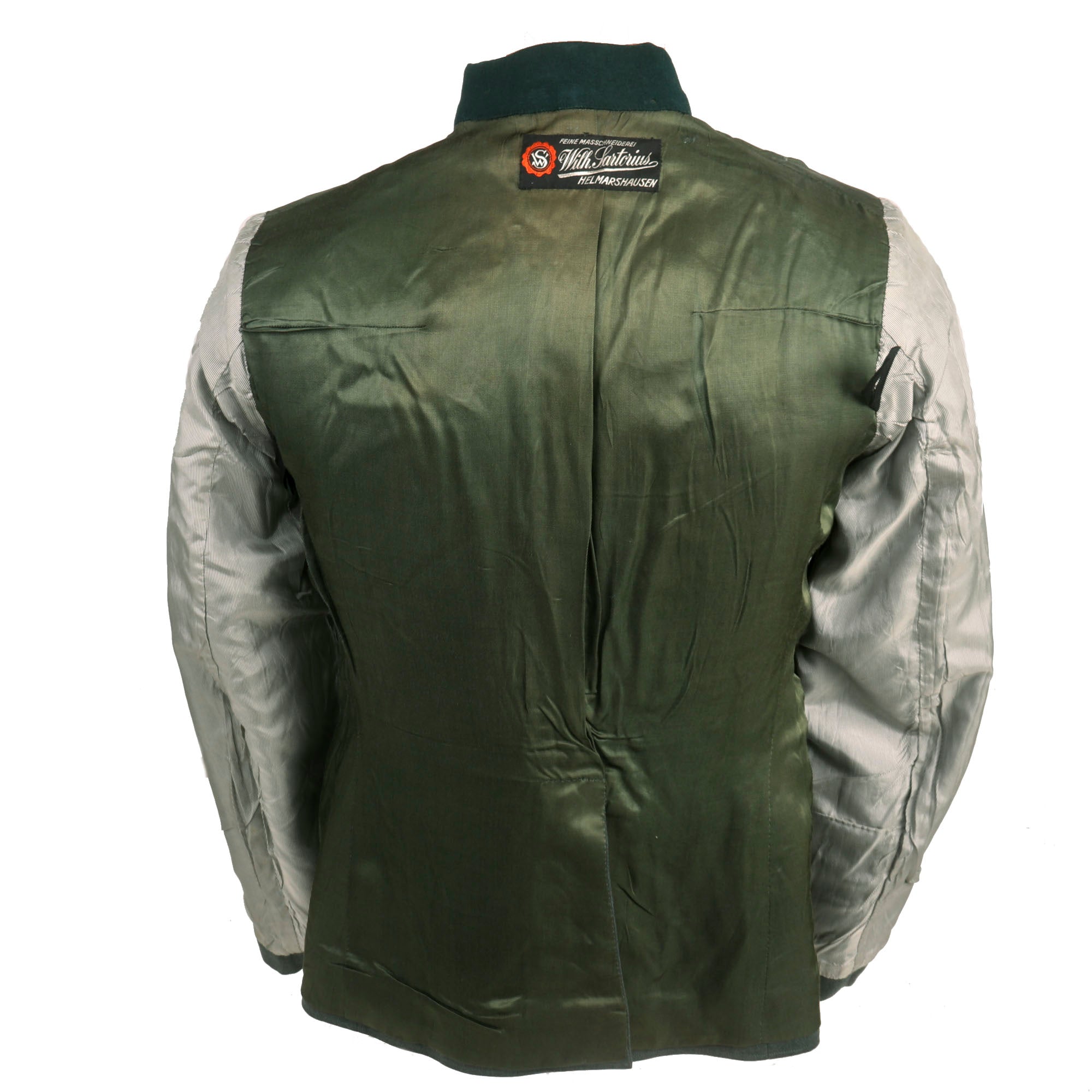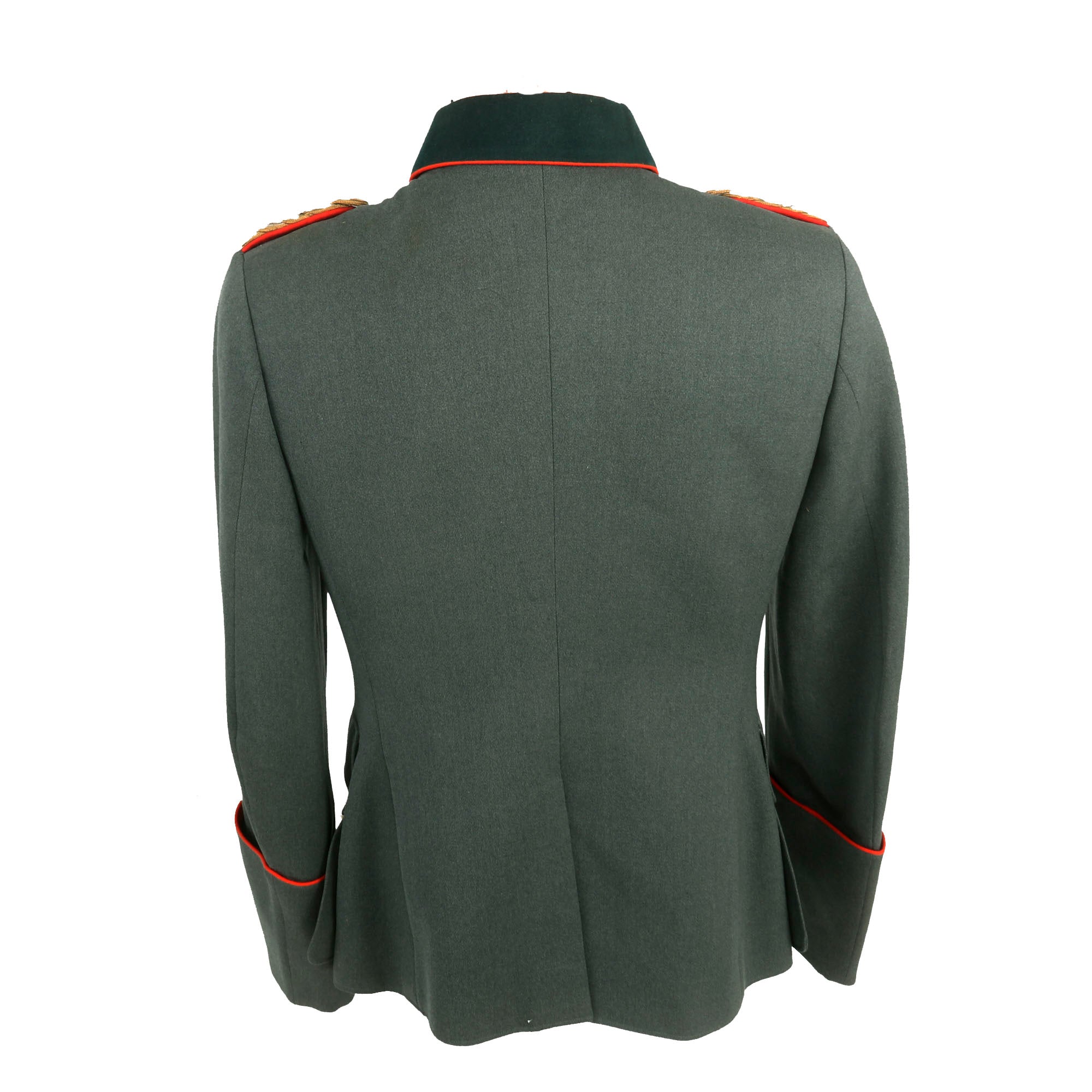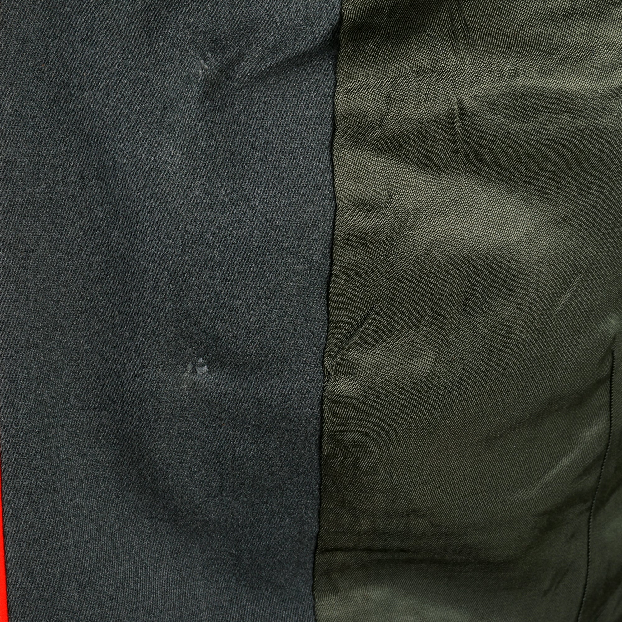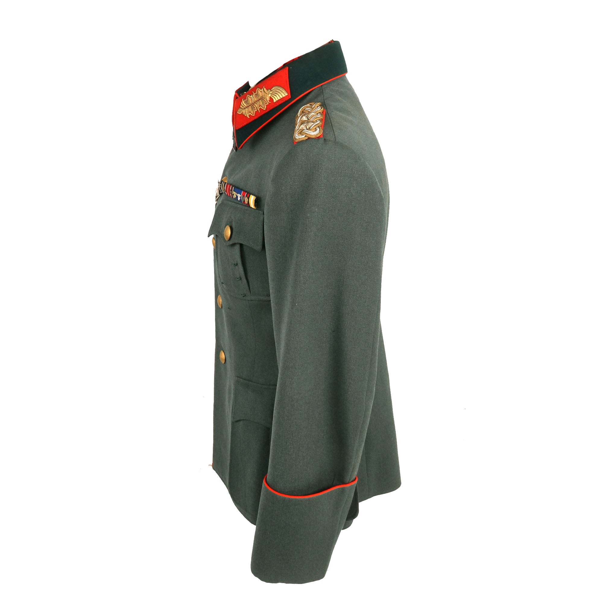 The tunic is really a great example of a private purchased Wehrmacht Heer Generäle Dienstbluse (General Officer Service Tunic). It is constructed from a fine quality field-gray "whipcord" wool woven exterior, with a green cotton-rayon blended interior lining. The sleeves are lined with the usual blue / gray striped rayon. The collar is constructed of flaschengrün (dark bottle-green) wool, and is adorned by a set of General grade collar tabs, known as alt-Larisch or Arabesque style, which were used for all General ranks below Feldmarschall. These have the correct red backgrounds with gold bullion embroidery. and the collar edge, front closure, and the cuffs are piped with red as well.