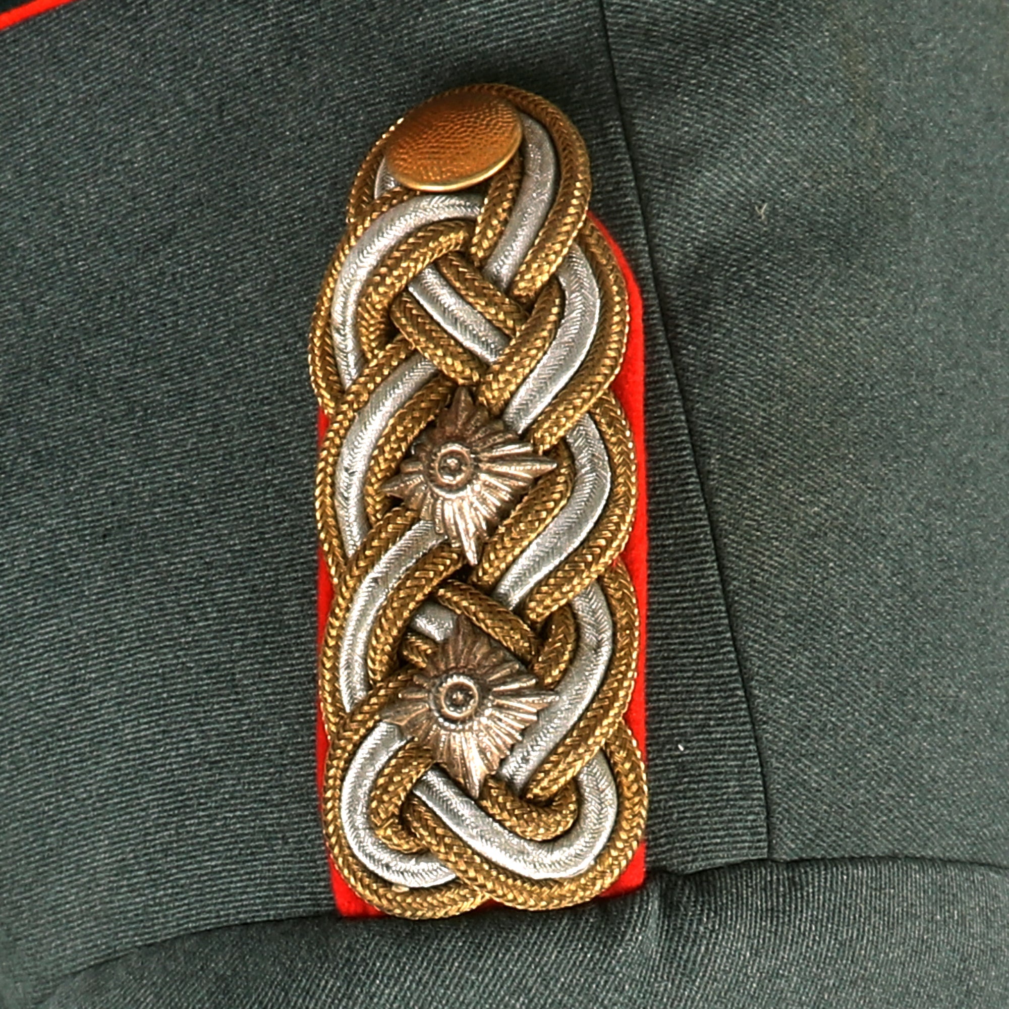 Each shoulder is decorated with the sew-on style General der Panzertruppen rank shoulder boards. They are both constructed out of a row of interwoven silver and gold bullion strands in the typical Russian braid style in an interlocking weave pattern ending at a pebbled gilt metal (magnetic) button. There are two rank pips installed, correct for a General der Panzertruppen and other specialized General ranks equivalent to a U.S. Army Lt. General.