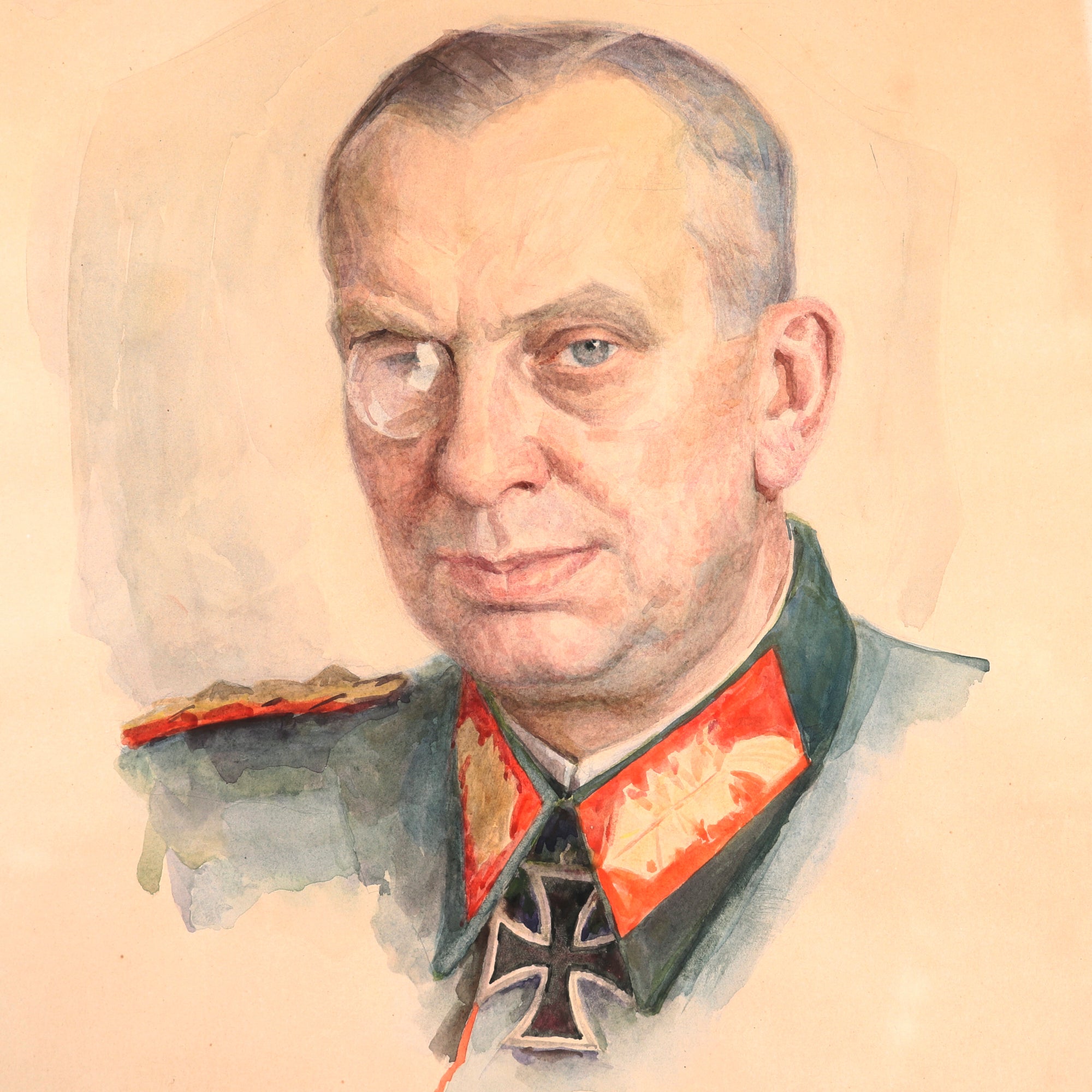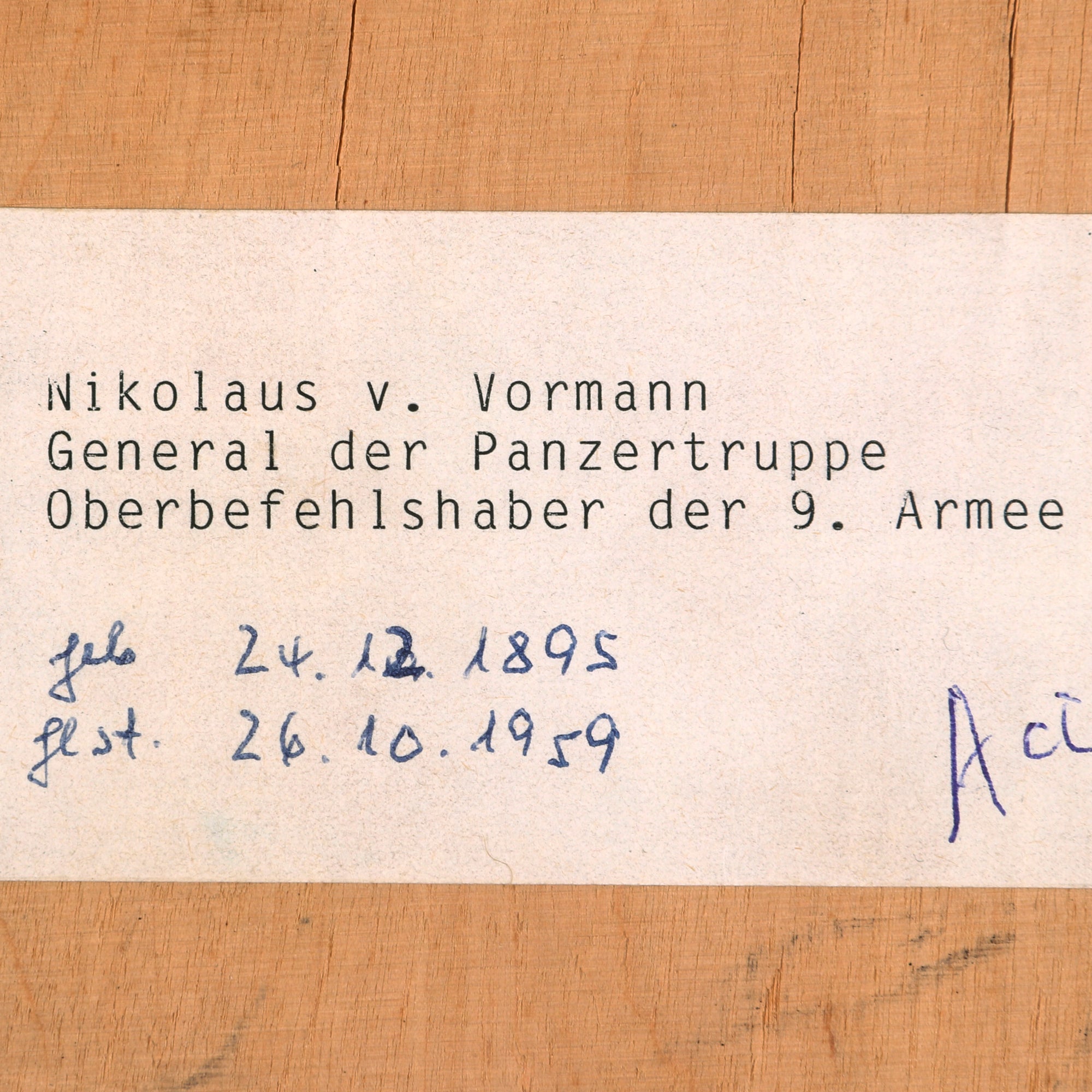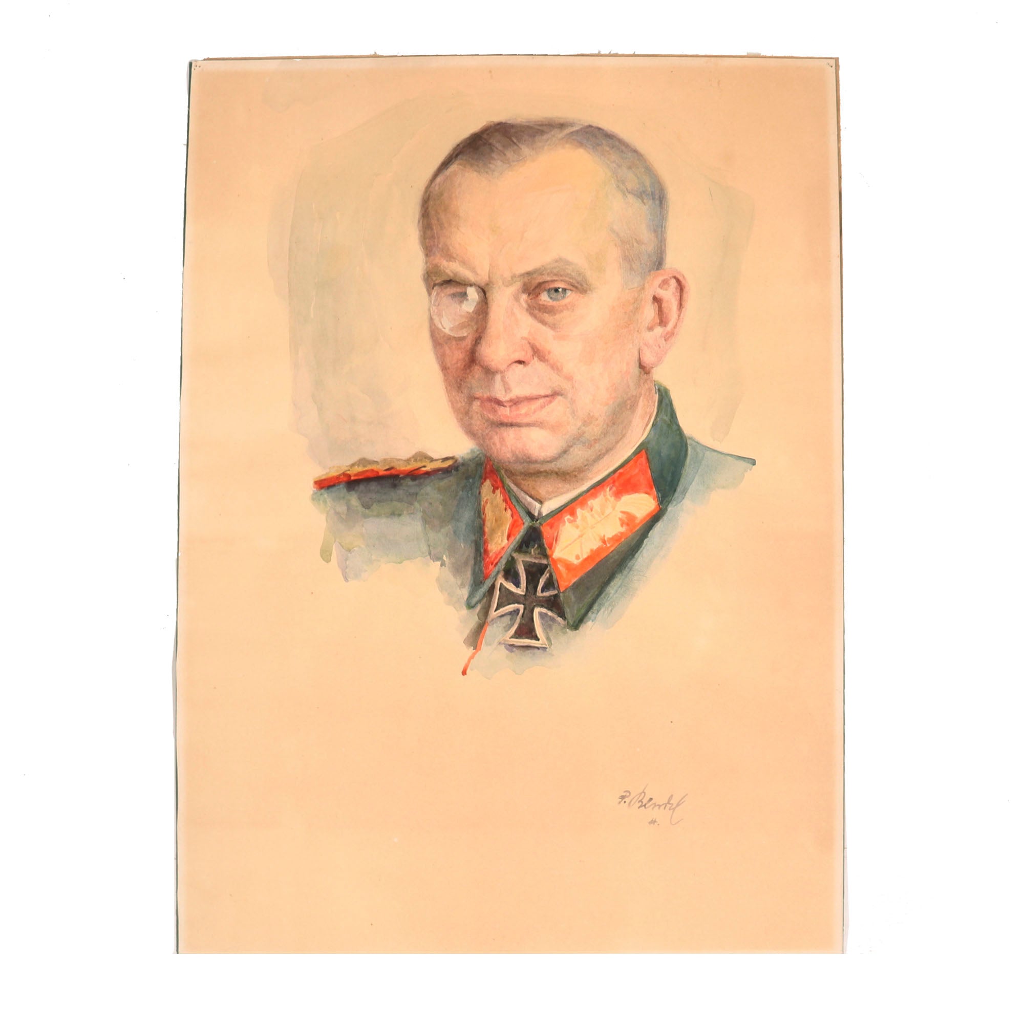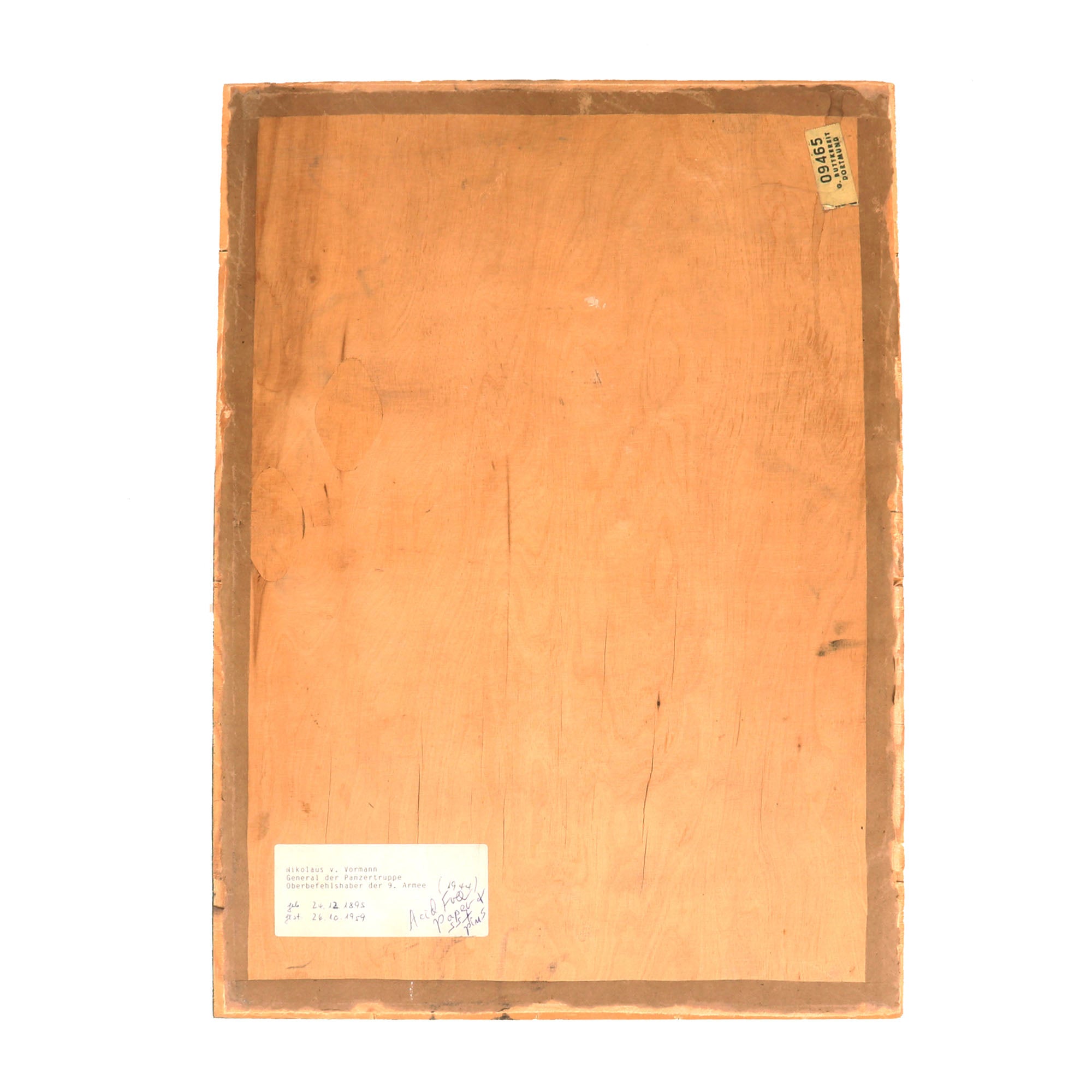 ● A fantastic 14 1/8" x 19 5/8" watercolor portrait of Nikolaus von Vormann, signed by the artist and dated 44. It shows him at the General der Panzertruppen rank, and also displays his Knights Cross of the Iron Cross. It is in very good condition, and was originally glazed and framed, however the frame was lost at some point.