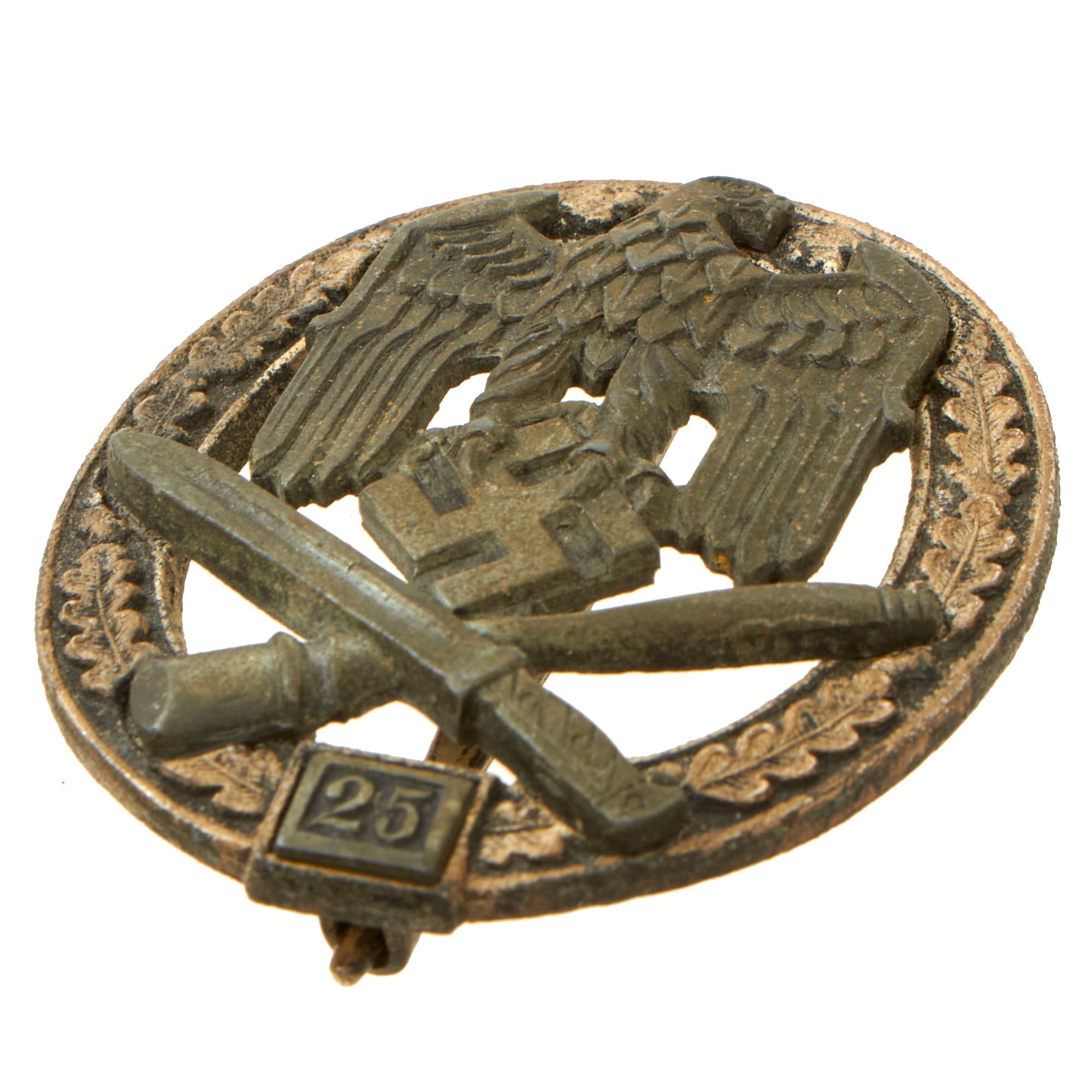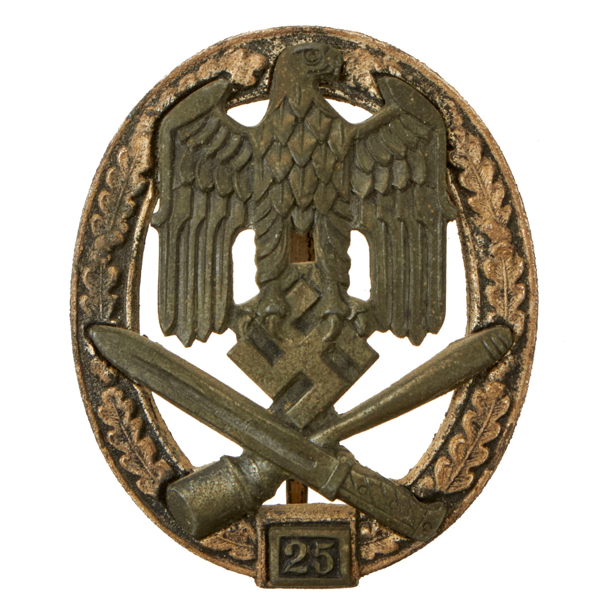 Original Item: Only One Available. Known in German as a Allgemeines-Sturmabzeichen mit Einsatzzahl 25 (General Assault Badge for 25 Engagements), this excellent badge is constructed of silvered and patinated zinc. The obverse (front) comprised of an oval oak leaf wreath, joined together at the bottom by a silver plaque bearing a raised number 25, overlaid by an art-deco style Heer closed-wing German national eagle clutching a mobile swas, above a crossed bayonet and stick grenade. The reverse with a barrel hinge and banjo-style pinback meeting a flat wire catch, with four visible rivets securing in place the obverse eagle. It is maker marked on the rear of the wreath with the RK in a circle logo of Rudolf Karneth of Gablonz, which today is Jablonec nad Nisou in the Czech Republic.