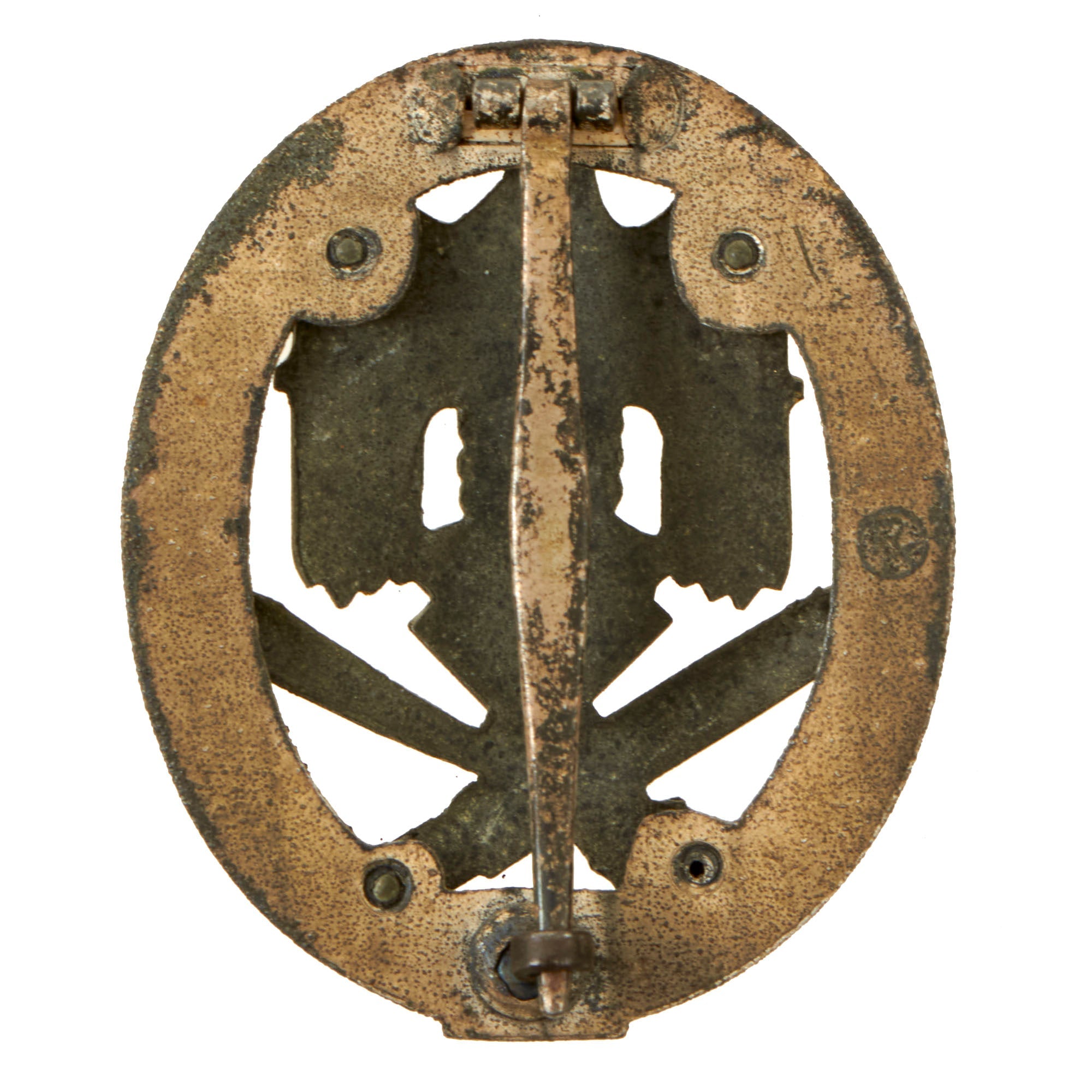 The decoration, designed by the Berlin-based firm of Wilhelm Ernst Peekhaus, was an oval disk that measured 5.3 cm (2 in) by 4.2 cm (2 in) by .6 cm (0 in) wide. A wreath of five oak leaves runs around the circumference on each side of the medal with a pair of acorns at the base. Inside the wreath is a large Wehrmacht-style eagle with folded wings grasping a swas which itself surmounts a crossed bayonet and stick grenade. The medal was held in place on the uniform with a pin and catch.