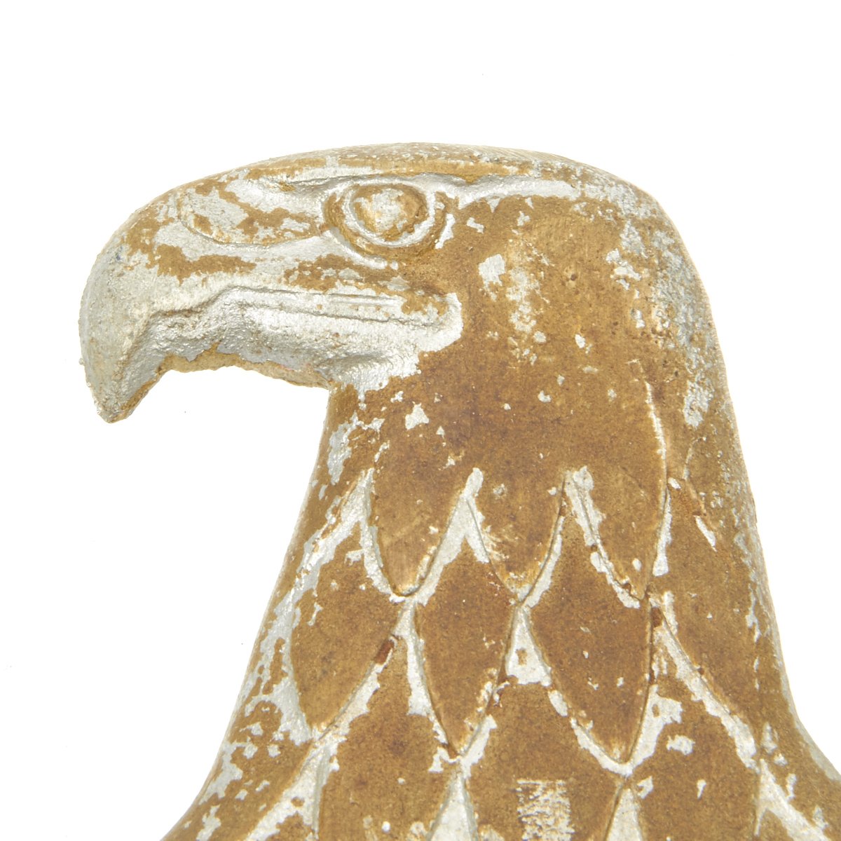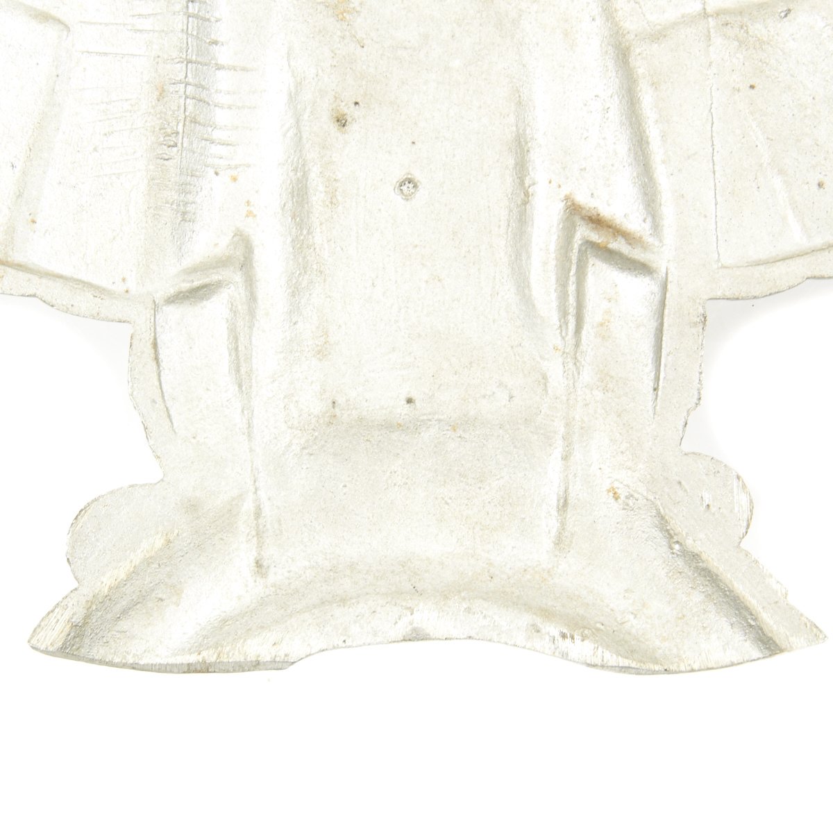 Finally, one of the most important traits to the identification of a 3rd Reich railroad eagle, is to look for the evidence of hand filing or grinding that is usually found around the perimeter edges of these plaques. This was performed to d-bur and smooth the outline of the eagle, after it was removed from the manufacturing mold. The area that is most noticeable of this hand filing is the upper wing ridge which runs tip to tip, across the top of the entire wingspan. At times, even the top of the eagle’s head area will show course grinding marks also. This hand filing and grinding can actually can give the metal a squared off shape, as opposed to being round. Look for evidence of hand finishing, it can be an important tool in identification.