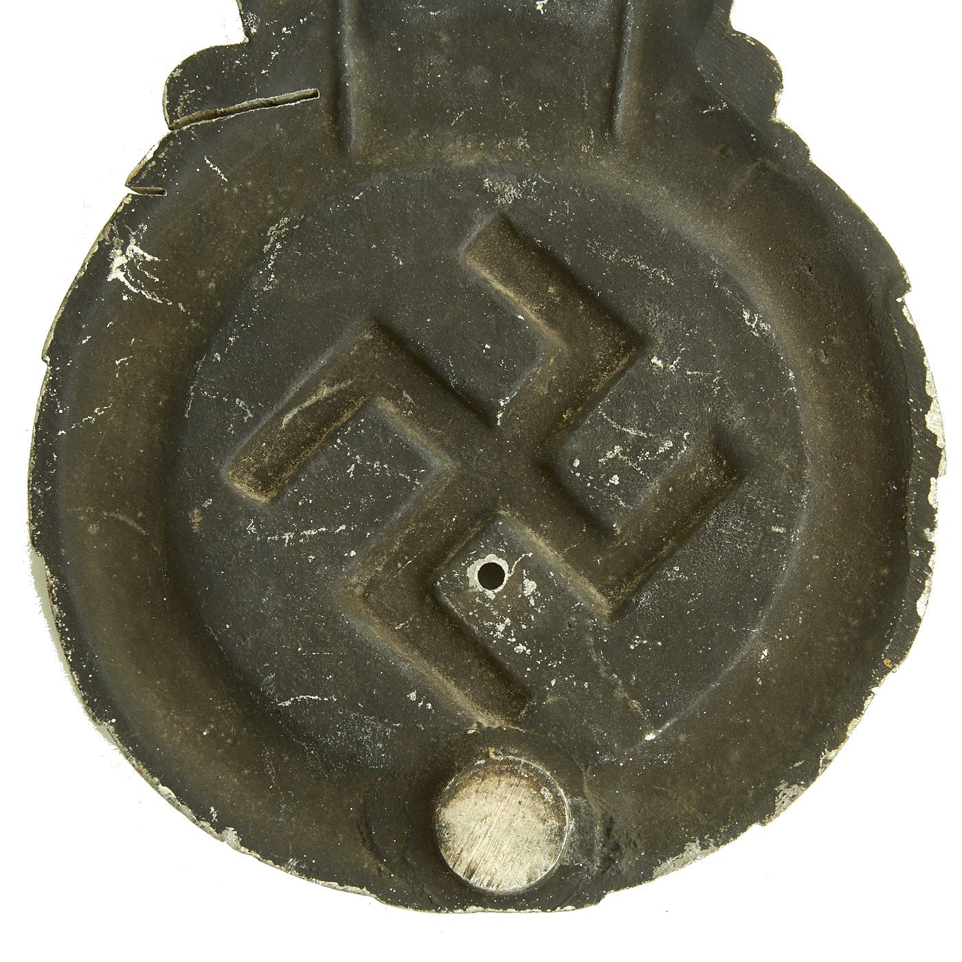 When inspecting a railroad eagle for authenticity, a collector will normally examine the obverse striking pose of the eagle perched proudly on a ring of oak leaves, superimposed swas, and outstretched wings. With a period manufactured eagle, we see a nice 3 dimensional bird cast in a relatively smooth natural aluminum finish. The fact that these eagles were the result of being produced from a mold, a collector may observe slight flaws in the metal surface in different areas of the plaque. Minor pock marks and residual metal that may have become trapped in the mold, could exhibit additional imperfections. Occasionally this has caused collectors to become overly concerned that the prized railroad eagle in their collection, is a reproduction. Be rest assured that not all of these eagles were cast with exact precision of flawlessness. If an eagle were to exhibit such gross flaws such as large scale porosity, missing or incomplete feather features, or a gritty rough surface throughout, this would raise a red flag of concern. For the majority of railroad eagles produced during the 3rd Reich, these hand polished eagles will exhibit a smooth obverse, and void of rough edges when you run your hand around all of the surfaces of the plaque. Bear in mind that if a railroad eagle was exposed to weather elements, or submerged in soil or water, this very well could affect metal and the appearance of how it now looks.