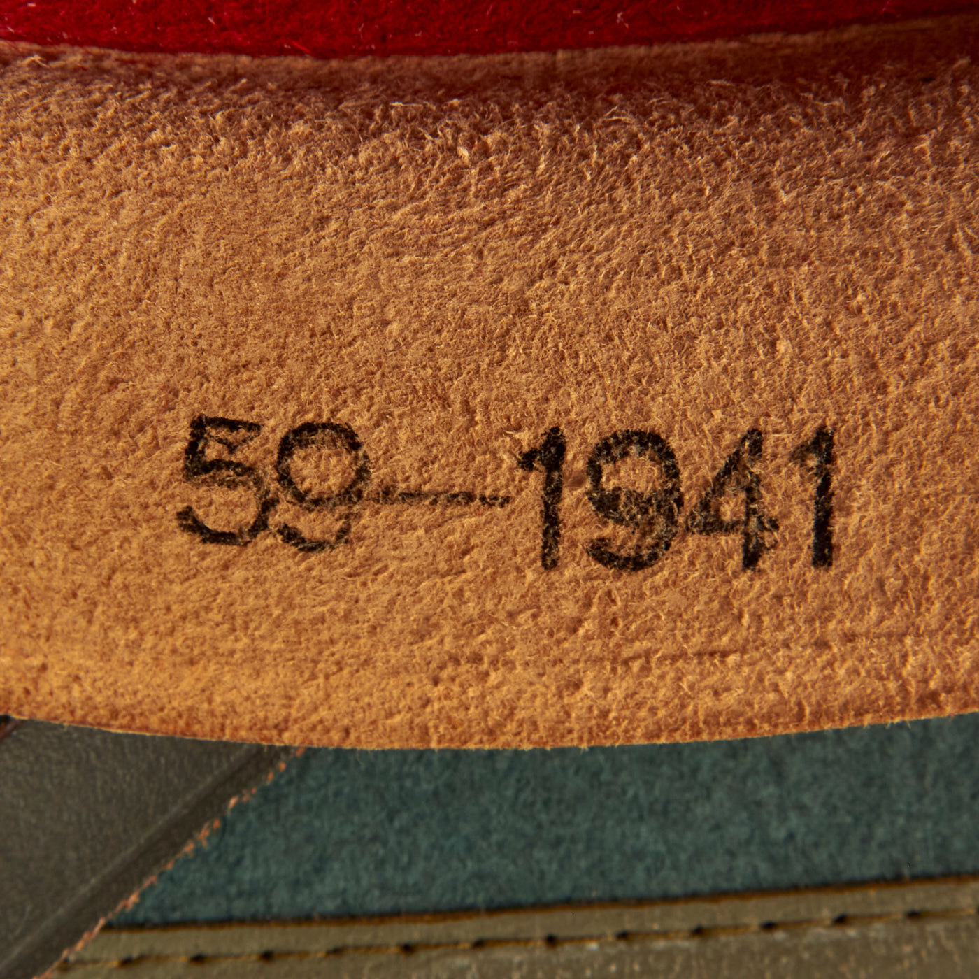 The interior of the helmet still has the original green felt covering intact. The leather liner itself is in excellent condition and supple. It is embossed with JHS and the underside of the sweatband is marked size 59 with a 1941 date. It also has some post war stamps such as GERMANY on sweatband, from when many of these were exported as surplus after the war. The red felt inner lining is near perfect. Really a great barely used example of this type of helmet.