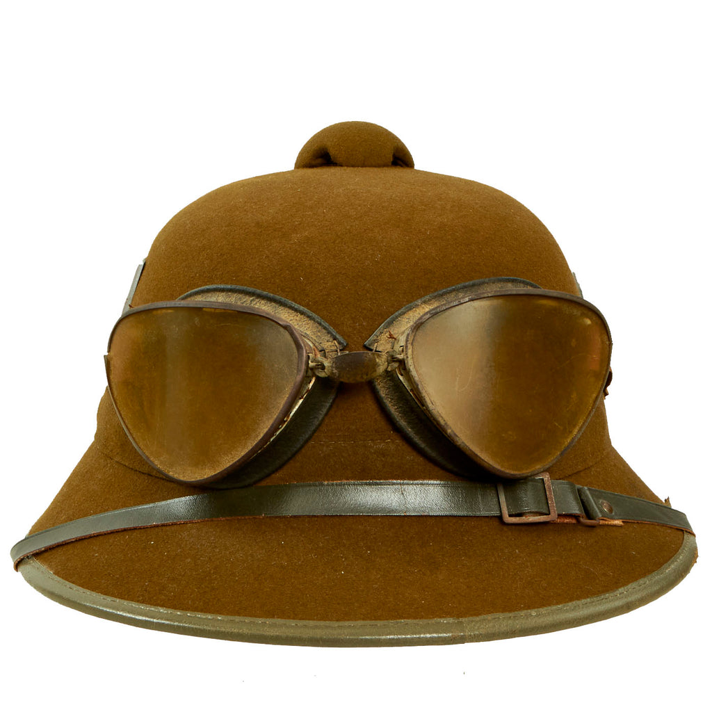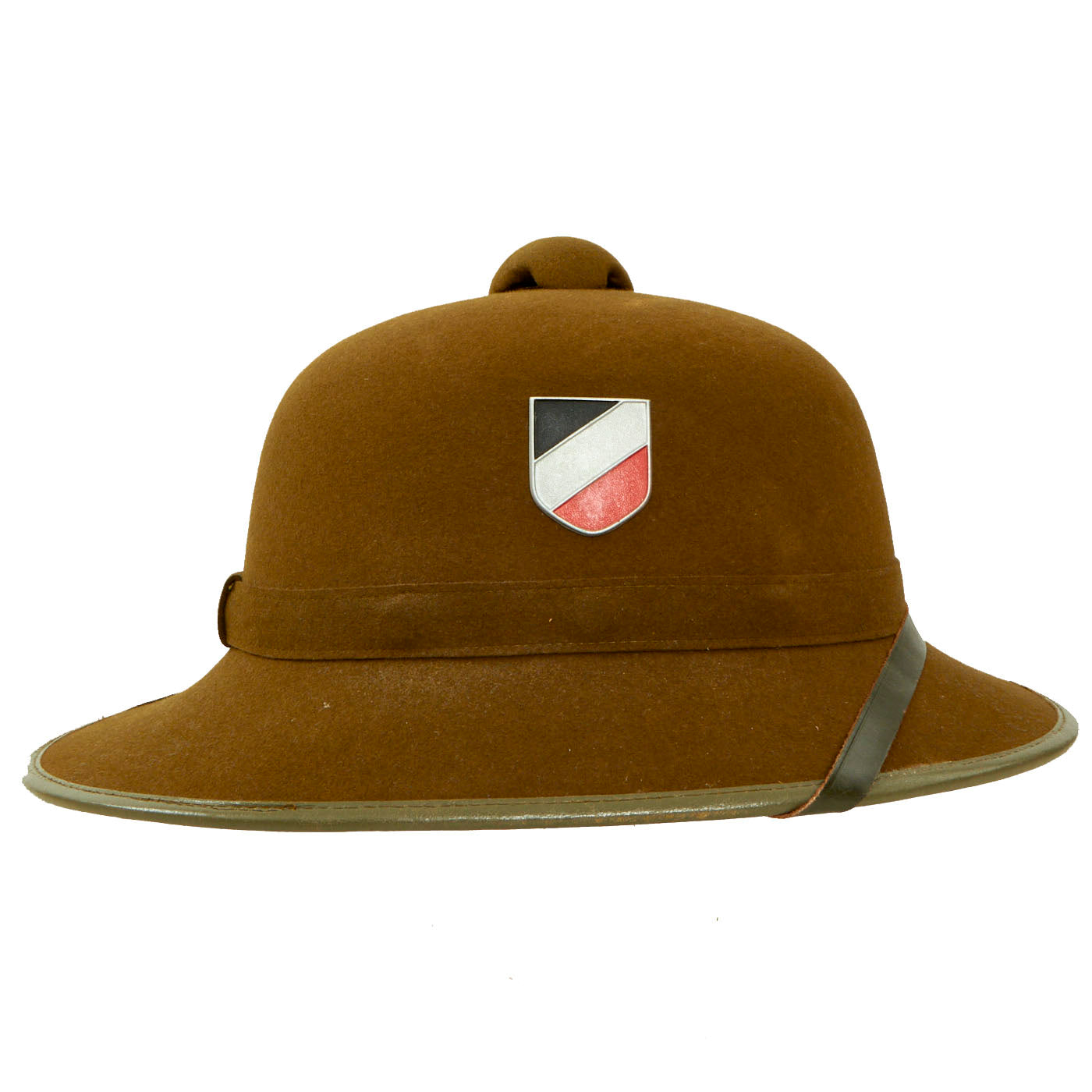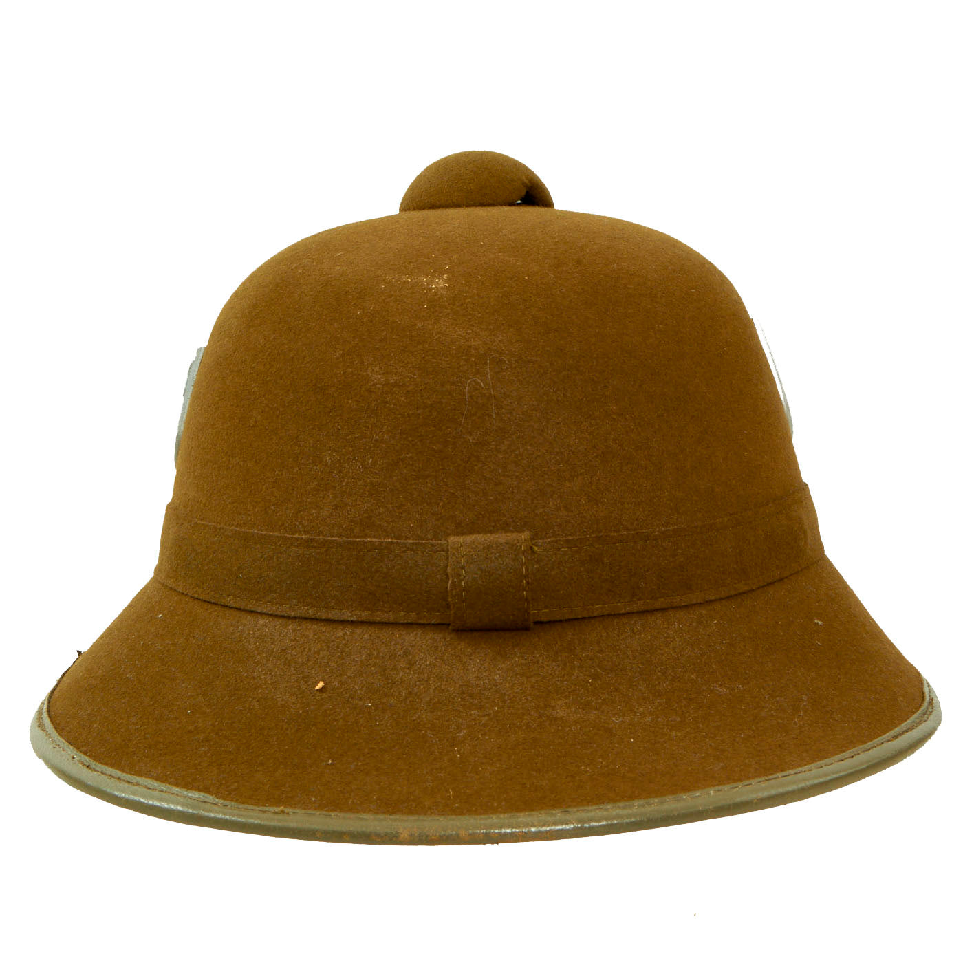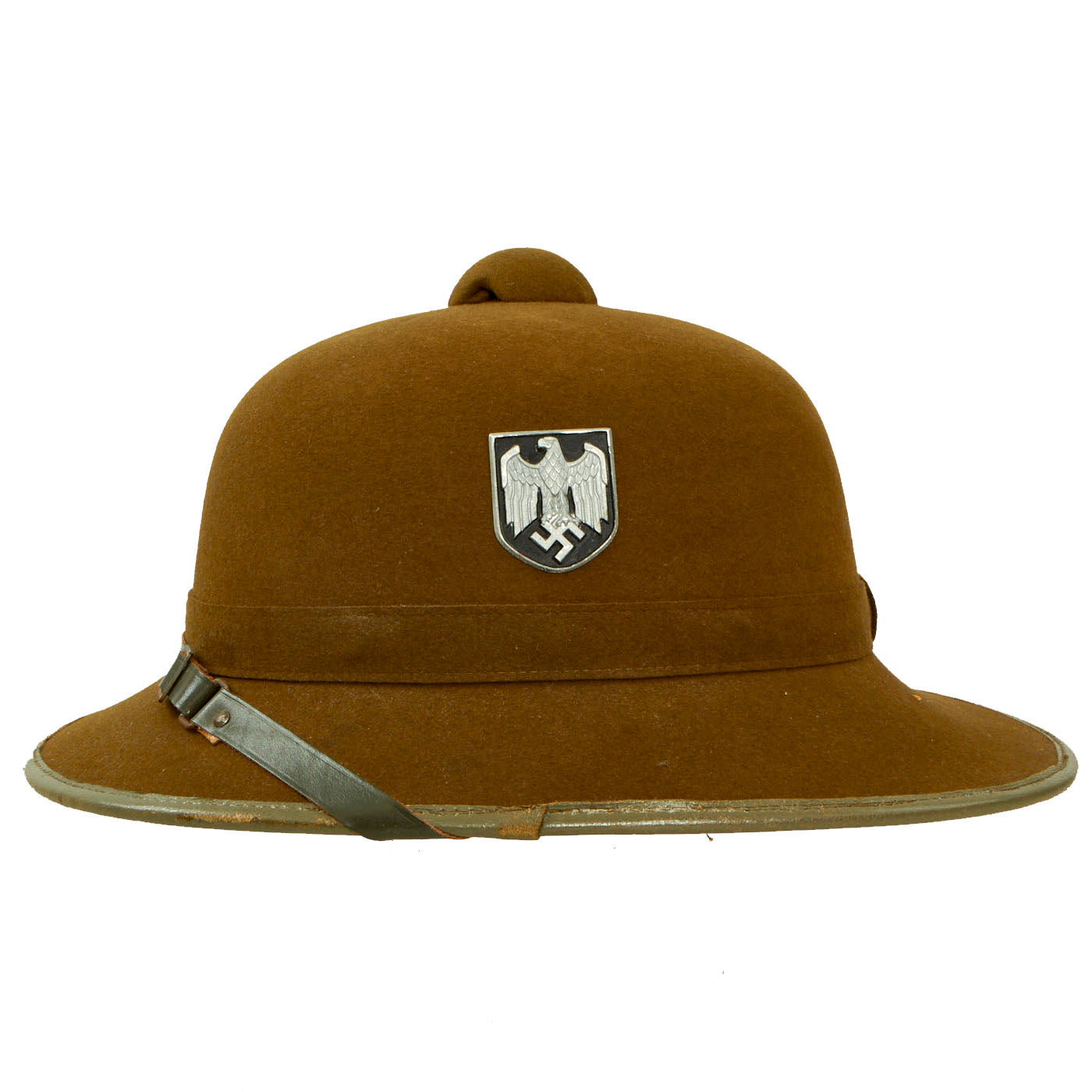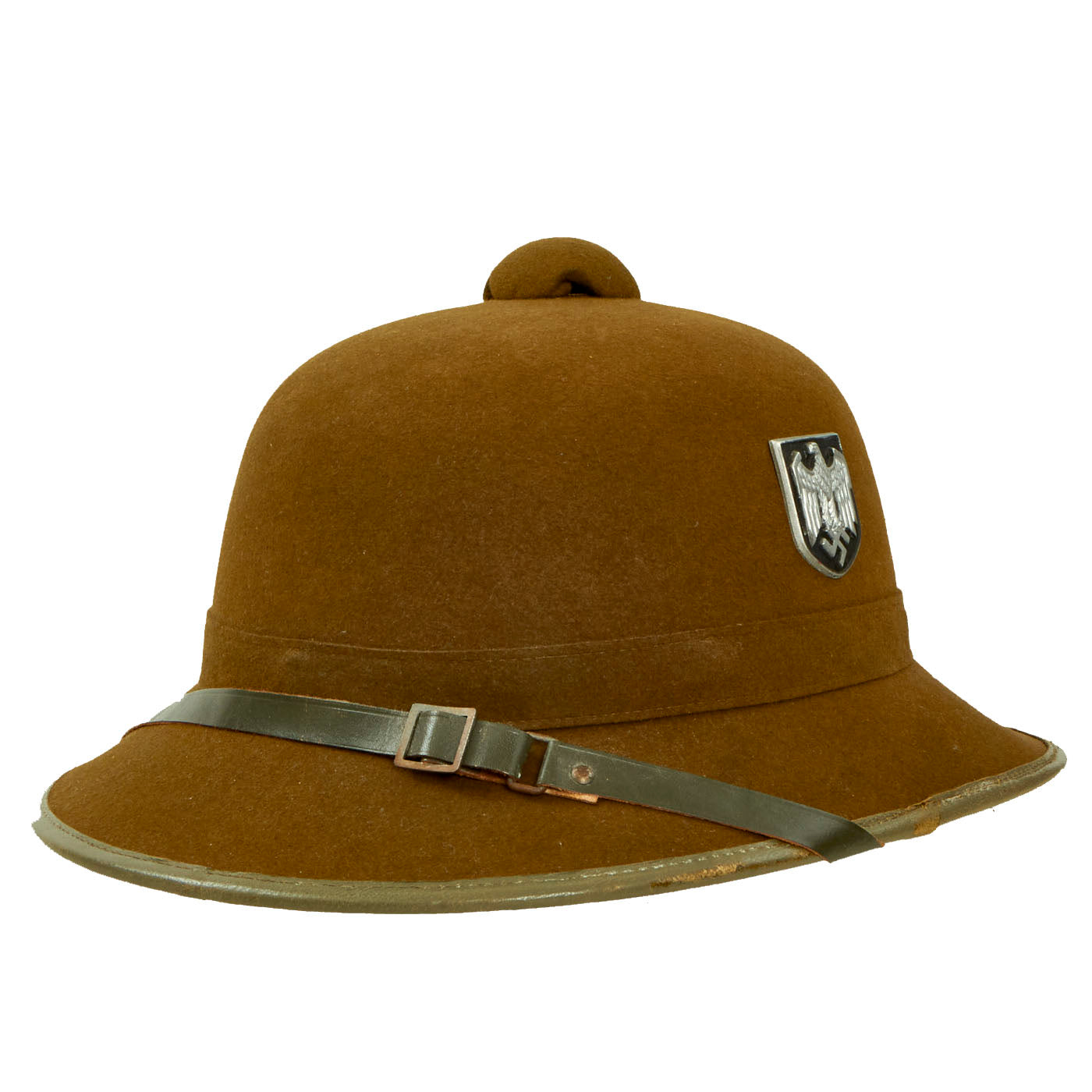 Original Item: On first deployment to North Africa in 1941, Afrikakorps infantry were issued with the traditional European sun helmet known as Tropische Kopfbedeckung (Tropical headgear), of the type known to the British forces as the solar topi (or topee). In the German case, these were made of pith, had prominent ventilation holes in the crown, were khaki in color and bore two metal shields; on the right the national colors and on the left the German eagle. There were several models made, with the first having cotton outer covering made of fabric sewn together. This is the second model, with a felt covering.
