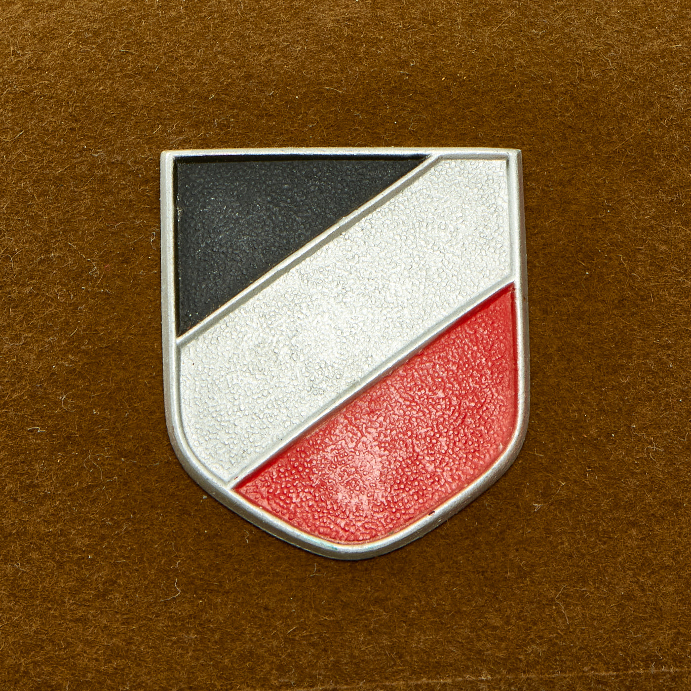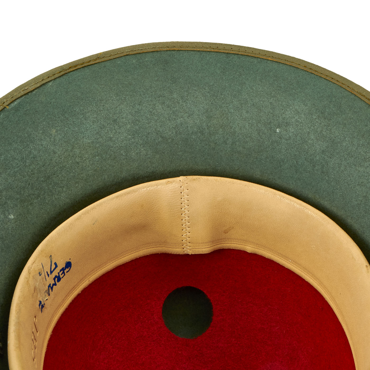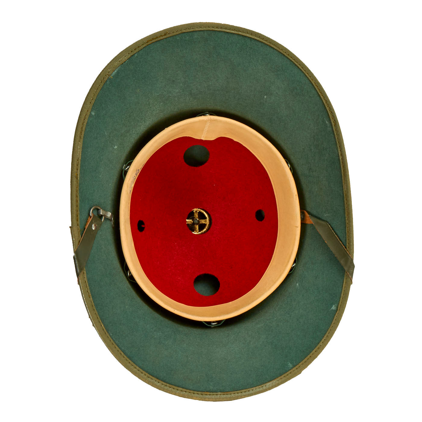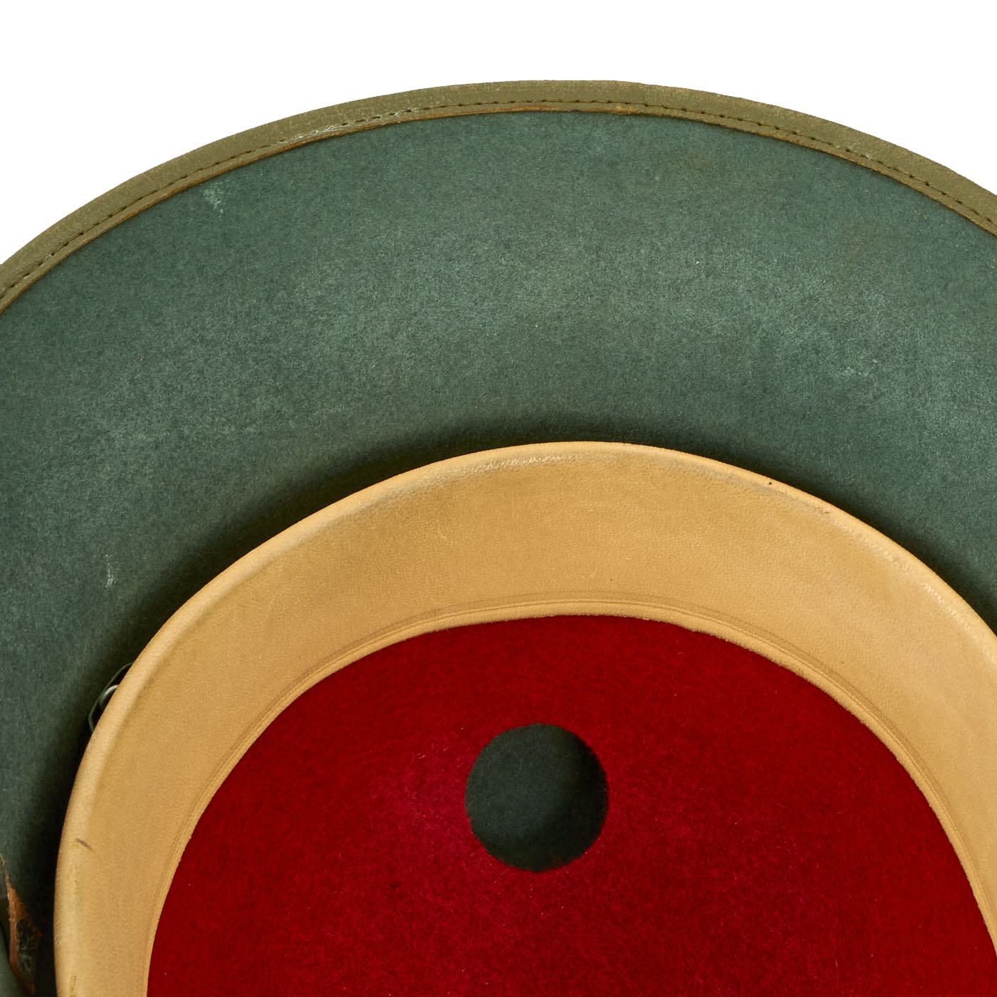 This particular example is in fantastic near mint condition, with all parts intact and in great shape, with little sign of abuse or major wear. The original olive/khaki felt covering is completely intact, and retains its original color well. The helmet band, which hides the attachment rivets for the chin strap and liner, is in excellent condition as well. The original chin strap is fully intact and supple, almost no finish wear. The green leather trim is slightly worn on the edges from many years of storage. The two aluminum badges are intact and retain most of their original paint.