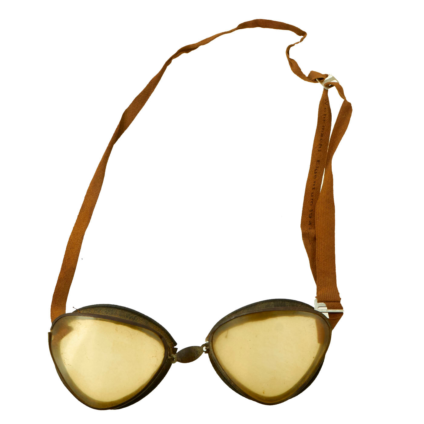 Also included is a lovely pair of “sun and dust” goggles, for that classic look! These are real German WWII issue, and are marked Wehrmacht Eigentum 1943 (Property of the Wehrmacht) on the strap. They do not show much use, however the plastic of the lenses has deteriorated a bit. Also, the elastic in the securing strap is almost completely gone, so it has stretched out quite a bit.
