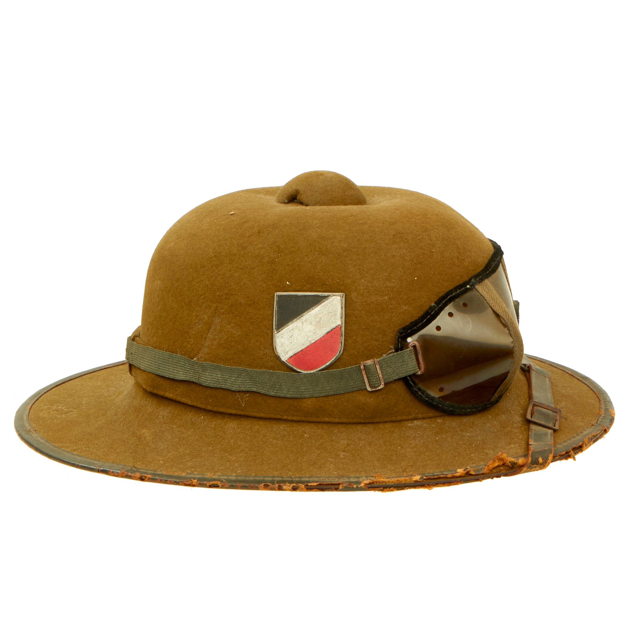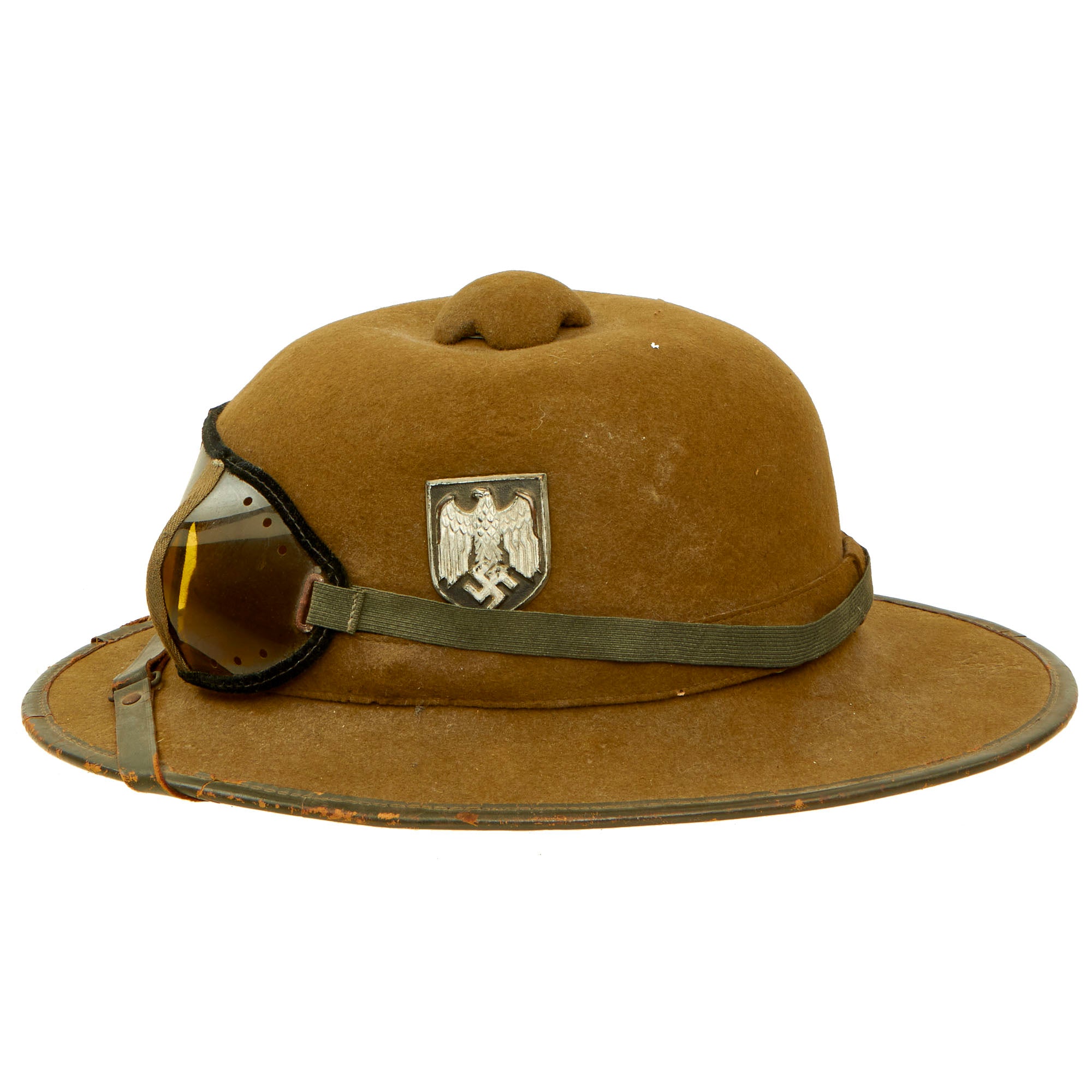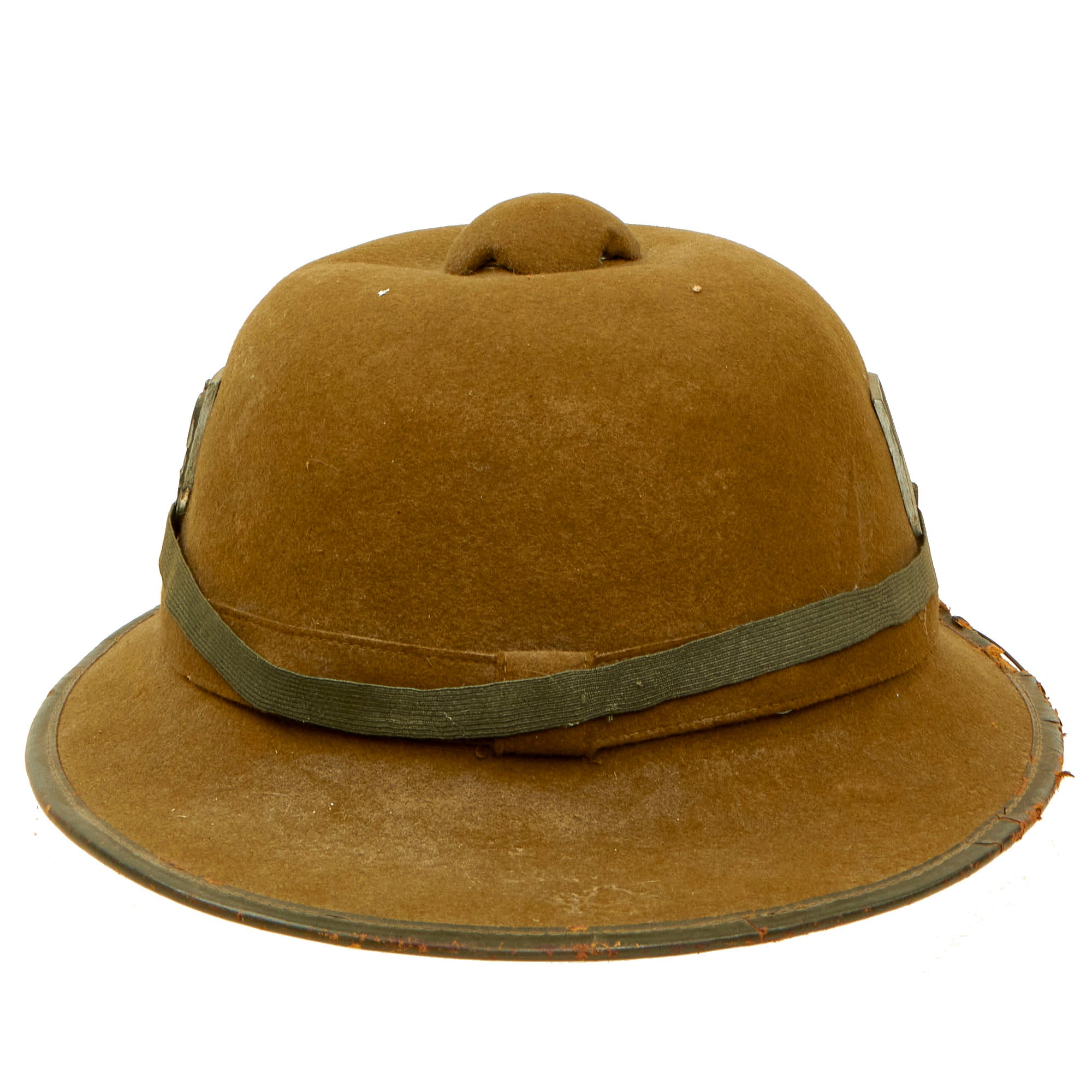Original Item: On first deployment to North Africa in 1941, Afrikakorps infantry were issued with the traditional European sun helmet known as Tropische Kopfbedeckung (Tropical headgear), of the type known to the British forces as the solar topi (or topee). In the German case, these were made of pith, had prominent ventilation holes in the crown, were khaki in color and bore two metal shields; on the right the national colors and on the left the German eagle. There were several models made, with the first having cotton outer covering made of fabric sewn together. This is the second model, with a felt covering.
